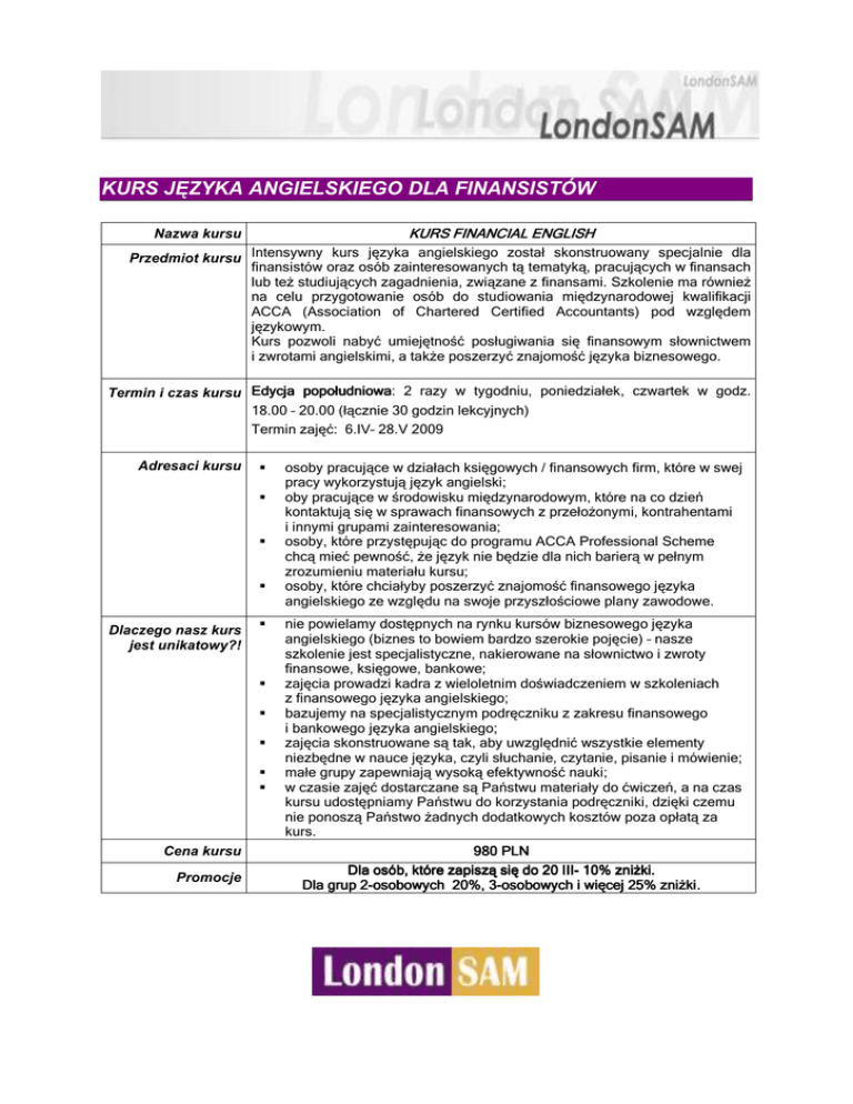 KURS JĘZYKA ANGIELSKIEGO DLA FINANSISTÓW KURS FINANCIAL ENGLISH Nazwa kursu Przedmiot kursu Intensywny kurs języka angielskiego został skonstruowany specjalnie dla finansistów oraz osób zainteresowanych tą tematyką, pracujących w finansach lub też studiujących zagadnienia, związane z finansami. Szkolenie ma również na celu przygotowanie osób do studiowania międzynarodowej kwalifikacji ACCA (Association of Chartered Certified Accountants) pod względem językowym. Kurs pozwoli nabyć umiejętność posługiwania się finansowym słownictwem i zwrotami angielskimi, a także poszerzyć znajomość języka biznesowego. popołudniowa 2 razy w tygodniu, poniedziałek, czwartek w godz. Termin i czas kursu Edycja popołudniowa: 18.00 – 20.00 (łącznie 30 godzin lekcyjnych) Termin zajęć: 6.IV– 28.V 2009 Adresaci kursu Dlaczego nasz kurs jest unikatowy?! Cena kursu Promocje osoby pracujące w działach księgowych / finansowych firm, które w swej pracy wykorzystują język angielski; oby pracujące w środowisku międzynarodowym, które na co dzień kontaktują się w sprawach finansowych z przełożonymi, kontrahentami i innymi grupami zainteresowania; osoby, które przystępując do programu ACCA Professional Scheme chcą mieć pewność, że język nie będzie dla nich barierą w pełnym zrozumieniu materiału kursu; osoby, które chciałyby poszerzyć znajomość finansowego języka angielskiego ze względu na swoje przyszłościowe plany zawodowe. nie powielamy dostępnych na rynku kursów biznesowego języka angielskiego (biznes to bowiem bardzo szerokie pojęcie) – nasze szkolenie jest specjalistyczne, nakierowane na słownictwo i zwroty finansowe, księgowe, bankowe; zajęcia prowadzi kadra z wieloletnim doświadczeniem w szkoleniach z finansowego języka angielskiego; bazujemy na specjalistycznym podręczniku z zakresu finansowego i bankowego języka angielskiego; zajęcia skonstruowane są tak, aby uwzględnić wszystkie elementy niezbędne w nauce języka, czyli słuchanie, czytanie, pisanie i mówienie; małe grupy zapewniają wysoką efektywność nauki; w czasie zajęć dostarczane są Państwu materiały do ćwiczeń, a na czas kursu udostępniamy Państwu do korzystania podręczniki, dzięki czemu nie ponoszą Państwo żadnych dodatkowych kosztów poza opłatą za kurs. 980 PLN Dla osób, które zapiszą się do 20 IIIIII- 10% zniżki. Dla grup 22-osobowych 20%, 20%, 33-osobowych i więcej 25% zniżki. zniżki.