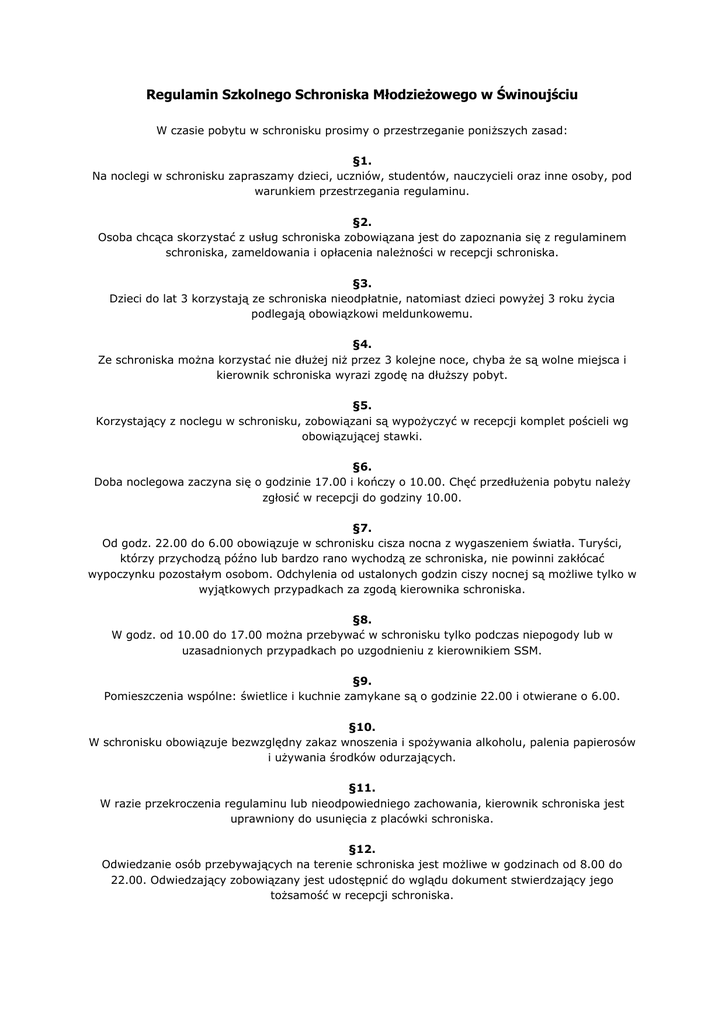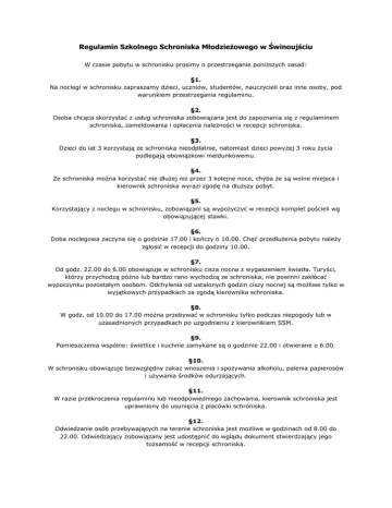Regulamin Szkolnego Schroniska Młodzieżowego w Świnoujściu W czasie pobytu w schronisku prosimy o przestrzeganie poniższych zasad: §1. Na noclegi w schronisku zapraszamy dzieci, uczniów, studentów, nauczycieli oraz inne osoby, pod warunkiem przestrzegania regulaminu. §2. Osoba chcąca skorzystać z usług schroniska zobowiązana jest do zapoznania się z regulaminem schroniska, zameldowania i opłacenia należności w recepcji schroniska. §3. Dzieci do lat 3 korzystają ze schroniska nieodpłatnie, natomiast dzieci powyżej 3 roku życia podlegają obowiązkowi meldunkowemu. §4. Ze schroniska można korzystać nie dłużej niż przez 3 kolejne noce, chyba że są wolne miejsca i kierownik schroniska wyrazi zgodę na dłuższy pobyt. §5. Korzystający z noclegu w schronisku, zobowiązani są wypożyczyć w recepcji komplet pościeli wg obowiązującej stawki. §6. Doba noclegowa zaczyna się o godzinie 17.00 i kończy o 10.00. Chęć przedłużenia pobytu należy zgłosić w recepcji do godziny 10.00. §7. Od godz. 22.00 do 6.00 obowiązuje w schronisku cisza nocna z wygaszeniem światła. Turyści, którzy przychodzą późno lub bardzo rano wychodzą ze schroniska, nie powinni zakłócać wypoczynku pozostałym osobom. Odchylenia od ustalonych godzin ciszy nocnej są możliwe tylko w wyjątkowych przypadkach za zgodą kierownika schroniska. §8. W godz. od 10.00 do 17.00 można przebywać w schronisku tylko podczas niepogody lub w uzasadnionych przypadkach po uzgodnieniu z kierownikiem SSM. §9. Pomieszczenia wspólne: świetlice i kuchnie zamykane są o godzinie 22.00 i otwierane o 6.00. §10. W schronisku obowiązuje bezwzględny zakaz wnoszenia i spożywania alkoholu, palenia papierosów i używania środków odurzających. §11. W razie przekroczenia regulaminu lub nieodpowiedniego zachowania, kierownik schroniska jest uprawniony do usunięcia z placówki schroniska. §12. Odwiedzanie osób przebywających na terenie schroniska jest możliwe w godzinach od 8.00 do 22.00. Odwiedzający zobowiązany jest udostępnić do wglądu dokument stwierdzający jego tożsamość w recepcji schroniska. §13. W schronisku obowiązuje samoobsługa - goście zobowiązani są do zachowania porządku. W dniu wyjazdu należy odnieść bieliznę pościelową do kosza z brudną pościelą oraz wyrzucić posegregowane śmieci do odpowiednich pojemników przy bramie wjazdowej. §14. Wszelkie zniszczenia i uszkodzenia przedmiotów stanowiących własność schroniska należy zgłaszać kierownikowi schroniska (lub dyżurującemu recepcjoniście), który określa wysokość odszkodowania. §15. Osoby posiadające pojazdy i korzystające z parkingu schroniska winny zapłacić opłatę parkingową w recepcji. §16. Rezerwując noclegi w SSM w Świnoujściu należy złożyć przynajmniej miesiąc przed przybyciem zamówienie faxem, e-mailem lub pocztą. W zamówieniu podajemy dokładny termin, nazwisko, imię, adres, nr telefonu kontaktowego. W przypadku grup również liczbę i płeć uczestników oraz adres szkoły. Po uzyskaniu zgody na proponowany termin należy przesłać zadatek na podane konto. W przypadku rezygnacji z zarezerwowanych noclegów, zgłoszonej na piśmie i doręczonej do schroniska, zwrotowi podlega kwota zadatku pomniejszona o poniższe opłaty: - rezygnacja na więcej niż 14 dni przed terminem przyjazdu - 50 % wpłaconego zadatku - na mniej niż 14 dni, całość kwoty zadatku zostanie zachowana przez Szkolne Schronisko Młodzieżowe w Świnoujściu. Przy zwrocie za pośrednictwem poczty lub banku, zwracana kwota jest pomniejszana o koszty operacji.