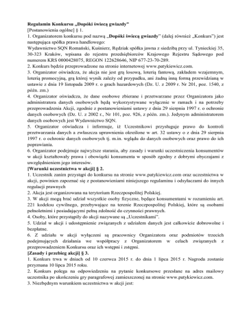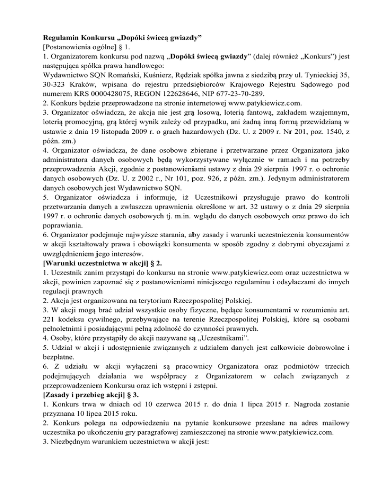 Regulamin Konkursu „Dopóki świecą gwiazdy” [Postanowienia ogólne] § 1. 1. Organizatorem konkursu pod nazwą „Dopóki świecą gwiazdy” (dalej również „Konkurs”) jest następująca spółka prawa handlowego: Wydawnictwo SQN Romański, Kuśnierz, Rędziak spółka jawna z siedzibą przy ul. Tynieckiej 35, 30-323 Kraków, wpisana do rejestru przedsiębiorców Krajowego Rejestru Sądowego pod numerem KRS 0000428075, REGON 122628646, NIP 677-23-70-289. 2. Konkurs będzie przeprowadzone na stronie internetowej www.patykiewicz.com. 3. Organizator oświadcza, że akcja nie jest grą losową, loterią fantową, zakładem wzajemnym, loterią promocyjną, grą której wynik zależy od przypadku, ani żadną inną formą przewidzianą w ustawie z dnia 19 listopada 2009 r. o grach hazardowych (Dz. U. z 2009 r. Nr 201, poz. 1540, z późn. zm.) 4. Organizator oświadcza, że dane osobowe zbierane i przetwarzane przez Organizatora jako administratora danych osobowych będą wykorzystywane wyłącznie w ramach i na potrzeby przeprowadzenia Akcji, zgodnie z postanowieniami ustawy z dnia 29 sierpnia 1997 r. o ochronie danych osobowych (Dz. U. z 2002 r., Nr 101, poz. 926, z późn. zm.). Jedynym administratorem danych osobowych jest Wydawnictwo SQN. 5. Organizator oświadcza i informuje, iż Uczestnikowi przysługuje prawo do kontroli przetwarzania danych a zwłaszcza uprawnienia określone w art. 32 ustawy o z dnia 29 sierpnia 1997 r. o ochronie danych osobowych tj. m.in. wglądu do danych osobowych oraz prawo do ich poprawiania. 6. Organizator podejmuje najwyższe starania, aby zasady i warunki uczestniczenia konsumentów w akcji kształtowały prawa i obowiązki konsumenta w sposób zgodny z dobrymi obyczajami z uwzględnieniem jego interesów. [Warunki uczestnictwa w akcji] § 2. 1. Uczestnik zanim przystąpi do konkursu na stronie www.patykiewicz.com oraz uczestnictwa w akcji, powinien zapoznać się z postanowieniami niniejszego regulaminu i odsyłaczami do innych regulacji prawnych 2. Akcja jest organizowana na terytorium Rzeczpospolitej Polskiej. 3. W akcji mogą brać udział wszystkie osoby fizyczne, będące konsumentami w rozumieniu art. 221 kodeksu cywilnego, przebywające na terenie Rzeczpospolitej Polskiej, które są osobami pełnoletnimi i posiadającymi pełną zdolność do czynności prawnych. 4. Osoby, które przystąpiły do akcji nazywane są „Uczestnikami”. 5. Udział w akcji i udostępnienie związanych z udziałem danych jest całkowicie dobrowolne i bezpłatne. 6. Z udziału w akcji wyłączeni są pracownicy Organizatora oraz podmiotów trzecich podejmujących działania we współpracy z Organizatorem w celach związanych z przeprowadzeniem Konkursu oraz ich wstępni i zstępni. [Zasady i przebieg akcji] § 3. 1. Konkurs trwa w dniach od 10 czerwca 2015 r. do dnia 1 lipca 2015 r. Nagroda zostanie przyznana 10 lipca 2015 roku. 2. Konkurs polega na odpowiedzeniu na pytanie konkursowe przesłane na adres mailowy uczestnika po ukończeniu gry paragrafowej zamieszczonej na stronie www.patykiewicz.com. 3. Niezbędnym warunkiem uczestnictwa w akcji jest: - wypełnienie formularza po ukończeniu gry paragrafowej będącej częścią strony www.patykiewicz.com - udzielenie odpowiedzi na pytanie konkursowe wysłane drogą mailową do uczestnika. 4. Każdy uczestnik może wysłać tylko jedną odpowiedź na pytanie konkursowe. 5. Niedopuszczalne jest podejmowanie przez Uczestników działań sprzecznych z prawem oraz dobrymi obyczajami. 6. W celu opublikowania na stronie www.patykiewicz.com wyników Konkursu, Uczestnicy wyrażają zgodę na wskazanie laureatów Konkursu w następujący sposób: imię i odpowiedź. [Wyłonienie zwycięzcy i nagrody] § 4. 1. Zgłoszenia konkursowe, w szczególności odpowiedzi na pytanie konkursowe, będą oceniane przez Komisję konkursową złożoną z przedstawicieli Organizatora według ściśle określonych kryteriów. 2. Komisja konkursowa, przyznając nagrody i wybierając laureatów na posiedzeniu tajnym, weźmie pod uwagę (i) oryginalność (ii) jakość językową oraz (iii) jakoś merytoryczną. 3. Wyniki Konkursu zostaną ogłoszone na stronie www.patykiewicz.com 10 lipca. Ponadto laureaci zostaną bezpośrednio zawiadomieni o przyznaniu nagrody na podany podczas rejestracji adres e-mail. 4. Decyzja Komisji konkursowej jest ostateczna i nie podlega weryfikacji. 5. Nagroda zostanie przyznana w następujący sposób: laureat, którego odpowiedź konkursowa spełni kryteria tj. zostanie uznana przez komisję konkursową za najbardziej oryginalną oraz na najwyższym poziomie pod względem merytorycznym i językowym otrzyma specjalnie przygotowany nóż myśliwski, utrzymany w konwencji postapo. 6. Nagroda zostanie wysłana do laureata do dwóch dni roboczych po otrzymaniu pełnych danych teleadresowych (imię, nazwisko, ulica, nr domu i mieszkania, kod pocztowy, miejscowość oraz numer telefonu). Organizator nie ma obowiązku wysłania paczki poza granice Polski. 7. Uczestnicy akcji wyrażają zgodę na nieodpłatne publikowanie w całości, w części lub w formie skróconej, odpowiedzi na pytanie konkursowe na stronach należących do Organizatora wraz z imieniem uczestnika, a także profilu Organizatora w mediach społecznościowych. 8. Uczestnik przyjmuje do wiadomości, że wydanie nagrody podlega następującym warunkom: a) nagroda nie może zostać zastąpiona inną ekwiwalentną nagrodą. 9. Osobą do kontaktu w sprawie nagród jest Oskar Grzelak, e-mail: [email protected]. 10. Organizator zastrzega sobie prawo do odwołania akcji w przypadku, gdy jakość zgłoszeń będzie niewystarczająca do wyłonienia laureata. [Prawa autorskie] § 5. 1. Uczestnik przystępując do akcji zgadza się z tym, że odpowiedź na pytanie konkursowe nie może naruszać przepisów powszechnie obowiązującego prawa oraz dobrych obyczajów jak również autorskich praw majątkowych i osobistych osób trzecich. 2. Z chwilą wydania nag