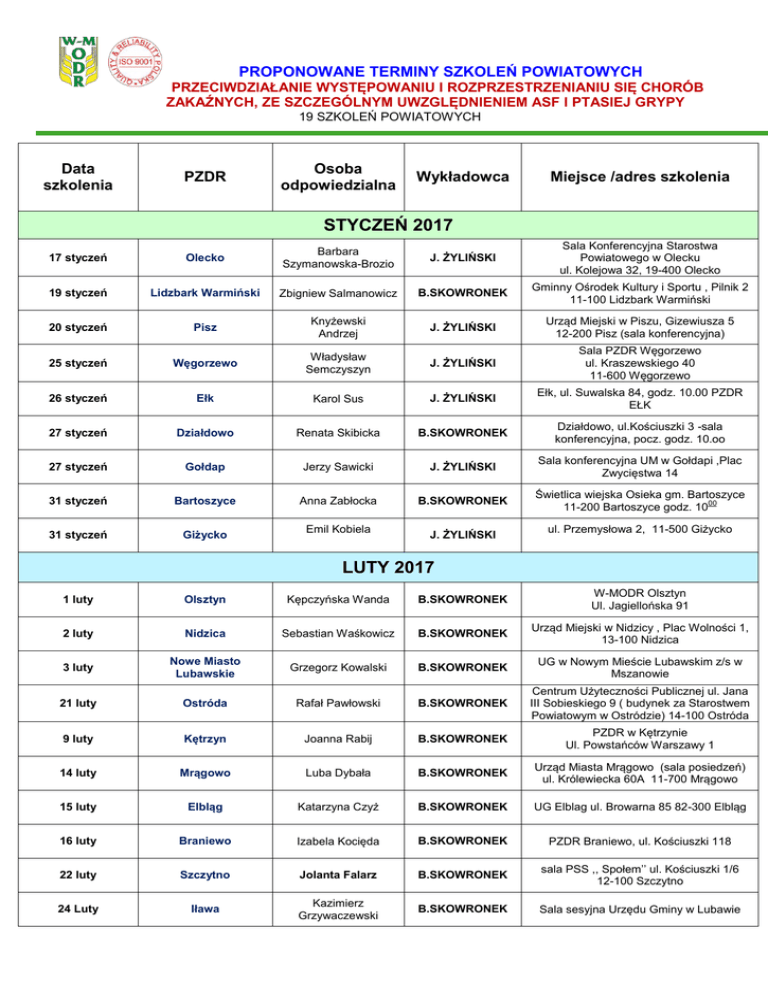 PROPONOWANE TERMINY SZKOLEŃ POWIATOWYCH PRZECIWDZIAŁANIE WYSTĘPOWANIU I ROZPRZESTRZENIANIU SIĘ CHORÓB ZAKAŹNYCH, ZE SZCZEGÓLNYM UWZGLĘDNIENIEM ASF I PTASIEJ GRYPY 19 SZKOLEŃ POWIATOWYCH Data szkolenia PZDR Osoba odpowiedzialna Wykładowca Miejsce /adres szkolenia STYCZEŃ 2017 17 styczeń Olecko Barbara Szymanowska-Brozio J. ŻYLIŃSKI Sala Konferencyjna Starostwa Powiatowego w Olecku ul. Kolejowa 32, 19-400 Olecko 19 styczeń Lidzbark Warmiński Zbigniew Salmanowicz B.SKOWRONEK Gminny Ośrodek Kultury i Sportu , Pilnik 2 11-100 Lidzbark Warmiński 20 styczeń Pisz Knyżewski Andrzej J. ŻYLIŃSKI Urząd Miejski w Piszu, Gizewiusza 5 12-200 Pisz (sala konferencyjna) 25 styczeń Węgorzewo Władysław Semczyszyn J. ŻYLIŃSKI Sala PZDR Węgorzewo ul. Kraszewskiego 40 11-600 Węgorzewo 26 styczeń Ełk Karol Sus J. ŻYLIŃSKI Ełk, ul. Suwalska 84, godz. 10.00 PZDR EŁK 27 styczeń Działdowo Renata Skibicka B.SKOWRONEK Działdowo, ul.Kościuszki 3 -sala konferencyjna, pocz. godz. 10.oo 27 styczeń Gołdap Jerzy Sawicki J. ŻYLIŃSKI Sala konferencyjna UM w Gołdapi ,Plac Zwycięstwa 14 31 styczeń Bartoszyce Anna Zabłocka B.SKOWRONEK Świetlica wiejska Osieka gm. Bartoszyce 00 11-200 Bartoszyce godz. 10 31 styczeń Giżycko Emil Kobiela J. ŻYLIŃSKI ul. Przemysłowa 2, 11-500 Giżycko LUTY 2017 1 luty Olsztyn Kępczyńska Wanda B.SKOWRONEK W-MODR Olsztyn Ul. Jagiellońska 91 2 luty Nidzica Sebastian Waśkowicz B.SKOWRONEK Urząd Miejski w Nidzicy , Plac Wolności 1, 13-100 Nidzica 3 luty Nowe Miasto Lubawskie Grzegorz Kowalski B.SKOWRONEK UG w Nowym Mieście Lubawskim z/s w Mszanowie 21 luty Ostróda Rafał Pawłowski B.SKOWRONEK Centrum Użyteczności Publicznej ul. Jana III Sobieskiego 9 ( budynek za Starostwem Powiatowym w Ostródzie) 14-100 Ostróda 9 luty Kętrzyn Joanna Rabij B.SKOWRONEK PZDR w Kętrzynie Ul. Powstańców Warszawy 1 14 luty Mrągowo Luba Dybała B.SKOWRONEK Urząd Miasta Mrągowo (sala posiedzeń) ul. Królewiecka 60A 11-700 Mrągowo 15 luty Elbląg Katarzyna Czyż B.SKOWRONEK UG Elblag ul. Browarna 85 82-300 Elbląg 16 luty Braniewo Izabela Kocięda B.SKOWRONEK PZDR Braniewo, ul. Kościuszki 118 22 luty Szczytno Jolanta Falarz B.SKOWRONEK sala PSS ,, Społem’’ ul. Kościuszki 1/6 12-100 Szczytno 24 Luty Iława Kazimierz Grzywaczewski B.SKOWRONEK Sala sesyjna Urzędu Gminy w Lubawie