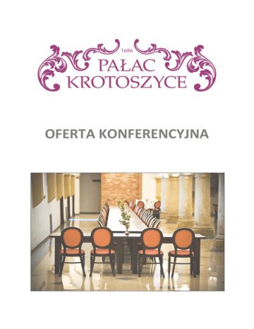 OFERTA KONFERENCYJNA „Pałac Krotoszyce” to XVII-wieczna posiadłośd z zabudowaniami folwarcznymi i zabytkowym, sześciohektarowym parkiem. Obiekt jest malowniczo położony w Dolinie Kaczawy. Atutem „Pałacu Krotoszyce” jest dogodne położenie - kilka kilometrów od Legnicy i autostrady A4, niedaleko drogi krajowej nr 3. W niecałą godzinę bezpiecznie i komfortowo dotrzecie Paostwo do Wrocławia. Z Krotoszyc blisko jest też do stolic naszych sąsiadów - Pragi i Berlina. Proponujemy też mało znane, ale ciche i urokliwe Pogórze i Góry Kaczawskie. Zachęcamy do zorganizowania szkolenia, konferencji, przyjęcia biznesowego, imprezy firmowej w „Pałacu Krotoszyce”. Oferujemy komfortową salę konferencyjną z profesjonalnym systemem audiowizualnym oraz niezbędnym sprzętem. W Zespole Pałacowo-Parkowym znajduje się też przestronna sala balowa oraz restauracja. Pomagamy w organizacji czasu wolnego w czasie szkolenia czy konferencji (np. nordic-walking, DJ, zespół muzyczny i inne atrakcje). Nasz obiekt oferuje możliwośd organizacji imprezy firmowej nie tylko w stylowych wnętrzach. Proponujemy także zadaszony szałas z grillem i wędzarnią. W naszym zabytkowym parku można zorganizowad imprezę plenerową dla grup liczących nawet 200 osób. Zapraszamy Paostwa do pobytu i wypoczynku w „Pałacu Krotoszyce”. Nasi pracownicy zadbają o Paostwa ciepłe przyjęcie oraz bezpieczny i komfortowy pobyt. Do Paostwa dyspozycji oddajemy bezpłatny, utwardzony i ogrodzony parking na ponad 100 samochodów. W niedalekiej przyszłości oddamy do użytku apartamenty w Pałacu, kolejne pokoje w Folwarku oraz kryty basen i gabinety SPA. Zapraszamy wszystkich Gości, którzy zamiast gwaru i zgiełku górskich kurortów, wielkich miast wolą ciszę, spokój i obcowanie z naturą. www.palackrotoszyce.pl HOTEL Naszym Gościom oddajemy komfortowe, nowocześnie urządzone pokoje. W każdym pokoju znajduje się łazienka z prysznicem, telewizor, telefon. Do dyspozycji Gości jest całodobowa recepcja. SALA BALOWO-KONFERNECYJNA Dysponujemy stylową salą balowo-konferencyjną, z zachowanymi piaskowcowymi kolumnami i sklepieniami łukowymi. Sala jest wyposażona w najwyższej klasy system audio-wideo. RESTAURACJA Zapraszamy też do czynnej codziennie restauracji. Oferujemy bogate i smaczne menu. www.palackrotoszyce.pl SALA KONFERENCYJNA Nasza sala balowo-konferencyjna ma powierzchnię 400 m2. Salę można przygotowad zależnie od potrzeb. Ustalimy z Paostwem ustawienie stołów oraz pozostałe szczegóły, istotne przy organizacji szkolenia, konferencji czy imprezy firmowej. Sala jest wyposażona w wysokiej klasy system audio-wideo. Oświetlenie sali można podzielid na trzy strefy, dodatkowo regulowad oświetlenie przy pomocy kinkietów i lamp LED w oknach – co pozwala na stworzenie odpowiedniej atmosfery, w zależności od sytuacji. CENNIK SALI KONFERENCYJNEJ Cena za 1 godzinę Minimalna kwota Dwudniowe i dłuższe szkolenia, konferencje 110 zł 400 zł Cena do negocjacji W cenie sali oferujemy następujące wyposażenie: projektor multimedialny ekran do projektora mikrofon bezprzewodowy flipchart nagłośnienie złącza 230 i 380V GASTRONOMIA Menu dopasowujemy indywidualnie do Paostwa oczekiwao. Na podstawie przesłanych przez Paostwa informacji przygotujemy smaczne propozycje, dostosowane do wielkości grupy, preferencji i budżetu. PRZYKŁADOWE CENY OFERTY GASTRONOMICZNEJ Lunch bufet Kolacja Przerwa kawowa 4 rodzaje sałatek Zupa (np. żur staropolski z białą kiełbasą i grzybami) Danie gorące (np. grillowany filet z kurczaka w sosie z pomaraoczy) 4 rodzaje sałatek Zupa (np. krem z porów z ziołami i grzankami) Danie gorące (np. wieprzowina z warzywami duszona) Kawa, herbata Woda gazowana i niegazowana Ciastka www.palackrotoszyce.pl 50-60 zł za osobę 45-55 zł za osobę 12 zł za osobę OFERTA HOTELOWA Do dyspozycji Gości oddajemy pokoje 1-, 2-, 3-osobowe. Pokoje są nowocześnie urządzone, wyposażone w telewizor i telefon oraz wygodne, funkcjonalne łazienki z prysznicami. Nocleg dla grup do 20 osób 110 zł za osobę Nocleg dla grup powyżej 20 osób 100 zł za osobę Dłuższe pobyty, większe grupy Cena do negocjacji w cenę noclegu wliczone jest śniadanie (w przypadku większych grup stół szwedzki) WARUNKI PŁATNOŚCI Rezerwację uznajemy za potwierdzoną po wpłaceniu 10% zadatku w terminie 7 dni po otrzymaniu wstępnej rezerwacji (telefonicznie, e-mailem, faxem, osobiście). Pozostałą częśd kwoty należy wpłacid najpóźniej w dniu rozpoczęcia konferencji (przelewem lub na miejscu – gotówką lub kartą). KONTAKT Pałac Krotoszyce - recepcja ul. Parkowa 3 59-223 Krotoszyce tel. 76 876 83 00 kom. 693 842 844, 609 565 797 Dyrektor Hotelu 668 381 099 e-mail: [email protected] [email protected] Przedsiębiorstwo Transportowo-Budowlane ul. Legnicka 39 59-500 Złotoryja tel. 76 878 35 02 e-mail: [email protected] Wszystkie ceny podane w ofercie są cenami brutto (stawki VAT 8% i 23%). Oferta jest ważna do 31 grudnia 2011. www.palackrotoszyce.pl