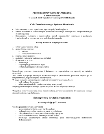 Przedmiotowy System Oceniania z zasad muzyki w klasach I i II wydziału wokalnego PSM II stopnia Cele Przedmiotowego Systemu Oceniania Informowanie ucznia o poziomie jego osiągnięć edukacyjnych Pomoc uczniowi w samodzielnym planowaniu własnego rozwoju oraz motywowanie go do dalszej pracy Dostarczanie rodzicom i nauczycielom innych przedmiotów informacji o postępach i trudnościach w uczeniu się oraz uzdolnieniach ucznia Formy oceniania osiągnięć uczniów 1. ustne wypowiedzi na lekcji 2. sprawdziany pisemne bieżące semestralne i końcowe 3. pisemne prace domowe 4. zadania i ćwiczenia wykonywane na lekcji 5. aktywność, a w tym: - frekwencja - stopień przygotowania do zajęć - systematyczne prowadzenie notatek Sprawdziany pisemne (semestralne i końcowe) są zapowiadane co najmniej na tydzień wcześniej. Jeśli uczeń z przyczyn losowych nie uczestniczył w sprawdzianie, powinien napisać go w innym terminie, uzgodnionym z nauczycielem. W ciągu semestru uczeń ma prawo zgłosić trzy nieprzygotowania. Są to: - brak zadania domowego - odmowa odpowiedzi z zakresu wiedzy teoretycznej Nieprzygotowanie powinno być zgłoszone przez ucznia na początku lekcji. Wszystkie oceny wystawiane przez nauczyciela są jawne i uzasadnione. Do oceniania stosuje się sześciostopniową skalę ocen. Szczegółowe kryteria oceniania na ocenę celującą (25 punktów) wiedza przedmiotowa i aktywność - uczeń spełnia kryteria oceny bardzo dobrej - wykazuje szczególne zainteresowanie przedmiotem - zdecydowanie wykracza poza obowiązujący program - samodzielnie i twórczo formułuje własne oceny - poszukuje dodatkowych źródeł informacji poza obowiązującymi materiałami dydaktycznymi - uczęszcza na wszystkie zajęcia na ocenę bardzo dobrą (24-21 pkt.) wiedza przedmiotowa - posiada wiedzą zgodną z treściami programowymi obowiązującymi w danej klasie - swobodnie formułuje wypowiedzi ustne posługując się pełnym zasobem terminologii przedmiotu - samodzielnie dostrzega zjawiska występujące w przykładach z literatury muzycznej - zdobytą wiedzę i umiejętności biegle stosuje w praktyce aktywność - stuprocentowa obecność na zajęciach - każdorazowe przygotowanie do lekcji w zakresie zadanego materiału - posiadanie materiałów dydaktycznych - zainteresowanie przedmiotem, czynny udział w zajęciach na ocenę dobrą (20-16 pkt.) wiedza przedmiotowa - uczeń wykazuje się dobrą orientacją w wymaganych treściach nauczania - potrafi sformułować wypowiedź ustną posługując się terminologią z niewielkimi uchybieniami - w stopniu zadowalającym stosuje w praktyce nabytą wiedzę i umiejętności - poprawnie definiuje zjawiska występujące w przykładach muzycznych aktywność - obecność na zajęciach z dopuszczalną 30% usprawiedliwioną absencją - stopień przygotowania do zajęć gwarantuje kontynuację realizowanego materiału - posiadanie materiałów pomocniczych na ocenę dostateczną (15-13 pkt.) wiedza przedmiotowa - uczeń rozumie najistotniejsze zagadnienia objęte programem nauczania - wypowiedzi ustne formułuje z pomocą nauczyciela - ma trudności z posługiwaniem się terminologią oraz definiowaniem zjawisk występujących w przykładach muzycznych - nabytą wiedzę i umiejętności stosuje w sposób ogólny i nieprecyzyjny aktywność - obecność na zajęciach z dopuszczalną 30% absencją usprawiedliwioną - zadowalające przygotowanie do zajęć umożliwiające jeszcze uczniowi rozumienie omawianych zagadnień - posiadanie materiałów pomocniczych na ocenę dopuszczającą (12-11 pkt.) wiedza przedmiotowa - uczeń posiada wyraźne braki w zakresie treści objętych minimum programowym ma trudności z formułowaniem prostych wypowiedzi posiada wyraźne braki terminologiczne ma trudności z dostrzeganiem zjawisk w przykładach z literatury muzycznej aktywność - obecność na zajęciach lekcyjnych z dopuszczalną 50% usprawiedliwioną absencją - stopień nieprzygotowania do zajęć nie gwarantuje zrozumienia zagadnień przedmiotowych na ocenę niedostateczną (10-1 pkt) - uczeń zna treści nauczania w zakresie minimum programowego nie potrafi samodzielnie formułować wypowiedzi brak realizacji programowych uniemożliwia kontynuację dalszej nauki Zasady ustalania oceny semestralnej i końcowej Ocena semestralna i końcoworoczna jest wypadkową ocen cząstkowych, na które składają się następujące działania ucznia: - zadania domowe - ustne wypowiedzi na zadany temat - pisemne sprawdziany wiedzy i umiejętności - testy obejmujące bloki programowe - aktywność Ocena semestralna może być ustalona na podstawie pisemnego sprawdzianu obejmującego treści omawiane w danym semestrze. Opracowała: Teresa Michalik