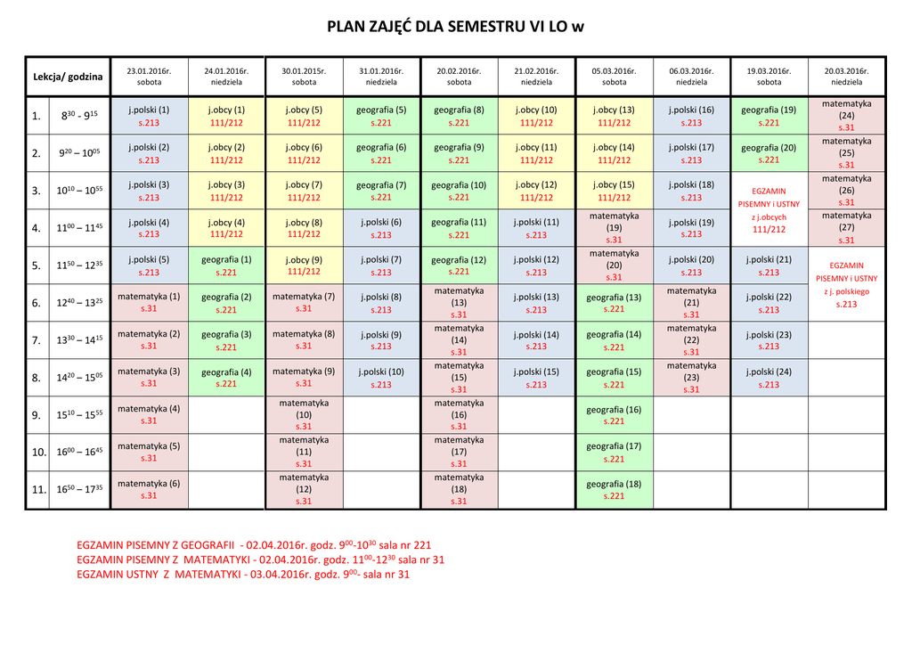 PLAN ZAJĘĆ DLA SEMESTRU VI LO w Lekcja/ godzina 23.01.2016r. sobota 24.01.2016r. niedziela 30.01.2015r. sobota 31.01.2016r. niedziela 20.02.2016r. sobota 21.02.2016r. niedziela 05.03.2016r. sobota 06.03.2016r. niedziela 19.03.2016r. sobota 1. 830 - 915 j.polski (1) s.213 j.obcy (1) 111/212 j.obcy (5) 111/212 geografia (5) s.221 geografia (8) s.221 j.obcy (10) 111/212 j.obcy (13) 111/212 j.polski (16) s.213 geografia (19) s.221 2. 920 – 1005 j.polski (2) s.213 j.obcy (2) 111/212 j.obcy (6) 111/212 geografia (6) s.221 geografia (9) s.221 j.obcy (11) 111/212 j.obcy (14) 111/212 j.polski (17) s.213 geografia (20) s.221 3. 1010 – 1055 j.polski (3) s.213 j.obcy (3) 111/212 j.obcy (7) 111/212 geografia (7) s.221 geografia (10) s.221 j.obcy (12) 111/212 j.obcy (15) 111/212 j.polski (18) s.213 4. 1100 – 1145 j.polski (4) s.213 j.obcy (4) 111/212 j.obcy (8) 111/212 j.polski (6) s.213 geografia (11) s.221 j.polski (11) s.213 5. 1150 – 1235 j.polski (5) s.213 geografia (1) s.221 j.obcy (9) 111/212 j.polski (7) s.213 geografia (12) s.221 j.polski (12) s.213 matematyka (19) s.31 matematyka (20) s.31 6. 1240 – 1325 matematyka (1) s.31 geografia (2) s.221 matematyka (7) s.31 j.polski (8) s.213 j.polski (13) s.213 geografia (13) s.221 7. 1330 – 1415 matematyka (2) s.31 geografia (3) s.221 matematyka (8) s.31 j.polski (9) s.213 j.polski (14) s.213 geografia (14) s.221 8. 1420 – 1505 matematyka (3) s.31 geografia (4) s.221 matematyka (9) s.31 j.polski (10) s.213 j.polski (15) s.213 geografia (15) s.221 9. 1510 – 1555 matematyka (4) s.31 10. 1600 – 1645 matematyka (5) s.31 11. 1650 – 1735 matematyka (6) s.31 matematyka (10) s.31 matematyka (11) s.31 matematyka (12) s.31 matematyka (13) s.31 matematyka (14) s.31 matematyka (15) s.31 matematyka (16) s.31 matematyka (17) s.31 matematyka (18) s.31 EGZAMIN PISEMNY Z GEOGRAFII - 02.04.2016r. godz. 900-1030 sala nr 221 EGZAMIN PISEMNY Z MATEMATYKI - 02.04.2016r. godz. 1100-1230 sala nr 31 EGZAMIN USTNY Z MATEMATYKI - 03.04.2016r. godz. 900- sala nr 31 geografia (16) s.221 geografia (17) s.221 geografia (18) s.221 j.polski (19) s.213 j.polski (20) s.213 matematyka (21) s.31 matematyka (22) s.31 matematyka (23) s.31 EGZAMIN PISEMNY i USTNY z j.obcych 111/212 j.polski (21) s.213 j.polski (22) s.213 j.polski (23) s.213 j.polski (24) s.213 20.03.2016r. niedziela matematyka (24) s.31 matematyka (25) s.31 matematyka (26) s.31 matematyka (27) s.31 EGZAMIN PISEMNY i USTNY z j. polskiego s.213