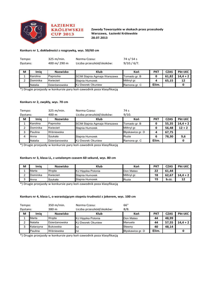 Zawody Towarzyskie w skokach przez przeszkody Warszawa, Łazienki Królewskie 28.07.2013 Konkurs nr 1, dokładności z rozgrywką, wys. 50/60 cm Tempo: Dystans: M 1 2 325 m/min. 400 m/ 290 m Imię Norma Czasu: Liczba przeszkód/skoków: Nazwisko 74 s/ 54 s 9/10./ 6/7. Klub Koń Karolina Paprocka SCIM Stajnia Agmaja Warszawa Tornado gr. B Dominika Kwiecień Stajnia Humorek Mithryl gr. Natalia Dzierżanowska KJ Dworek Okuniew Ramona gr. C PKT 0 4 Elim. CZAS 61,82 65,15 Pkt ŁKC 14,4 + 2 12 0 CZAS 55,35 56,48 67,75 78,30 Pkt ŁKC 14,4 + 2 12 + 2 CZAS 61,44 62,67 b.cz. Pkt ŁKC *) Drugie przejazdy w konkursie pary koń-zawodnik poza klasyfikacją Konkurs nr 2, zwykły, wys. 70 cm Tempo: Dystans: M Imię 1 Karolina 2 Dominika 3 Paulina 4 Anna Natalia 325 m/min. 400 m Nazwisko Norma Czasu: Liczba przeszkód/skoków: Klub 74 s 9/10. Paprocka SCIM Stajnia Agmaja Warszawa Tornado gr. B Kwiecień Stajnia Humorek Mithryl gr. Wiśniewska Koń Błyskawica gr. D Szukała Stajnia Humorek Ruzia Dzierżanowska KJ Dworek Okuniew Ramona gr. C PKT 0 0 4 6 Elim. 9,6 0 *) Drugie przejazdy w konkursie pary koń-zawodnik poza klasyfikacją Konkurs nr 3, klasa LL, z ustalonym czasem 60 sekund, wys. 80 cm M Imię Nazwisko Klub Wojda 1 Marta KJ Hippika Polonia Kwiecień 2 Dominika Stajnia Humorek 3 Anna Stajnia Humorek Szukała *) Drugie przejazdy w konkursie pary koń-zawodnik poza klasyfikacją Koń Don Mateo Mithryl gr. Ruzia PKT 22 18 15 14,4 + 2 12 Konkurs nr 4, klasa L, o wzrastającym stopniu trudności z jokerem, wys. 100 cm Tempo: Dystans: M Imię 1 Marta 2 Natalia 3 Katarzyna Paulina 350 m/min. 380 m Nazwisko Norma Czasu: Liczba przeszkód/skoków: Klub 66" 8/8. Wojda KJ Hippika Polonia Don Mateo Dzierżanowska KJ Dworek Okuniew Manuela 44 44 Bukowska nz Sławny 40 Wiśniewska nz Błyskawica gr. D *) Drugie przejazdy w konkursie pary koń-zawodnik poza klasyfikacją Koń PKT Elim. CZAS 48,99 57,55 48,14 Pkt ŁKC 14,4 + 2 0 Konkurs nr 5, klasa P, zwykły, wys. 110 cm Tempo: 350 m/min. Norma Czasu: Dystans: 440 m Liczba przeszkód/skoków: M 1 2 3 Imię Natalia Nazwisko Klub Dzierżanowska KJ Dworek Okuniew Koń Manuela Paulina Gostkiewicz KJ Dworek Okuniew Focus Marian Kurchan Szwadron Jazdy RP St. Miłosna Dancer Konkurs nr 6, klasa N, szybkości, wys. 120 cm Tempo: 350 m/min. Czas maksymalny: Dystans: 440 m Liczba przeszkód/skoków: M 1 2 3 76" 10/11. CZAS 67,55 64,91 Pkt ŁKC 14,4 + 2 12 BŁĘDY WYNIK 8 84,64 Elim. Elim. Pkt ŁKC 14,4 0 8 Elim. 120" 10/11. Imię Paulina Nazwisko Gostkiewicz Klub KJ Dworek Okuniew Focus Marian Kurchan Szwadron Jazdy RP St. Miłosna Dancer Katarzyna Bukowska nz Sławny Sędzia Główny: Anetta Orlicka Skład orzekający: Anetta Orlicka, Marek Guz, Natalia Doraczyńska Gospodarz Toru: Adam Galuba PKT Koń