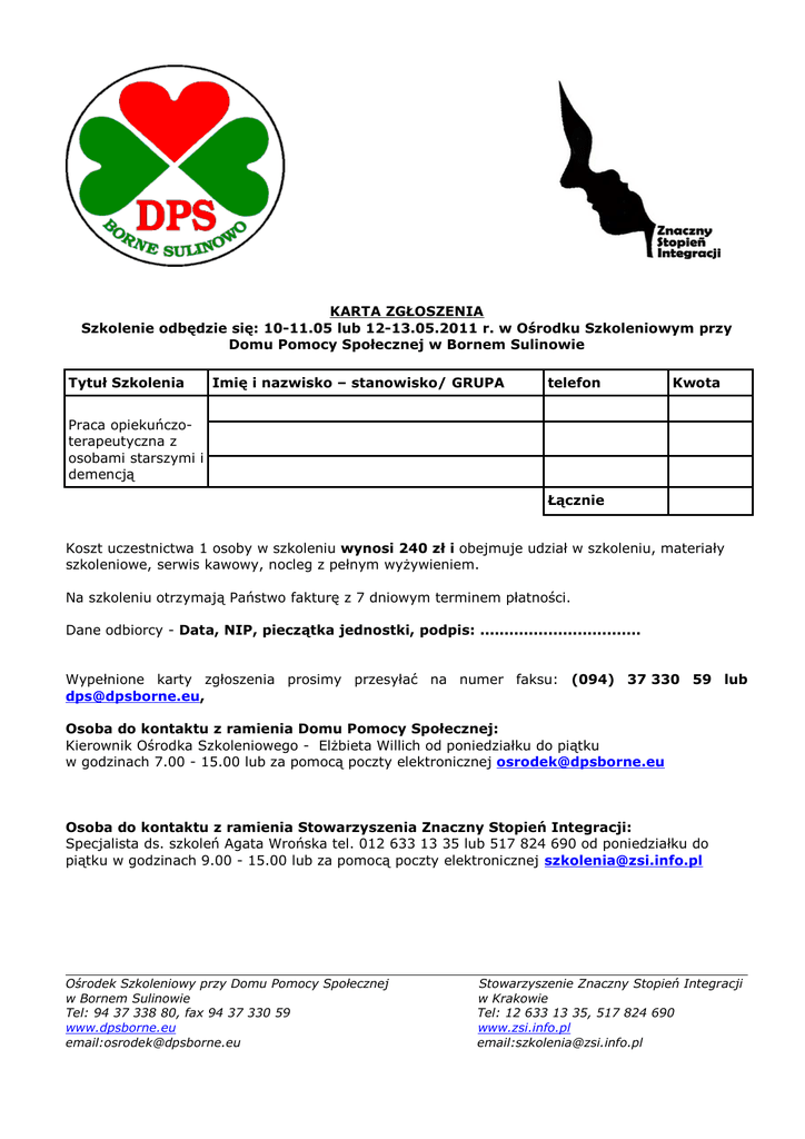 KARTA ZGŁOSZENIA Szkolenie odbędzie się: 10-11.05 lub 12-13.05.2011 r. w Ośrodku Szkoleniowym przy Domu Pomocy Społecznej w Bornem Sulinowie Tytuł Szkolenia Imię i nazwisko – stanowisko/ GRUPA telefon Kwota Praca opiekuńczoterapeutyczna z osobami starszymi i demencją Łącznie Koszt uczestnictwa 1 osoby w szkoleniu wynosi 240 zł i obejmuje udział w szkoleniu, materiały szkoleniowe, serwis kawowy, nocleg z pełnym wyŜywieniem. Na szkoleniu otrzymają Państwo fakturę z 7 dniowym terminem płatności. Dane odbiorcy - Data, NIP, pieczątka jednostki, podpis: ................................. Wypełnione karty zgłoszenia prosimy przesyłać na numer faksu: (094) 37 330 59 lub [email protected], Osoba do kontaktu z ramienia Domu Pomocy Społecznej: Kierownik Ośrodka Szkoleniowego - ElŜbieta Willich od poniedziałku do piątku w godzinach 7.00 - 15.00 lub za pomocą poczty elektronicznej [email protected] Osoba do kontaktu z ramienia Stowarzyszenia Znaczny Stopień Integracji: Specjalista ds. szkoleń Agata Wrońska tel. 012 633 13 35 lub 517 824 690 od poniedziałku do piątku w godzinach 9.00 - 15.00 lub za pomocą poczty elektronicznej [email protected] Ośrodek Szkoleniowy przy Domu Pomocy Społecznej w Bornem Sulinowie Tel: 94 37 338 80, fax 94 37 330 59 www.dpsborne.eu email:[email protected] Stowarzyszenie Znaczny Stopień Integracji w Krakowie Tel: 12 633 13 35, 517 824 690 www.zsi.info.pl email:[email protected]