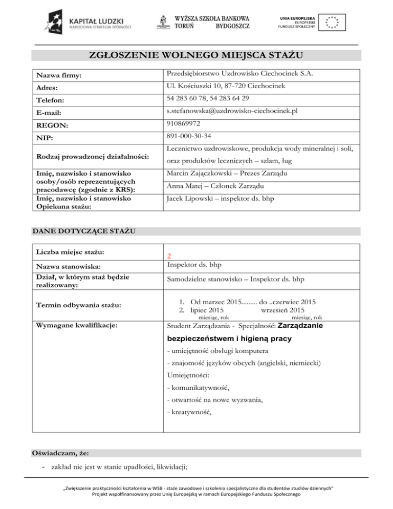 ZGŁOSZENIE WOLNEGO MIEJSCA STAŻU Nazwa firmy: Przedsiębiorstwo Uzdrowisko Ciechocinek S.A. Adres: Ul. Kościuszki 10, 87-720 Ciechocinek Telefon: 54 283 60 78, 54 283 64 29 E-mail: [email protected] REGON: 910869972 NIP: 891-000-30-34 Rodzaj prowadzonej działalności: Imię, nazwisko i stanowisko osoby/osób reprezentujących pracodawcę (zgodnie z KRS): Imię, nazwisko i stanowisko Opiekuna stażu: Lecznictwo uzdrowiskowe, produkcja wody mineralnej i soli, oraz produktów leczniczych – szlam, ług Marcin Zajączkowski – Prezes Zarządu Anna Matej – Członek Zarządu Jacek Lipowski – inspektor ds. bhp DANE DOTYCZĄCE STAŻU Liczba miejsc stażu: Nazwa stanowiska: Dział, w którym staż będzie realizowany: 2 Inspektor ds. bhp Samodzielne stanowisko – Inspektor ds. bhp Termin odbywania stażu: 1. Od marzec 2015......... do ..czerwiec 2015 2. lipiec 2015 wrzesień 2015 Wymagane kwalifikacje: Student Zarządzania - Specjalność: Zarządzanie miesiąc, rok miesiąc, rok bezpieczeństwem i higieną pracy - umiejętność obsługi komputera - znajomość języków obcych (angielski, niemiecki) Umiejętności: - komunikatywność, - otwartość na nowe wyzwania, - kreatywność, Oświadczam, że: - zakład nie jest w stanie upadłości, likwidacji; „Zwiększenie praktyczności kształcenia w WSB - staże zawodowe i szkolenia specjalistyczne dla studentów studiów dziennych” Projekt współfinansowany przez Unię Europejską w ramach Europejskiego Funduszu Społecznego - organizacja stażu dla skierowanego studenta nie będzie przyczyną zwolnień pracowników zatrudnionych w przedsiębiorstwie. SZCZEGÓŁOWY PROGRAM STAŻU Zakres obowiązków Stażysty 1. Zapoznanie studenta z polityką zatrudnienia prowadzoną przez organizację (np. przedstawienie studentowi i zaangażowanie studenta w kwestie dotyczące: metod doboru pracowników, wymagań stawianych pracownikom na wolne stanowiska pracy, możliwości awansowania – zapoznanie z tworzeniem ścieżki kariery zawodowej w organizacji). 2. Udział studenta w procesie planowania i analizowania w organizacji (np. przedstawienie studentowi i zaangażowanie studenta w kwestie dotyczące: metod pozyskiwania informacji stanowiących podstawę planowania przyszłych i bieżących działań firmy, planowania strategicznego, taktycznego i operacyjnego). 3. Nabycie przez studenta umiejętności kierowania i zarządzania firmą (np. przedstawienie studentowi i zaangażowanie studenta w kwestie dotyczące: metody kierowania i zarządzania, które są stosowane w organizacji, warunków podejmowania decyzji i ich skuteczności, umiejętności uwzględnienia czynników prawnych, etycznych, psychologicznych w procesie zarządzania). 4. Zapoznanie studenta ze strategią rozwoju organizacji (np. przedstawienie studentowi i zaangażowanie studenta w kwestie dotyczące: sposobów prowadzenia strategii organizacji w oparciu o kombinację m.in. takich zasobów, jak: wiedza, informacja, zaufanie odbiorców oraz wartość pracowników, badań rynkowych prowadzonych przez organizację, możliwości zwiększania atrakcyjności organizacji, działań w obszarze public relations, możliwość pozyskania kapitału). 5. Zapoznanie studenta z funkcjonowaniem służby bhp w organizacji (np. przedstawienie studentowi i zaangażowanie studenta w kwestie dotyczące: organizacja służby, zadań i kompetencji, roli służby bhp w zarządzaniu podmiotem). 6. Ukazanie studentowi najważniejszych procedur w zakresie bhp (np. przedstawienie studentowi i zaangażowanie studenta w kwestie dotyczące: identyfikacji zagrożeń i procesu oceny ryzyka zawodowego, sposobów dokumentowania zagrożeń i ryzyka, wypadków przy pracy i chorób zawodowych w tym dokumentacji powypadkowej, monitorowania stanu bhp, sposobów dokumentowania przeglądów i podejmowania decyzji o realizacji zaleceń wynikających z przeglądów, zasad przydziału środków ochrony indywidualnej, odzieży i obuwia roboczego, zapewnienia oznakowania miejsc niebezpiecznych oraz dróg ewakuacyjnych i miejsc środków gaśniczych, niebezpiecznych substancji i preparatów chemicznych oraz substancji i technologii o działaniu rakotwórczym i mutagennym, maszyny i urządzenia szczególnie niebezpiecznych, pomiaru szkodliwych dla zdrowia czynników środowiska pracy, sposobów dokumentowania wyników pomiarów i zapoznawania się z nimi przez pracowników, sprawozdawczości w zakresie bhp, planowania przedsięwzięć w zakresie poprawy bezpieczeństwa i warunków pracy, zasad ochrony ppoż., organizacji i przebiegu procesu konsultacyjnego w zakresie bhp, współpracy ze służbami personalnymi w zakresie prowadzenia profilaktycznych badań lekarskich oraz organizacji i realizacji szkoleń z zakresu bhp). Wymiar godzinowy Liczba godzin dziennie: ..8....................... Godziny pracy: od .7.00............. do ...15.00................. Cele edukacyjne „Zwiększenie praktyczności kształcenia w WSB - staże zawodowe i szkolenia specjalistyczne dla studentów studiów dziennych” Projekt współfinansowany przez Unię Europejską w ramach Europejskiego Funduszu Społecznego Program stażowy powinien umożliwić stażyście zdobycie doświadczenia oraz podniesienie poziomu kompetencji przydatnego na rynku pracy. Powinien przygotować stażystę do praktycznego wykonywania zawodu, umiejętności zastosowania wiedzy zdobytej w trakcie studiów w praktyce, zdobycia doświadczenia w samodzielnym i zespołowym wykonywaniu obowiązków zawodowych, zdobycia umiejętności rozwiązywania problemów praktycznych, poznanie organizacji pracy odpowiadającej funkcjonowaniu współczesnych organizacji. Program stażu powinien mieć jasno sprecyzowane cele. Przekazywane treści powinny być wysokiej jakości i stanowić uzupełnienie wiedzy teoretycznej przekazywanej na studiach. W wyniku odbytego stażu stażysta powinien: posługiwać się fachową terminologią używaną w zarządzaniu, wykazywać powiązania zarz
