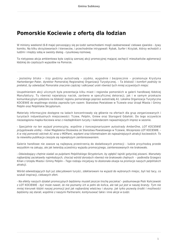 Gmina Subkowy Pomorskie Kociewie z ofertą dla łodzian W miniony weekend (6-8 maja) poruszający się po Łodzi samochodami mogli zaobserwować ciekawe zjawisko - żywy komiks. Na kilku skrzyżowaniach i kierowców, i przechodniów intrygowali: Rybak, Surfer i Krzyżak, którzy wchodzili z ludźmi i między sobą w swoisty dialog - rysunkową rozmowę. Ta nietypowa akcja ambientowa była częścią szerszej akcji promocyjnej mającej zachęcić mieszkańców aglomeracji łódzkiej do częstszych wyjazdów na Pomorze. - Jesteśmy blisko – trzy godziny autostradą – szybko, wygodnie i bezpiecznie – przekonuje Krystyna Hartenberger-Pater, dyrektor Pomorskiej Regionalnej Organizacji Turystycznej. – Ta bliskość i komfort podróży to pretekst, by odwiedzać Pomorskie znacznie częściej i odkrywać uroki również tych mniej oczywistych miejsc Uzupełnieniem akcji ulicznych była prezentacja kilku miast i regionów pomorskich w galerii handlowej łódzkiej Manufaktury. Tu również największy nacisk, zarówno w specyficznej dekoracji, jak i w samym przekazie komunikacyjnym położono na bliskość regionu pomorskiego poprzez autostradę A1. Lokalna Organizacja Turystyczna KOCIEWIE do wspólnego stoiska zaprosiła tym razem: Starostwo Powiatowe w Tczewie oraz Urząd Miasta i Gminy Pelplin oraz Pelplińskie Skryptorium. Materiały informacyjne dostępne na ladach koncentrowały się głównie na ofertach dla grup zorganizowanych i turystach indywidualnych miejscowości: Tczew, Pelplin, Gniew oraz Starogard Gdański. Do tego oczywiście niezastąpiona mapka Kociewia wraz z niezbędnikiem turysty i kalendarzem najważniejszych imprez w sezonie. - Specjalnie na ten wyjazd promocyjny, wspólnie z koncesjonariuszem autostrady AmberOne, LOT KOCIEWIE przygotowała ulotkę – mówi Magdalena Olszewska ze Starostwa Powiatowego w Tczewie, Wiceprezes LOT KOCIEWIE. A w niej pomorski odcinek A1 wraz z MOPami, węzłami oraz kilometrażem do najważniejszych atrakcji kociewskich. To ta niewielka publikacja cieszyła się największym zainteresowaniem. Galerie handlowe nie zawsze są najlepszą przestrzenią do dodatkowych promocji - ludzie przychodzą przede wszystkim na zakupy, ale jak twierdzą uczestnicy wyjazdu promocyjnego, zainteresowanych nie brakowało. - Odwiedzający chętnie siadali za pulpitami Pelplińskiego Skryptorium, by zgłębić tajniki gotyckiej pisowni. Warsztaty najbardziej zaciekawiły najmłodszych, chociaż wśród dorosłych również nie brakowało chętnych – podkreśla Grzegorz Kilian z Urzędu Miasta i Gminy Pelplin – Tego rodzaju inicjatywy to doskonała okazja na promocje naszych pelplińskich atrakcji. Wśród odwiedzających byli już zdecydowani turyści, zdeklarowani na wyjazd do wybranych miejsc, byli też tacy, co szukali inspiracji, ciekawych ofert. - Na efekty naszych działań promocyjnych będziemy musieli jeszcze trochę poczekać - podsumowuje Piotr Kończewski z LOT KOCIEWIE - być może nawet, że nie poznamy ich w pełni do końca, ale tak już jest w naszej branży. Tym nie mniej kierunek łódzki naszej promocji jest jak najbardziej właściwy i słuszny. Jak tylko pozwolą środki i możliwości będziemy się starali, wspólnie z naszymi Partnerami, kontynuować takie i inne akcje w Łodzi. 1