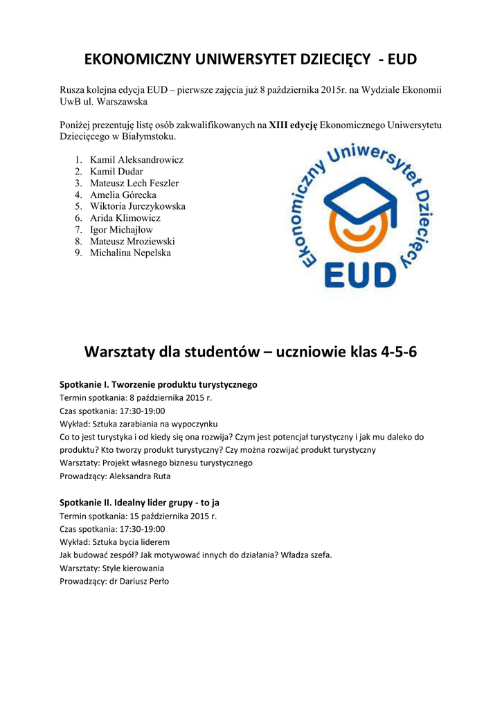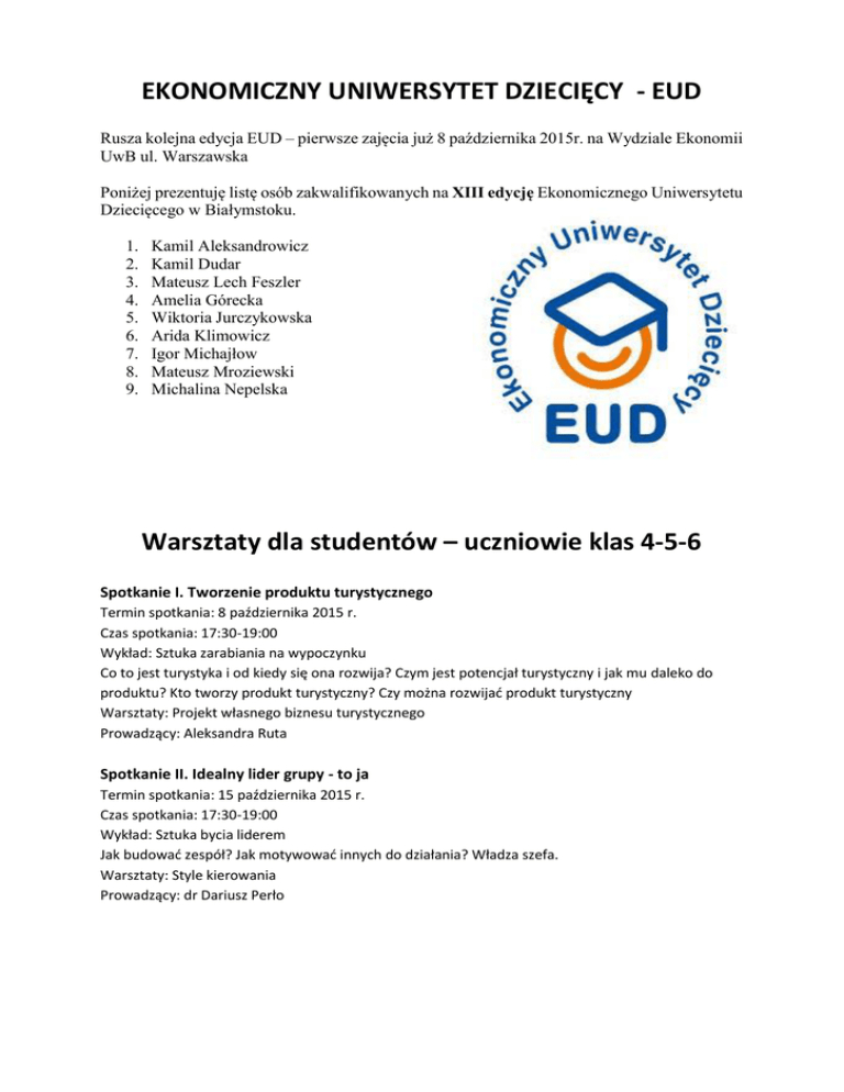 EKONOMICZNY UNIWERSYTET DZIECIĘCY - EUD Rusza kolejna edycja EUD – pierwsze zajęcia już 8 października 2015r. na Wydziale Ekonomii UwB ul. Warszawska Poniżej prezentuję listę osób zakwalifikowanych na XIII edycję Ekonomicznego Uniwersytetu Dziecięcego w Białymstoku. 1. 2. 3. 4. 5. 6. 7. 8. 9. Kamil Aleksandrowicz Kamil Dudar Mateusz Lech Feszler Amelia Górecka Wiktoria Jurczykowska Arida Klimowicz Igor Michajłow Mateusz Mroziewski Michalina Nepelska Warsztaty dla studentów – uczniowie klas 4-5-6 Spotkanie I. Tworzenie produktu turystycznego Termin spotkania: 8 października 2015 r. Czas spotkania: 17:30-19:00 Wykład: Sztuka zarabiania na wypoczynku Co to jest turystyka i od kiedy się ona rozwija? Czym jest potencjał turystyczny i jak mu daleko do produktu? Kto tworzy produkt turystyczny? Czy można rozwijać produkt turystyczny Warsztaty: Projekt własnego biznesu turystycznego Prowadzący: Aleksandra Ruta Spotkanie II. Idealny lider grupy - to ja Termin spotkania: 15 października 2015 r. Czas spotkania: 17:30-19:00 Wykład: Sztuka bycia liderem Jak budować zespół? Jak motywować innych do działania? Władza szefa. Warsztaty: Style kierowania Prowadzący: dr Dariusz Perło Spotkanie III. Czarodziejski młynek do pomnażania pieniędzy Termin spotkania: 29 października 2015 r. Czas spotkania: 17:30-19:00 Wykład: Akcje na giełdzie Po co i jak działa giełda? Dlaczego notowania się zmieniają? Jak na giełdzie zachowują się inwestorzy? Jakie stosują strategie i w jaki sposób podejmują decyzje? Warsztaty: Mini-inwestor Prowadzący: Grzegorz Kowerda Spotkanie IV. Reklama a wywieranie wpływu Termin spotkania: 19 listopada 2015 r. Czas spotkania: 17:30-19:00 Wykład: W jaki sposób przekonywać niezdecydowanych? W jaki sposób przekonuje reklama? Podstawowe sposoby wywierania wpływu. Marketingowe mechanizmy przyciągania klientów. Warsztaty: Tworzenie skutecznej reklamy Prowadzący: dr Marek Kruk Spotkanie V. Wspólna waluta euro Termin spotkania: 26 listopada 2015 r. Czas spotkania: 17:30-19:00 Wykład: Po co komu Unia Europejska i euro? Rozwój Unii Europejskiej, obszary wspólnych działań UE, strefa euro. Warsztaty: Korzyści i koszty euro Prowadzący: dr Andrzej Dzun Spotkanie VI. Praktyk – Moja droga w biznesie Termin spotkania: 10 grudnia 2015 r. Czas spotkania: 17:30-19:00 Wykłady ped-psychologiczne dla rodziców Spotkanie I. Nauczanie wartości Termin spotkania: 8 października 2015 r. Czas spotkania: 17:30-19:00 Czym są wartości? Czy można nauczyć dziecko praktykować wartości? Dlaczego trzeba i jak uczyć wartości moralnych? Dwanaście najważniejszych wartości w praktyce. Spotkanie II. Wpływ mediów masowych na odbiorców Termin spotkania: 15 października 2015 r. Czas spotkania: 17:30-19:00 Media masowe – jak z nich korzystać? Czy mogą stanowić zagrożenie dla dziecka? Wpływ pozytywny i negatywny mediów na rozwój osobowy. Spotkanie III. Podejmowanie decyzji konsumenckich przez dzieci Termin spotkania: 15 października 2015 r. Czas spotkania: 17:30-19:00 Rynek młodego konsumenta w Polsce – z perspektywy rodziny i procesu wychowania. Rodzinne uwarunkowania kształtowania się potrzeb konsumenckich u dzieci i młodzieży. Postawy i zachowania młodych polskich konsumentów – tendencje i kierunki zmian. Psychologiczne aspekty podejmowania decyzji konsumenckich przez dzieci i młodzież. Spotkanie IV. Jak rozbudzać kreatywność dziecka? Termin spotkania: 19 listopada 2015 r. Czas spotkania: 17:30-19:00 Rozwój dziecka poprzez zajęcia fakultatywne. Praca własna, mentoring rodzica, współpraca z rówieśnikami. Rozwój a zabawa. Czy i jak można kształtować kreatywność dziecka. Spotkanie V. Jak efektywnie wspierać dziecko w nauce? Termin spotkania: 26 listopada 2015 r. Czas spotkania: 17:30-19:00 Jak rozwijać w dziecku umiejętność planowania i organizowania własnej pracy? Podstawowe narzędzia wspierania dzieci w nauce: metoda modelowania, świadomego planowania, uczenia się poprzez doświadczenie. Rola emocjonalnego wsparcia. Znaczenie konstruktywnej krytyki. Nowoczesne techniki efektywnego uczenia się. Spotkanie VI. Psychologia konsumenta Termin spotkania: 10 grudnia 2015 r. Czas spotkania: 17:30-19:00