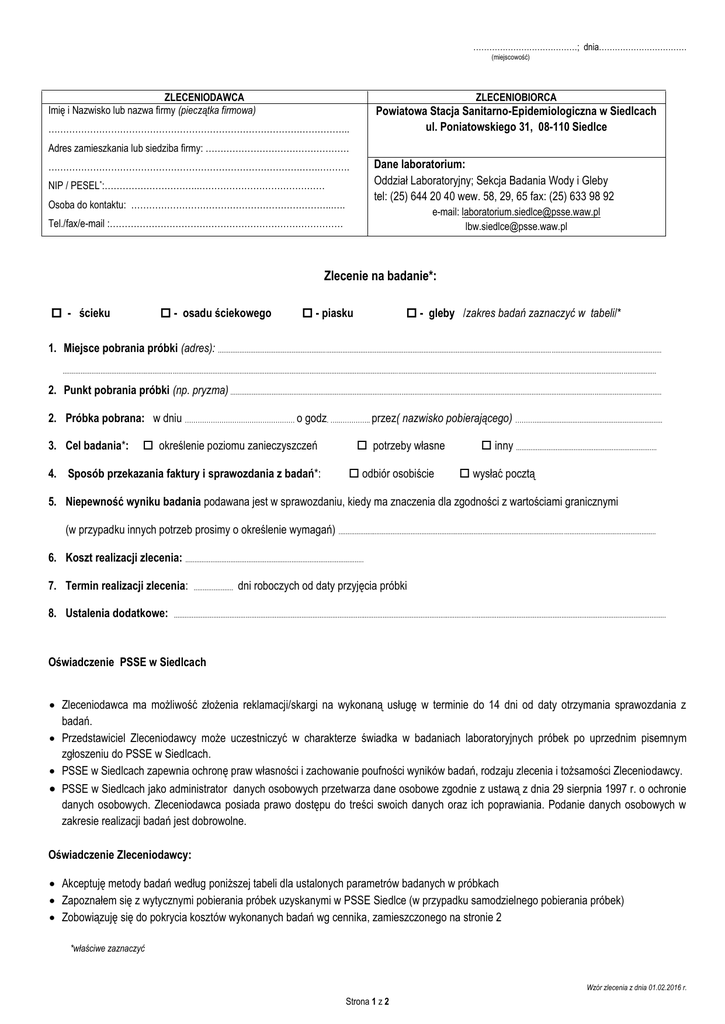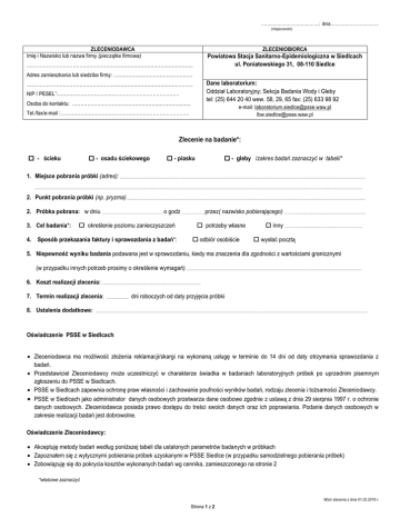 …………………………………; dnia…………………………… (miejscowość) ZLECENIODAWCA Imię i Nazwisko lub nazwa firmy (pieczątka firmowa) ZLECENIOBIORCA Powiatowa Stacja Sanitarno-Epidemiologiczna w Siedlcach ul. Poniatowskiego 31, 08-110 Siedlce ……………………………………………………………………………………….. Adres zamieszkania lub siedziba firmy: ………………………………………… Dane laboratorium: Oddział Laboratoryjny; Sekcja Badania Wody i Gleby tel: (25) 644 20 40 wew. 58, 29, 65 fax: (25) 633 98 92 ……………………………………………………………………………….………. NIP / PESEL*:…………………………..…………………………………… Osoba do kontaktu: …………………………………………………………..…. e-mail: [email protected] [email protected] Tel./fax/e-mail :…………………………………………………………………… Zlecenie na badanie*: - ścieku - osadu ściekowego - piasku - gleby /zakres badań zaznaczyć w tabeli/* 1. Miejsce pobrania próbki (adres): ...................................................................................................................................................................................................................................................... ......................................................................................................................................................................................................................................................................................................................................... 2. Punkt pobrania próbki (np. pryzma) ............................................................................................................................................................................................................................................... 2. Próbka pobrana: w dniu …………………………………………… o godz. …..………….. przez( nazwisko pobierającego) ………....................................................................... 3. Cel badania*: określenie poziomu zanieczyszczeń 4. Sposób przekazania faktury i sprawozdania z badań*: potrzeby własne odbiór osobiście inny .............................................................................. wysłać pocztą 5. Niepewność wyniku badania podawana jest w sprawozdaniu, kiedy ma znaczenia dla zgodności z wartościami granicznymi (w przypadku innych potrzeb prosimy o określenie wymagań) ................................................................................................................................................................................ 6. Koszt realizacji zlecenia: ................................................................................................... 7. Termin realizacji zlecenia: 8. Ustalenia dodatkowe: ...................... dni roboczych od daty przyjęcia próbki ................................................................................................................................................................................................................................................................................. Oświadczenie PSSE w Siedlcach Zleceniodawca ma możliwość złożenia reklamacji/skargi na wykonaną usługę w terminie do 14 dni od daty otrzymania sprawozdania z badań. Przedstawiciel Zleceniodawcy może uczestniczyć w charakterze świadka w badaniach laboratoryjnych próbek po uprzednim pisemnym zgłoszeniu do PSSE w Siedlcach. PSSE w Siedlcach zapewnia ochronę praw własności i zachowanie poufności wyników badań, rodzaju zlecenia i tożsamości Zleceniodawcy. PSSE w Siedlcach jako administrator danych osobowych przetwarza dane osobowe zgodnie z ustawą z dnia 29 sierpnia 1997 r. o ochronie danych osobowych. Zleceniodawca posiada prawo dostępu do treści swoich danych oraz ich poprawiania. Podanie danych osobowych w zakresie realizacji badań jest dobrowolne. Oświadczenie Zleceniodawcy: Akceptuję metody badań według poniższej tabeli dla ustalonych parametrów badanych w próbkach Zapoznałem się z wytycznymi pobierania próbek uzyskanymi w PSSE Siedlce (w przypadku samodzielnego pobierania próbek) Zobowiązuję się do pokrycia kosztów wykonanych badań wg cennika, zamieszczonego na stronie 2 *właściwe zaznaczyć Wzór zlecenia z dnia 01.02.2016 r. Strona 1 z 2 WYKAZ BADANYCH PARAMETRÓW I. Badania parazytologiczne L.p. Parametr Metoda badawcza Cena netto (zł)* Liczba jaj Toxocara sp. PB-32-WG wyd.1 z dnia 29.04.2010 2. Liczba jaj Ascaris lumbricoides PN-Z-19000-4:2001 (osad) 3. Liczba jaj Trichuris trichiura PN-Z-19000-4:2001 (gleba) 1. 4. 251 Suma jaj Toxocara sp., Ascaris l., Trichuris t. (metoda z obliczeń) Sucha pozostałość PN-EN 12880:2004 II. Badania mikrobiologiczne Wskaźnik ATT L.p. Parametr 1. 2. 270 40 Metoda badawcza Obecność bakterii z rodzaju Salmonella (ściek) Obecności bakterii z rodzaju Salmonella (osad, gleba, piasek) Cena netto (zł)* PB-43-WG wyd.1 z dnia 20.09.2011 180 PN-Z-19000-1:2001 180 * Do ceny netto dolicza się VAT w wysokości 23% ……….……………………..…………..…………………… Podpis Zleceniodawcy Przyjęcie próbki do laboratorium Przegląd zlecenia …………………………………………..…………………………………………………… Data Godzina przyjęcia próbek Kod laboratoryjny próbki Stan próbki(ek) w chwili przyjęcia do laboratorium Stan próbki(ek) nie budzi zastrzeżeń Podpis osoby przyjmującej próbki Uwagi:……………………………………………………… Uzgodnienia z klientem w trakcie realizacji zlecenia: ………………………………………………………………………………………………………………………..……