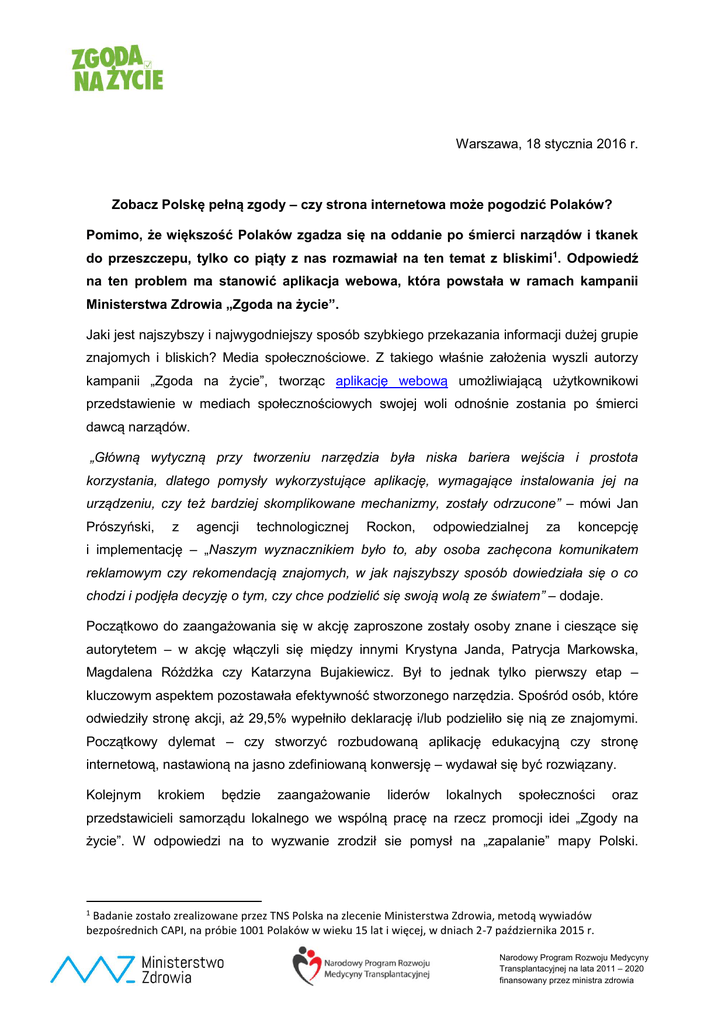 Warszawa, 18 stycznia 2016 r. Zobacz Polskę pełną zgody – czy strona internetowa może pogodzić Polaków? Pomimo, że większość Polaków zgadza się na oddanie po śmierci narządów i tkanek do przeszczepu, tylko co piąty z nas rozmawiał na ten temat z bliskimi1. Odpowiedź na ten problem ma stanowić aplikacja webowa, która powstała w ramach kampanii Ministerstwa Zdrowia „Zgoda na życie”. Jaki jest najszybszy i najwygodniejszy sposób szybkiego przekazania informacji dużej grupie znajomych i bliskich? Media społecznościowe. Z takiego właśnie założenia wyszli autorzy kampanii „Zgoda na życie”, tworząc aplikację webową umożliwiającą użytkownikowi przedstawienie w mediach społecznościowych swojej woli odnośnie zostania po śmierci dawcą narządów. „Główną wytyczną przy tworzeniu narzędzia była niska bariera wejścia i prostota korzystania, dlatego pomysły wykorzystujące aplikację, wymagające instalowania jej na urządzeniu, czy też bardziej skomplikowane mechanizmy, zostały odrzucone” – mówi Jan Prószyński, z agencji technologicznej Rockon, odpowiedzialnej za koncepcję i implementację – „Naszym wyznacznikiem było to, aby osoba zachęcona komunikatem reklamowym czy rekomendacją znajomych, w jak najszybszy sposób dowiedziała się o co chodzi i podjęła decyzję o tym, czy chce podzielić się swoją wolą ze światem” – dodaje. Początkowo do zaangażowania się w akcję zaproszone zostały osoby znane i cieszące się autorytetem – w akcję włączyli się między innymi Krystyna Janda, Patrycja Markowska, Magdalena Różdżka czy Katarzyna Bujakiewicz. Był to jednak tylko pierwszy etap – kluczowym aspektem pozostawała efektywność stworzonego narzędzia. Spośród osób, które odwiedziły stronę akcji, aż 29,5% wypełniło deklarację i/lub podzieliło się nią ze znajomymi. Początkowy dylemat – czy stworzyć rozbudowaną aplikację edukacyjną czy stronę internetową, nastawioną na jasno zdefiniowaną konwersję – wydawał się być rozwiązany. Kolejnym krokiem będzie zaangażowanie liderów lokalnych społeczności oraz przedstawicieli samorządu lokalnego we wspólną pracę na rzecz promocji idei „Zgody na życie”. W odpowiedzi na to wyzwanie zrodził sie pomysł na „zapalanie” mapy Polski. 1 Badanie zostało zrealizowane przez TNS Polska na zlecenie Ministerstwa Zdrowia, metodą wywiadów bezpośrednich CAPI, na próbie 1001 Polaków w wieku 15 lat i więcej, w dniach 2-7 października 2015 r. Narodowy Program Rozwoju Medycyny Transplantacyjnej na lata 2011 – 2020 finansowany przez ministra zdrowia Podobnie jak przy pierwszym etapie, priorytetem przy tworzeniu narzędzia była prostota i skupienie się na jednym głównym komunikacie, przedstawionym w jednym miejscu. „Skorzystaliśmy z najlepszego rozwiązania do wizualizowania danych na mapach, czyli z Google Maps. Każdy użytkownik może dobrowolnie wyrazić zgodę na zapisanie swojej pozycji z geolokalizacji przeglądarki – mówi Jan Szarras, CEO w Rockon – „Dzięki temu, otrzymujemy długość i szerokość geograficzną pozycji użytkownika. Stąd niedaleka droga do wykorzystania rozwiązania dostarczanego przez Google, jakim jest tzw. heat mapa. Efekt jest atrakcyjny wizualnie i zrozumiały w działaniu – o to nam chodziło” – dodaje. Aplikacja webowa dostępna jest pod adresem: deklaracja.zgodanazycie.pl Kampania „Zgoda na życie” Kampania „Zgoda na życie” potrwa do końca 2016 r. Jej celem jest upowszechnienie w społeczeństwie wiedzy na temat medycyny transplantacyjnej, zachęcenie Polaków do publicznego deklarowania swojej woli w kwestii dawstwa narządów oraz zostawania potencjalnymi dawcami szpiku kostnego. Kampania finansowana jest w ramach Narodowego Programu Rozwoju Medycyny Transplantacyjnej na lata 2011 – 2020. Więcej informacji znaleźć można na stronie www.zgodanazycie.pl. Więcej informacji udzielają: Maria Zakrzewska Fabryka Komunikacji Społecznej [email protected] (22) 616 12 17 Anna Iżyńska Fabryka Komunikacji Społecznej [email protected] (22) 616 12 17 Narodowy Program Rozwoju Medycyny Transplantacyjnej na lata 2011 – 2020 finansowany przez ministra zdrowia