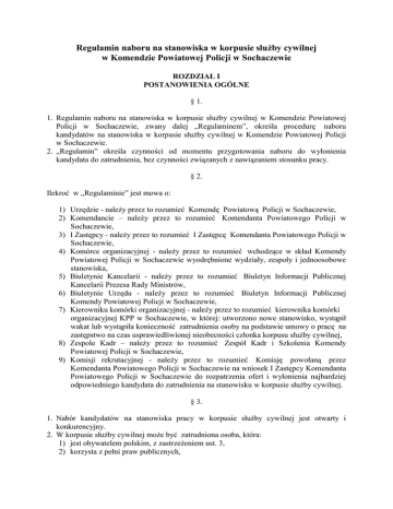 Regulamin naboru na stanowiska w korpusie służby cywilnej w Komendzie Powiatowej Policji w Sochaczewie ROZDZIAŁ I POSTANOWIENIA OGÓLNE § 1. 1. Regulamin naboru na stanowiska w korpusie służby cywilnej w Komendzie Powiatowej Policji w Sochaczewie, zwany dalej „Regulaminem”, określa procedurę naboru kandydatów na stanowiska w korpusie służby cywilnej w Komendzie Powiatowej Policji w Sochaczewie. 2. „Regulamin” określa czynności od momentu przygotowania naboru do wyłonienia kandydata do zatrudnienia, bez czynności związanych z nawiązaniem stosunku pracy. § 2. Ilekroć w „Regulaminie” jest mowa o: 1) Urzędzie - należy przez to rozumieć Komendę Powiatową Policji w Sochaczewie, 2) Komendancie – należy przez to rozumieć Komendanta Powiatowego Policji w Sochaczewie, 3) I Zastępcy - należy przez to rozumieć I Zastępcę Komendanta Powiatowego Policji w Sochaczewie, 4) Komórce organizacyjnej - należy przez to rozumieć wchodzące w skład Komendy Powiatowej Policji w Sochaczewie wyodrębnione wydziały, zespoły i jednoosobowe stanowiska, 5) Biuletynie Kancelarii - należy przez to rozumieć Biuletyn Informacji Publicznej Kancelarii Prezesa Rady Ministrów, 6) Biuletynie Urzędu - należy przez to rozumieć Biuletyn Informacji Publicznej Komendy Powiatowej Policji w Sochaczewie, 7) Kierowniku komórki organizacyjnej - należy przez to rozumieć kierownika komórki organizacyjnej KPP w Sochaczewie, w której: utworzono nowe stanowisko, wystąpił wakat lub wystąpiła konieczność zatrudnienia osoby na podstawie umowy o pracę na zastępstwo na czas usprawiedliwionej nieobecności członka korpusu służby cywilnej, 8) Zespole Kadr – należy przez to rozumieć Zespół Kadr i Szkolenia Komendy Powiatowej Policji w Sochaczewie, 9) Komisji rekrutacyjnej - należy przez to rozumieć Komisję powołaną przez Komendanta Powiatowego Policji w Sochaczewie na wniosek I Zastępcy Komendanta Powiatowego Policji w Sochaczewie do rozpatrzenia ofert i wyłonienia najbardziej odpowiedniego kandydata do zatrudnienia na stanowisku w korpusie służby cywilnej. § 3. 1. Nabór kandydatów na stanowiska pracy w korpusie służby cywilnej jest otwarty i konkurencyjny. 2. W korpusie służby cywilnej może być zatrudniona osoba, która: 1) jest obywatelem polskim, z zastrzeżeniem ust. 3, 2) korzysta z pełni praw publicznych, 3) nie była skazana prawomocnym wyrokiem za umyślne przestępstwo lub umyślne, przestępstwo skarbowe, 4) posiada kwalifikacje wymagane na dane stanowisko pracy, 5) cieszy się nieposzlakowaną opinią. 3. Osoba nieposiadająca obywatelstwa polskiego może zostać zatrudniona na stanowisku, pracy, na którym wykonywana praca nie polega na bezpośrednim lub pośrednim udziale, w wykonywaniu władzy publicznej i funkcji mających na celu ochronę generalnych interesów, państwa, jeżeli posiada znajomość języka polskiego potwierdzoną odpowiednim certyfikatem/ dokumentem. 4. Jeżeli w Urzędzie wskaźnik zatrudnienia osób niepełnosprawnych, w rozumieniu przepisów o rehabilitacji zawodowej i społecznej oraz zatrudnianiu osób niepełnosprawnych, w miesiącu poprzedzającym datę upublicznienia ogłoszenia o naborze, jest niższy niż 6%, pierwszeństwo w zatrudnieniu przysługuje osobie niepełnosprawnej, o ile znajduje się w gronie kandydatów przedstawionych Komendantowi. § 4. 1. Nabór może być prowadzony w sytuacji: 1) utworzenia nowego stanowiska w urzędzie, 2) powstania wakatu, 3) wystąpienia konieczności zatrudnienia osoby na podstawie umowy o pracę na zastępstwo, na czas usprawiedliwionej nieobecności członka korpusu służby cywilnej. 2. Przepisów Regulaminu nie stosuje się w przypadku przesunięć pracowników na inne stanowiska w Urzędzie, w tym awansów wewnętrznych. ROZDZIAŁ II DECYZJA O WSZCZĘCIU PROCEDURY REKRUTACYJNEJ NA STANOWISKO W KORPUSIE SŁUŻBY CYWILNEJ § 5. 1. Decyzję o wszczęciu procedury naboru podejmuje Komendant lub osoba przez niego upoważniona poprzez akceptację złożonego przez kierownika komórki organizacyjnej za pośrednictwem Zespołu Kadr wniosku o przeprowadzenie naboru na stanowisko w korpusie służby cywilnej. Wzór wniosku został określony w załączniku nr 1 do „Regulaminu”. 2. Kierownik komórki organizacyjnej we wniosku o którym mowa w ust. 1, proponuje czy o stanowisko mogą ubiegać się obywatele Unii Europejskiej oraz obywatele innych państw, którym na podstawie umów międzynarodowych lub przepisów prawa wspólnotowego przysługuje prawo podjęcia zatrudnienia na terytorium Rzeczpospolitej Polskiej. 3. W sytuacji utworzenia nowego stanowiska lub wystąpienia wakatu w grupie stanowisk: średniego szczebla zarządzania, koordynujących oraz samodzielnych (jednoosobowych) wniosek, o którym mowa w ust. 1 sporządza Zespół Kadr. 4. Komendant przed ogłoszeniem oferty pracy na wolne stanowisko zwraca się do Szefa Służby Cywilnej o wyrażenie zgody na możliwość zatrudnienia cudzoziemca na danym stanowisku mając na uwadze art. 5 ustawy z dnia 21 listopada 2008 roku o Słubie cywilnej /Dz. U. Nr 227, poz. 1505 z późn. zm./. § 6. 1. Kierownik komórki organizacyjnej, po uzyskaniu zgody na przeprowadzenie zewnętrznej rekrutacji, sporządza projekt ogłoszenia o naborze na podstawie opisu stanowiska pracy, w oparciu o schemat ogłoszeń opublikowanych w Serwisie Służby Cywilnej Kancelarii Prezesa Rady Ministrów, z zastrzeżeniem ust. 3. 2. Ogłoszenie o naborze zawiera w szczególności: 1) nazwę i adres Urzędu; 2) stanowisko pracy, na które prowadzony jest nabór; 3) wymagania związane ze stanowiskiem pracy zgodne z opisem danego stanowiska, ze wskazaniem, które z nich są niezbędne, a które dodatkowe; 4) informację o warunkach pracy na danym stanowisku pracy; 5) zakres zadań wykonywanych na stanowisku pracy; 6) informację, czy w miesiącu poprzedzającym datę upublicznienia ogłoszenia wskaźnik zatrudnienia osób niepełnosprawnych w urzę