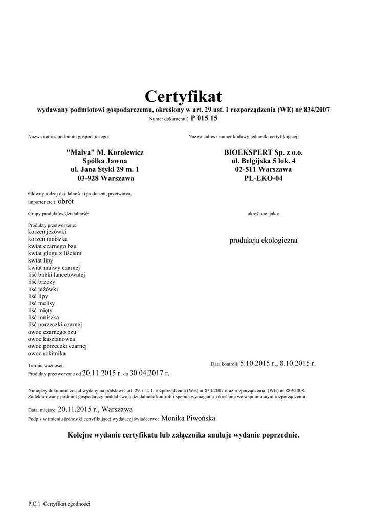 Certyfikat wydawany podmiotowi gospodarczemu, określony w art. 29 ust. 1 rozporządzenia (WE) nr 834/2007 Numer dokumentu: Nazwa i adres podmiotu gospodarczego: P 015 15 Nazwa, adres i numer kodowy jednostki certyfikującej: "Malva" M. Korolewicz Spółka Jawna ul. Jana Styki 29 m. 1 03-928 Warszawa BIOEKSPERT Sp. z o.o. ul. Belgijska 5 lok. 4 02-511 Warszawa PL-EKO-04 Główny rodzaj działalności (producent, przetwórca, importer etc.): obrót Grupy produktów/działalność: określone jako: Produkty przetworzone: korzeń jeżówki korzeń mniszka kwiat czarnego bzu kwiat głogu z liściem kwiat lipy kwiat malwy czarnej liść babki lancetowatej liść brzozy liść jeżówki liść lipy liść melisy liść mięty liść mniszka liść porzeczki czarnej owoc czarnego bzu owoc kasztanowca owoc porzeczki czarnej owoc rokitnika produkcja ekologiczna Data kontroli: 5.10.2015 Termin ważności: Produkty przetworzone od 20.11.2015 r., 8.10.2015 r. r. do 30.04.2017 r. Niniejszy dokument został wydany na podstawie art. 29. ust. 1. rozporządzenia (WE) nr 834/2007 oraz rozporządzenia (WE) nr 889/2008. Zadeklarowany podmiot gospodarczy poddał swoją działalność kontroli i spełnia wymagania określone we wspomnianym rozporządzeniu. Data, miejsce: 20.11.2015 r., Warszawa Podpis w imieniu jednostki certyfikującej wydającej świadectwo: Monika Piwońska Kolejne wydanie certyfikatu lub załącznika anuluje wydanie poprzednie. P.C.1. Certyfikat zgodności