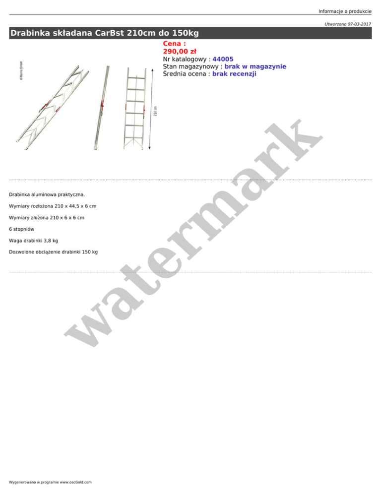 Informacje o produkcie Utworzono 07-03-2017 Drabinka składana CarBst 210cm do 150kg Cena : 290,00 zł Drabinka aluminowa praktyczna. Wymiary rozłożona 210 x 44,5 x 6 cm Wymiary złożona 210 x 6 x 6 cm 6 stopniów Waga drabinki 3,8 kg w at Dozwolone obciążenie drabinki 150 kg er m ar k Nr katalogowy : 44005 Stan magazynowy : brak w magazynie Średnia ocena : brak recenzji Wygenerowano w programie www.oscGold.com