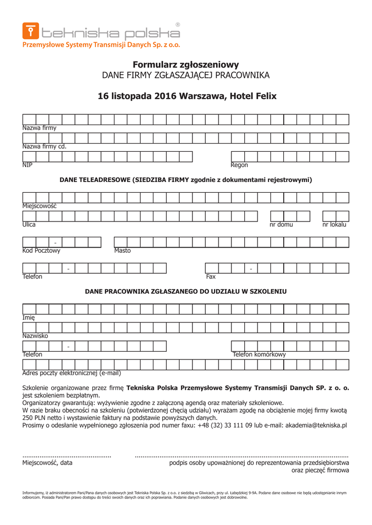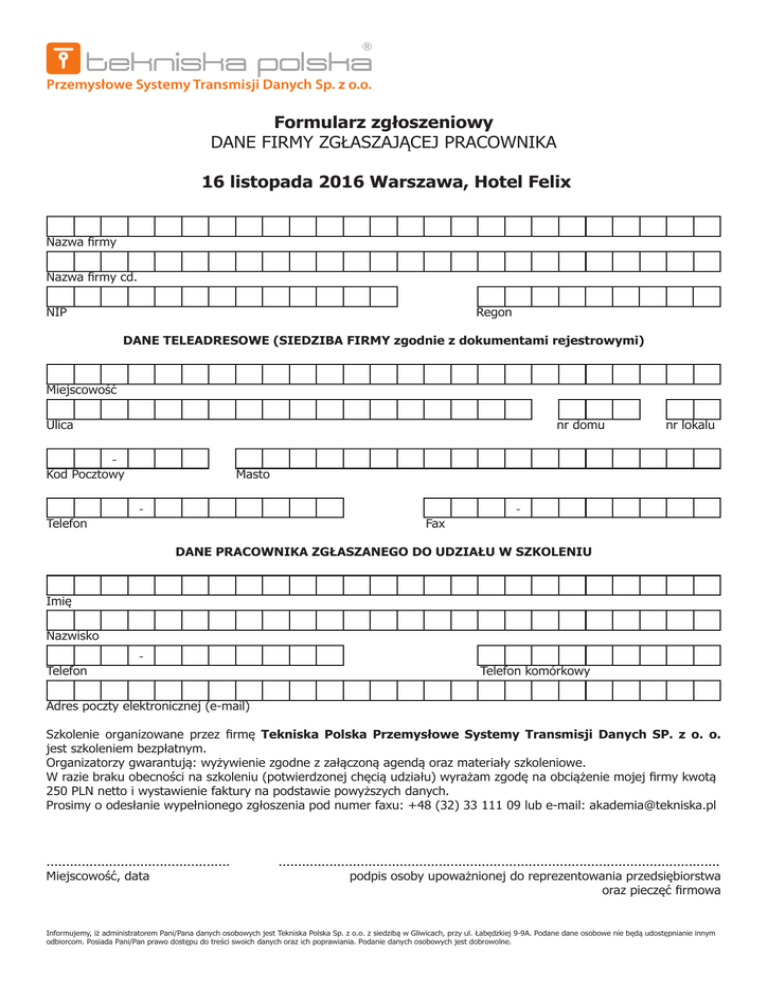Formularz zgłoszeniowy DANE FIRMY ZGŁASZAJĄCEJ PRACOWNIKA 16 listopada 2016 Warszawa, Hotel Felix Nazwa firmy Nazwa firmy cd. NIP Regon DANE TELEADRESOWE (SIEDZIBA FIRMY zgodnie z dokumentami rejestrowymi) Miejscowość Ulica - Kod Pocztowy nr domu nr lokalu Masto - Telefon Fax - DANE PRACOWNIKA ZGŁASZANEGO DO UDZIAŁU W SZKOLENIU Imię Nazwisko - Telefon Telefon komórkowy Adres poczty elektronicznej (e-mail) Szkolenie organizowane przez firmę Tekniska Polska Przemysłowe Systemy Transmisji Danych SP. z o. o. jest szkoleniem bezpłatnym. Organizatorzy gwarantują: wyżywienie zgodne z załączoną agendą oraz materiały szkoleniowe. W razie braku obecności na szkoleniu (potwierdzonej chęcią udziału) wyrażam zgodę na obciążenie mojej firmy kwotą 250 PLN netto i wystawienie faktury na podstawie powyższych danych. Prosimy o odesłanie wypełnionego zgłoszenia pod numer faxu: +48 (32) 33 111 09 lub e-mail: [email protected] ............................................... Miejscowość, data ................................................................................................................. podpis osoby upoważnionej do reprezentowania przedsiębiorstwa oraz pieczęć firmowa Informujemy, iż administratorem Pani/Pana danych osobowych jest Tekniska Polska Sp. z o.o. z siedzibą w Gliwicach, przy ul. Łabędzkiej 9-9A. Podane dane osobowe nie będą udostępnianie innym odbiorcom. Posiada Pani/Pan prawo dostępu do treści swoich danych oraz ich poprawiania. Podanie danych osobowych jest dobrowolne.