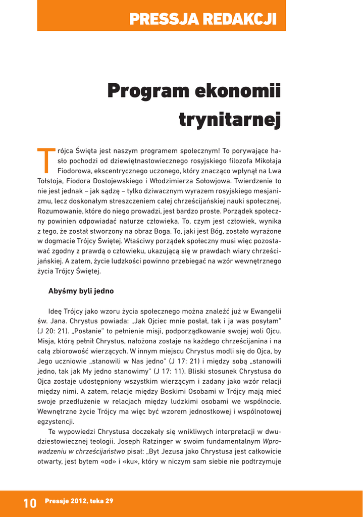 PRESSJA REDAKCJI Program ekonomii trynitarnej T rójca Święta jest naszym programem społecznym! To porywające hasło pochodzi od dziewiętnastowiecznego rosyjskiego filozofa Mikołaja Fiodorowa, ekscentrycznego uczonego, który znacząco wpłynął na Lwa Tołstoja, Fiodora Dostojewskiego i Włodzimierza Sołowjowa. Twierdzenie to nie jest jednak − jak sądzę − tylko dziwacznym wyrazem rosyjskiego mesjanizmu, lecz doskonałym streszczeniem całej chrześcijańskiej nauki społecznej. Rozumowanie, które do niego prowadzi, jest bardzo proste. Porządek społeczny powinien odpowiadać naturze człowieka. To, czym jest człowiek, wynika z tego, że został stworzony na obraz Boga. To, jaki jest Bóg, zostało wyrażone w dogmacie Trójcy Świętej. Właściwy porządek społeczny musi więc pozostawać zgodny z prawdą o człowieku, ukazującą się w prawdach wiary chrześcijańskiej. A zatem, życie ludzkości powinno przebiegać na wzór wewnętrznego życia Trójcy Świętej. Abyśmy byli jedno Ideę Trójcy jako wzoru życia społecznego można znaleźć już w Ewangelii św. Jana. Chrystus powiada: „Jak Ojciec mnie posłał, tak i ja was posyłam” (J 20: 21). „Posłanie” to pełnienie misji, podporządkowanie swojej woli Ojcu. Misja, którą pełnił Chrystus, nałożona zostaje na każdego chrześcijanina i na całą zbiorowość wierzących. W innym miejscu Chrystus modli się do Ojca, by Jego uczniowie „stanowili w Nas jedno” (J 17: 21) i między sobą „stanowili jedno, tak jak My jedno stanowimy” (J 17: 11). Bliski stosunek Chrystusa do Ojca zostaje udostępniony wszystkim wierzącym i zadany jako wzór relacji między nimi. A zatem, relacje między Boskimi Osobami w Trójcy mają mieć swoje przedłużenie w relacjach między ludzkimi osobami we wspólnocie. Wewnętrzne życie Trójcy ma więc być wzorem jednostkowej i wspólnotowej egzystencji. Te wypowiedzi Chrystusa doczekały się wnikliwych interpretacji w dwudziestowiecznej teologii. Joseph Ratzinger w swoim fundamentalnym Wprowadzeniu w chrześcijaństwo pisał: „Byt Jezusa jako Chrystusa jest całkowicie otwarty, jest bytem «od» i «ku», który w niczym sam siebie nie podtrzymuje 10 Pressje 2012, teka 29 i w niczym, jedynie na sobie samym, się nie opiera − jest […] czystą relacją […]. To, co w ten sposób mówi się zasadniczo o Chrystusie, daje się zarazem […] zastosować do wyjaśnienia egzystencji chrześcijańskiej. Być chrześcijaninem znaczy […] być jak syn, stać się synem, a więc nie opierać się na sobie, nie tkwić w sobie, tylko żyć w otwarciu «od» i «ku»” (Ratzinger 1996: 175−176). Z kolei Jean Daniélou w głośnej pracy Trójca Święta i tajemnica egzystencji zauważył: „To jeden z tych punktów, gdzie tajemnica Trójcy Świętej naświetla sprawy ludzkie. To nas poucza, że samą istotą egzystencji […] jest miłość w sensie wspólnoty osób. Istotą bytu jest wspólnota osób. Niektórzy powiadają, że istotą bytu jest materia albo duch, jeszcze inni, że jednia. Wszyscy się mylą. Istotą bytu jest komunia” (Daniélou 1994: 41−42). Te słowa Chrystusa z Ewangelii św. Jana przywołali także ojcowie II Soboru Watykańskiego w kluczowym miejscu fundamentalnej Konstytucji o Kościele w świecie współczesnym, by ukazać wspólnotowy charakter powołania chrześcijańskiego. „Kiedy Pan Jezus modli się do Ojca, aby «wszyscy byli jedno, jako i my jedno jesteśmy» […] daje znać o pewnym podobieństwie między jednością osób boskich a jednością synów Bożych zespolonych w prawdzie i w miłości. To podobieństwo ukazuje, że człowiek […] nie może odnaleźć się w pełni inaczej, jak tylko poprzez bezinteresowny dar z samego siebie” (GS: 24). To podobieństwo między Trójcą Świętą a społecznością ludzką jest podstawą nauki społecznej Kościoła, wskazuje bowiem fundament, wzór i cel wspólnotowego życia ludzi. Chrystus jest więc Panem − nie tylko życia ludzkiego, lecz także nauk o człowieku Do tego fundamentu wrócił ostatnio Benedykt XVI w społecznej encyklice Caritas in veritate. Tu nauka o Trójcy Świętej staje się już bezpośrednio wzorem dla urządzenia życia społecznego i stosunków międzynarodowych. „Temat rozwoju zbiega się z tematem włączenia na zasadzie relacji wszystkich osób i wszystkich narodów do jednej wspólnoty rodziny ludzkiej […]. Ta perspektywa znajduje decydujące światło w relacjach między Osobami Trójcy Świętej w jedynej Bożej Substancji. […] Bóg pragnie także nas przyłączyć do tej rzeczywistości komunii: «aby stanowili jedno, tak jak My jedno stanowimy». Kościół jest znakiem i narzędziem tej jedności. Również relacje między ludźmi w dziejach powinny jedynie wyciągać korzyści z odniesienia do tego boskiego wzorca” (CIV: 54). Chrześcijańska nauka społeczna jest więc prawdziwą teologią polityczną. Teologiczna nauka o Trójcy Świętej jest w niej bowiem podstawą życia społecznego, politycznego i gospodarczego. Jako w niebie ma być także na ziemi. Nauka społeczna Kościoła jest więc jak gdyby odwrotnością sekularyzacji. To nie Bóg jest projekcją ludzkości − jak chciał Ludwig Feuerbach − lecz ludzkość stanowi odzwierciedlenie Boga. Misja Kościoła polega na coraz bliższym urzeczywistnianiu tego podobieństwa w świecie. Pressja Redakcji 11 Teoretyczne panowanie Chrystusa Teza Soboru, że „Chrystus […] objawia w pełni człowieka samemu człowiekowi i okazuje mu najwyższe jego powołanie” (GS: 22), ma konsekwencje nie tylko egzystencjalne, lecz także teoretyczne. Z jednej strony Sobór wskazuje, że naśladowanie Chrystusa jest tak naprawdę samorealizacją, a pełnienie woli Bożej daje autentyczną wolność. Chrystus nie jest bowiem jakimś narzuconym z zewnątrz wzorem, lecz pełną realizacją ludzkiej natury. Z drugiej jednak strony ta formuła ma także doniosłe znaczenie metodologiczne. C