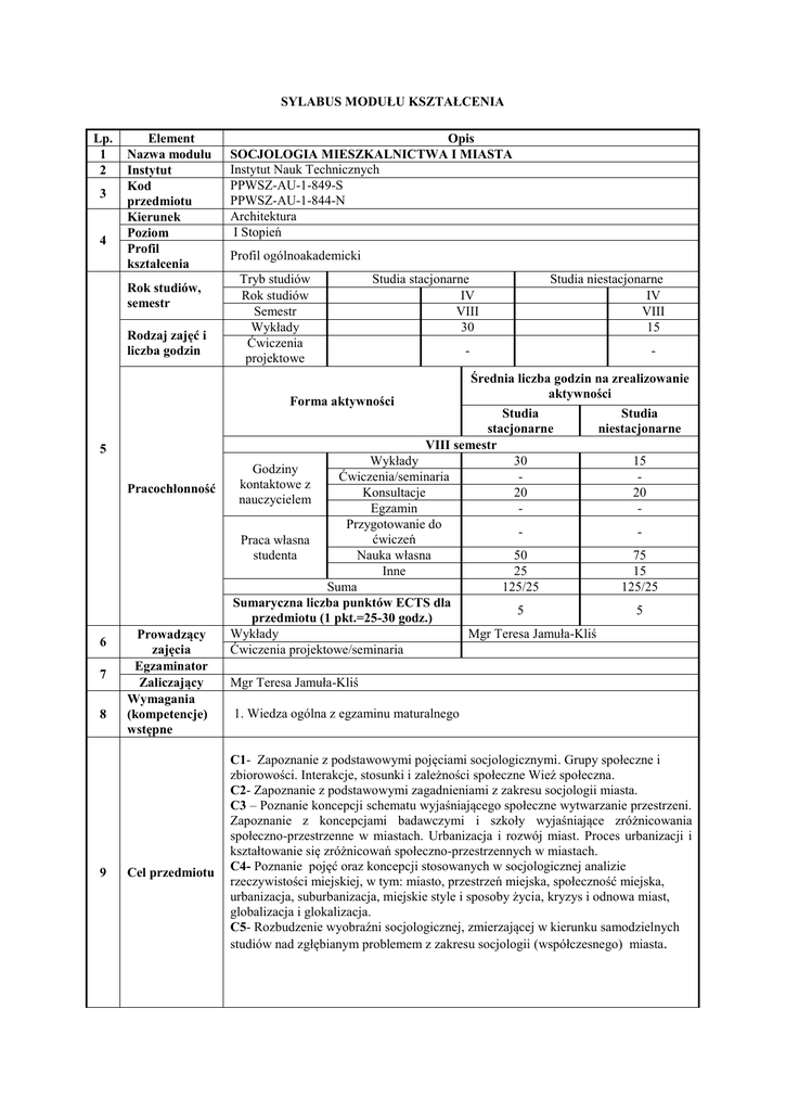 SYLABUS MODUŁU KSZTAŁCENIA Lp. 1 2 3 4 Element Nazwa modułu Instytut Kod przedmiotu Kierunek Poziom Profil kształcenia Rok studiów, semestr Rodzaj zajęć i liczba godzin Opis SOCJOLOGIA MIESZKALNICTWA I MIASTA Instytut Nauk Technicznych PPWSZ-AU-1-849-S PPWSZ-AU-1-844-N Architektura I Stopień Profil ogólnoakademicki Tryb studiów Rok studiów Semestr Wykłady Ćwiczenia projektowe Studia stacjonarne IV VIII 30 Forma aktywności 5 Pracochłonność 6 7 8 9 Prowadzący zajęcia Egzaminator Zaliczający Wymagania (kompetencje) wstępne Cel przedmiotu - Studia niestacjonarne IV VIII 15 - Średnia liczba godzin na zrealizowanie aktywności Studia Studia stacjonarne niestacjonarne VIII semestr Wykłady 30 15 Godziny Ćwiczenia/seminaria kontaktowe z Konsultacje 20 20 nauczycielem Egzamin Przygotowanie do ćwiczeń Praca własna studenta Nauka własna 50 75 Inne 25 15 Suma 125/25 125/25 Sumaryczna liczba punktów ECTS dla 5 5 przedmiotu (1 pkt.=25-30 godz.) Wykłady Mgr Teresa Jamuła-Kliś Ćwiczenia projektowe/seminaria Mgr Teresa Jamuła-Kliś 1. Wiedza ogólna z egzaminu maturalnego C1- Zapoznanie z podstawowymi pojęciami socjologicznymi. Grupy społeczne i zbiorowości. Interakcje, stosunki i zależności społeczne Wieź społeczna. C2- Zapoznanie z podstawowymi zagadnieniami z zakresu socjologii miasta. C3 – Poznanie koncepcji schematu wyjaśniającego społeczne wytwarzanie przestrzeni. Zapoznanie z koncepcjami badawczymi i szkoły wyjaśniające zróżnicowania społeczno-przestrzenne w miastach. Urbanizacja i rozwój miast. Proces urbanizacji i kształtowanie się zróżnicowań społeczno-przestrzennych w miastach. C4- Poznanie pojęć oraz koncepcji stosowanych w socjologicznej analizie rzeczywistości miejskiej, w tym: miasto, przestrzeń miejska, społeczność miejska, urbanizacja, suburbanizacja, miejskie style i sposoby życia, kryzys i odnowa miast, globalizacja i glokalizacja. C5- Rozbudzenie wyobraźni socjologicznej, zmierzającej w kierunku samodzielnych studiów nad zgłębianym problemem z zakresu socjologii (współczesnego) miasta. Efekt (Wiedza, Umiejętności, Kompetencje społeczne) W1 Wiedza W2 W3 Zna i rozumie podstawowe pojęcia socjologiczne Zna sens pojęć oraz koncepcji stosowanych w socjologicznej analizie rzeczywistości miejskiej Zna i rozumie nowe procesu i formy organizowania życia społecznego w przestrzeni miejskiej. Odniesienie do efektów kierunkowych Odniesienie do efektów obszarowych T1A_W05 K_W01 InzA_W03 T1A_W03 K_W06 InzA_W01 K_W14 T1A_W03 T1A_W04 InzA_W03 T1A_U01 10 U1 Efekty kształcenia Potrafi wykorzystywać w analizie zjawisk i procesów społecznych pojęcia z zakresu socjologii ogólnej i socjologii miasta T1A_U08 K_U01 T1A_U13 InzA_U01 Umiejętność U2 U3 U4 Kompetencje społeczne Efekt kształcenia W1 W2 11 Forma i warunki potwierdzenia efektu kształcenia W3 U1 Treści merytoryczne przedmiotu K_U05 T1A_U05 InzA_U04 T1A_U13 K_U04 InzA_U02 K_U11 K_K04 T1A_U05 T1A_K02 T1A_K07 Sposób potwierdzenia (weryfikacji) Prawidłowe stosowanie pojęć socjologicznych - praca semestralna Ciekawa, własna koncepcja, przemian współczesnej przestrzeni miejskiej – praca semestralna W pracy przedstawione odpowiednie przykłady form organizowania życia społecznego - Pozytywna ocena z pracy semestralnej. Prawidłowo dokona samodzielnej analizy zjawisk zachodzących w społecznej przestrzeni miast. Poprawnie zastosuje pojęcia socjologiczne Praca podparta własnymi przemyśleniami i wnioskami. Poszanowanie prawa autorskiego w pracy, samodzielne napisanie K1 pracy. 1. Socjologia, socjologia miasta. 2. Socjologiczne pojęcie przestrzeni 3. Interakcje człowieka z miejscem 4. Czas społeczny i jego atrybuty w przestrzeni miasta i wsi. 5. Społeczno-kulturowy rytm życia – relacje z architekturą i urbanistyką. 6. Architektura i urbanistyka jako czynnik oddziaływania na życie społeczne i zachowania jednostek. U2 U3 U4 12 K1 Potrafi zinterpretować i przeanalizować relacje pomiędzy teorią i praktyką życia miejskiego Potrafi samodzielnie dokonać analizy przemian zachodzących we współczesnej przestrzeni miejskiej. ma umiejętność samokształcenia się, m.in. w celu podnoszenia kompetencji zawodowych Ma świadomość ważności i rozumie pozatechniczne aspekty i skutki działalności inżynieraarchitekta. 7. Klasyfikacje i typologie stylu życia. Subiektywne i obiektywne wskaźniki jakości życia w architekturze i urbanistyce. 8. Społeczne wytwarzanie przestrzeni 9. Koncepcje przestrzeni. 10. Rodzaje przestrzeni 11. Elementy schematu wyjaśniającego społeczne wytwarzanie przestrzeni. 12. Teorie urbanizmu 13. Cechy nowoczesnego urbanizmu 14. Kierunki rozwoju miast. Miasta w kryzysie. Odnowa miast 15.Współczesna przestrzeń miejska 16. Miasta a globalizacja 13 Forma i warunki zaliczenia modułu, w tym zasady dopuszczenia do zaliczenia 14 Wykaz literatury podstawowej 15 Wykaz literatury uzupełniającej (pomocniczej) Zaliczenie przedmiotu na podstawie obecności na zajęciach oraz zaliczenia pisemnego 1. Bohdan Jałowiecki „Społeczne wytwarzanie przestrzeni” SCHOLAR Warszawa 2010 2. Andrzej Majer „Socjologia i przestrzeń miejska” PWN Warszawa 2010 3. Antony Giddens „Socjologia” PWN Warszawa 2004 1. Wallis A., Socjologia i kształtowanie przestrzeni.” PWN Warszawa 1971 2. Wallis A., „Miasto i przestrzeń”. PWN Warszawa 1977