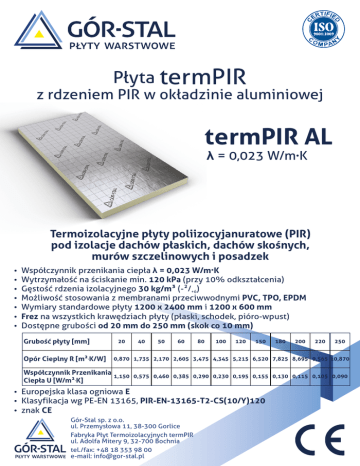 Płyta termPIR z rdzeniem PIR w okładzinie aluminiowej termPIR AL λ = 0,023 W/m•K Termoizolacyjne płyty poliizocyjanuratowe (PIR) pod izolacje dachów płaskich, dachów skośnych, murów szczelinowych i posadzek ź ź ź ź ź ź ź Współczynnik przenikania ciepła λ = 0,023 W/m•K Wytrzymałość na ściskanie min. 120 kPa (przy 10% odkształcenia) Gęstość rdzenia izolacyjnego 30 kg/m (-/+6) Możliwość stosowania z membranami przeciwwodnymi PVC, TPO, EPDM Wymiary standardowe płyty 1200 x 2400 mm i 1200 x 600 mm Frez na wszystkich krawędziach płyty (płaski, schodek, pióro-wpust) Dostępne grubości od 20 mm do 250 mm (skok co 10 mm) Grubość płyty [mm] 20 40 50 60 80 100 120 150 180 200 220 250 Opór Cieplny R [m·K/W] 0,870 1,735 2,170 2,605 3,475 4,345 5,215 6,520 7,825 8,695 9,565 10,870 Współczynnik Przenikania Ciepła U [W/m·K] 1,150 0,575 0,460 0,385 0,290 0,230 0,195 0,155 0,130 0,115 0,105 0,090 ź Europejska klasa ogniowa E ź Klasyfikacja wg PE-EN 13165, PIR-EN-13165-T2-CS(10/Y)120 ź znak CE Gór-Stal sp. z o.o. ul. Przemysłowa 11, 38-300 Gorlice Fabryka Płyt Termoizolacyjnych termPIR ul. Adolfa Mitery 9, 32-700 Bochnia tel./fax: +48 18 353 98 00 e-mail: [email protected]