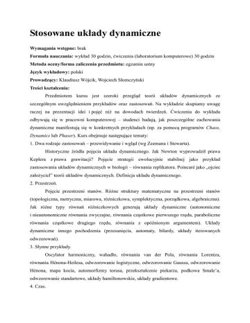 Stosowane układy dynamiczne Wymagania wstępne: brak Formuła nauczania: wykład 30 godzin, ćwiczenia (laboratorium komputerowe) 30 godzin Metoda oceny/forma zaliczenia przedmiotu: egzamin ustny Język wykładowy: polski Prowadzący: Klaudiusz Wójcik, Wojciech Słomczyński Treści kształcenia: Przedmiotem kursu jest szeroki przegląd teorii układów dynamicznych ze szczególnym uwzględnieniem przykładów oraz zastosowań. Na wykładzie skupiamy uwagę raczej na prezentacji idei i pojęć niż na dowodach twierdzeń. Ćwiczenia do wykładu odbywają się w pracowni komputerowej – studenci badają, jak poszczególne zachowania dynamiczne manifestują się w konkretnych przykładach (np. za pomocą programów Chaos, Dynamics lub Phaser). Kurs obejmuje następujące tematy: 1. Dwa rodzaje zastosowań – przewidywanie i wgląd (wg Zeemana i Stewarta). Historyczne źródła pojęcia układu dynamicznego. Jak Newton wyprowadził prawa Keplera z prawa grawitacji? Pojęcie strategii ewolucyjnie stabilnej jako przykład zastosowania układów dynamicznych w biologii – równania replikatora. Poincaré jako „ojciec założyciel” teorii układów dynamicznych. Definicja układu dynamicznego. 2. Przestrzeń. Pojęcie przestrzeni stanów. Różne struktury matematyczne na przestrzeni stanów (topologiczna, metryczna, miarowa, różniczkowa, symplektyczna, porządkowa, algebraiczna). Jak różne typy równań różniczkowych generują układy dynamiczne (autonomiczne i nieautonomiczne równania zwyczajne, równania cząstkowe pierwszego rzędu, paraboliczne równania cząstkowe drugiego rzędu, równania z opóźnionym argumentem). Układy dynamiczne innego pochodzenia (przesunięcia, automaty, bilardy, układy iterowanych odwzorowań). 3. Słynne przykłady. Oscylator harmoniczny, wahadło, równania van der Pola, równania Lorentza, równania Hénona-Heilesa, odwzorowanie logistyczne, odwzorowanie Gaussa, odwzorowanie Hénona, mapa kocia, automorfizmy torusa, przekształcenie piekarza, podkowa Smale’a, odwzorowanie standartowe, układy hamiltonowskie, układy gradientowe. 4. Czas. Czas dyskretny i ciągły. Obraz stroboskopowy potoku. Sekcje i odwzorowania Poincarégo. Zawieszenia i potoki specjalne. 5. Pojęcia. Punkty stacjonarne, okresowe i prawie okresowe. Zbiory graniczne. Rozmaitości stabilne i niestabilne. Punkty powracające i niebłądzące. Zbiory niezmiennicze i minimalne. Tranzytywność. Topologiczne mieszanie. 6. Stabilność. Stabilność trajektorii: stabilność w sensie Lapunowa, stabilność w sensie Lagrange’a, trwałość. Atraktory: punkty przyciągające, cykle graniczne, dziwne atraktory, baseny przyciągania, fraktale. 7. Stabilność strukturalna. Izomorfizm. Dynamika symboliczna. Własności typowe i stabilność strukturalna. Dogmat stabilności (Abraham, Marsden). Program klasyfikacyjny Zeemana. Bifurkacje i katastrofy: bifurkacja Hopfa, katastrofa „zmarszczka”. 8. Układy regularne. Punkty okresowe i prawie okresowe. Układy dynamiczne na zbiorach skończonych. Przekształcenia okręgu. Ciągłe układy dynamiczne na powierzchniach dwuwymiarowych. Układy monotoniczne w sensie Hirscha. 9. Układy chaotyczne – podejście topologiczne. Czuła zależność od warunków początkowych. Entropia topologiczna. Definicje chaosu. Punkty homokliniczne. Aksjomat A. Hiperboliczność i strukturalna stabilność. 10. Układy chaotyczne – podejście statystyczne. Operatory Koopmana i Frobeniusa-Perrona, miary niezmiennicze. Wykładniki Lapunowa, entropia metryczna, wymiar atraktora. Hierarchia zachowań chaotycznych: ergodyczność, mieszanie, własność Kołmogorowa. Miary SRB (Sinai-Ruelle-Bowen) i miary SLYRB (Sinai-Lasota-Yorke-Ruelle-Bowen). Zalecana literatura: Literatura podstawowa – książki: 1. R.H. Abraham, L. Gardini, Ch. Mira, Chaos in discrete dynamical systems: a visual introduction in 2 dimensions, Springer/TELOS, Santa Clara 1997. 2. K.T. Alligood, T.D. Sauer, J.A. Yorke, Chaos: an introduction to dynamical systems. Springer. New York 2000. 3. G.L. Baker, J.P. Gollub, Wstęp do dynamiki układów chaotycznych, PWN, Warszawa 1998 (z dyskietką do programu Chaos). 4. M. Brin, G. Stuck, Introduction to Dynamical Systems, Cambridge UP, Cambridge 2002. 5. J. Gleick, Chaos, Zysk i S-ka, Warszawa 1996. 6. M.W. Hirsch, S. Smale, R.L. Devaney, Differential Equations, Dynamical Systems and an Introduction to Chaos, Elsevier, San Diego 2004. 7. J. Hofbauer, K. Sigmund, The Theory of Evolution and Dynamical Systems, Cambridge UP, Cambridge 1988. 8. A. Katok, B. Hasselblatt, A First Course in Dynamics, Cambridge UP, Cambridge 2003. 9. H. Koçak, Równania różniczkowe i różnicowe poprzez eksperymenty komputerowe, Cyfronet, Kraków 1991 (wprowadzenie do programu Phaser). 10. A. Lasota, M. Mackey, Chaos, Fractals, and Noise: Stochastic Aspects of Dynamics, Springer-Verlag. New York 1994. 11. H.E. Nusse, J.A. Yorke, Dynamika: Badania numeryczne, PWN, Warszawa 1999 (z dyskietką do programu Dynamics). 12. E. Ott, Chaos w układach dynamicznych, WNT, Warszawa 1997. 13. A. Pelczar, Wstęp do teorii równań różniczkowych. Część II. Elementy jakościowej teorii równań różniczkowych, PWN, Warszawa 1989. 14. Encyclopedia of dynamical systems, dostępna on-line: http://www.scholarpedia.org/article/Encyclopedia_of_dynamical_systems 15. H.G. Schuster, Chaos deterministyczny, PWN, Warszawa 1993. 16. K. Stefański, Mechanika teoretyczna, WNT, Warszawa 1999. 17. I. Stewart, Czy Bóg gra w kości? Nowa matematyka chaosu, PWN, Warszawa 2001. 18. T. Tél, M. Gruiz, Chaotic Dynamics: An Introduction Based on Classical Mechanics, Cambridge UP, Cambridge 2006. 19. S. Wiggins, Introduction to Applied Nonlinear Dynamical Systems and Chaos, Springer-Verlag, New York 1990. Literatura podstawowa – prace: 1. M.W. Hirsch, The dynamical system approach to differential equations, Bull. Am. Math. Soc. 11 (1984), 1-64. 2. B.R. Hunt, J.A. Kennedy, T.-Y. Li, H.E. Nusse