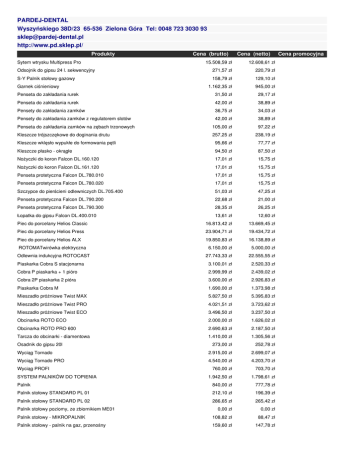 PARDEJ-DENTAL Wyszyńskiego 38D/23 65-536 Zielona Góra Tel: 0048 723 3030 93 [email protected] http://www.pd.sklep.pl/ Produkty Sytem wtrysku Multipress Pro Odsojnik do gipsu 24 l. sekwencyjny S-Y Palnik stołowy gazowy Cena (brutto) Cena (netto) 15.508,59 zł 12.608,61 zł 271,57 zł 220,79 zł 158,79 zł 129,10 zł 1.162,35 zł 945,00 zł Penseta do zakładania rurek 31,50 zł 29,17 zł Penseta do zakładania rurek 42,00 zł 38,89 zł Pensety do zakładania zamków 36,75 zł 34,03 zł Garnek ciśnieniowy Pensety do zakładania zamków z regulatorem slotów 42,00 zł 38,89 zł Penseta do zakładania zamków na zębach trzonowych 105,00 zł 97,22 zł Kleszcze trójszczękowe do doginania drutu 257,25 zł 238,19 zł Kleszcze wklęsło wypukłe do formowania pętli 95,66 zł 77,77 zł Kleszcze płasko - okrągłe 94,50 zł 87,50 zł Nożyczki do koron Falcon DL.160.120 17,01 zł 15,75 zł Nożyczki do koron Falcon DL.161.120 17,01 zł 15,75 zł Penseta protetyczna Falcon DL.780.010 17,01 zł 15,75 zł Penseta protetyczna Falcon DL.780.020 17,01 zł 15,75 zł Szczypce do pierścieni odlewniczych DL.705.400 51,03 zł 47,25 zł Penseta protetyczna Falcon DL.790.200 22,68 zł 21,00 zł Penseta protetyczna Falcon DL.790.300 28,35 zł 26,25 zł Łopatka do gipsu Falcon DL.400.010 13,61 zł 12,60 zł Piec do porcelany Helios Classic 16.813,42 zł 13.669,45 zł Piec do porcelany Helios Press 23.904,71 zł 19.434,72 zł Piec do porcelany Helios ALX 19.850,83 zł 16.138,89 zł 6.150,00 zł 5.000,00 zł ROTOMATwirówka elektryczna Odlewnia indukcyjna ROTOCAST 27.743,33 zł 22.555,55 zł Piaskarka Cobra S stacjonarna 3.100,01 zł 2.520,33 zł Cobra P piaskarka + 1 pióro 2.999,99 zł 2.439,02 zł Cobra 2P piaskarka 2 pióra 3.600,00 zł 2.926,83 zł Piaskarka Cobra M 1.690,00 zł 1.373,98 zł Mieszadło próżniowe Twist MAX 5.827,50 zł 5.395,83 zł Mieszadło próżniowe Twist PRO 4.021,51 zł 3.723,62 zł Mieszadło próżniowe Twist ECO 3.496,50 zł 3.237,50 zł Obcinarka ROTO ECO 2.000,00 zł 1.626,02 zł Obcinarka ROTO PRO 600 2.690,63 zł 2.187,50 zł Tarcza do obcinarki - diamentowa 1.410,00 zł 1.305,56 zł Osadnik do gipsu 20l 273,00 zł 252,78 zł Wyciąg Tornado 2.915,00 zł 2.699,07 zł Wyciąg Tornado PRO 4.540,00 zł 4.203,70 zł Wyciąg PROFI 760,00 zł 703,70 zł 1.942,50 zł 1.798,61 zł Palnik 840,00 zł 777,78 zł Palnik stołowy STANDARD PL 01 212,10 zł 196,39 zł Palnik stołowy STANDARD PL 02 286,65 zł 265,42 zł 0,00 zł 0,00 zł SYSTEM PALNIKÓW DO TOPIENIA Palnik stołowy poziomy, ze zbiornikiem ME01 Palnik stołowy - MIKROPALNIK 108,82 zł 88,47 zł Palnik stołowy - palnik na gaz, przenośny 159,60 zł 147,78 zł Cena promocyjna Pinarka PINAX 3.570,00 zł 3.305,56 zł Formierz Formax 2.830,00 zł 2.620,37 zł Mikrosilnik MARATHON MULTI 600 2.824,50 zł 2.615,28 zł Mikrosilnik MARATHON N7 Frezarka ERGOSTAR Frezarka ECOSTAR 1.354,49 zł 1.254,16 zł 13.755,00 zł 12.736,11 zł 5.302,51 zł 4.909,73 zł Wibrator Q2 660,00 zł 611,11 zł Wibrator Q4 920,00 zł 851,85 zł Osadnik do gipsu 35l 378,00 zł 350,00 zł Ramka z puszkami do polimeryzacji zestaw 490,00 zł 398,37 zł