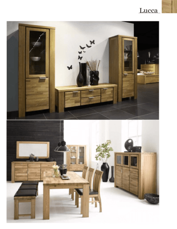 Lucca Lucca 4 KD KD KD KD Meble wykonane z masywu drewna dębowego 14530600 RA Blat: 45 mm. Zestaw stolików (kpl.3 szt.) Uchwyty metalowe 50/40/30x50/45/40x50/40/30cm Olejowane (zastosowany bio-olej) Zastosowana bezpieczna szyba Krzesła: zastosowana mikrofibra lub skóra-bycast, materiał trudnopalny 14510600 KD Stolik pod lampę 60x45x60cm 14130600 KD Ławka 164x45x40cm 16000523 Poduszka (skóra-bycast) 44x3x43cm 14120600 Lustro 140x81x3cm Lucca 14540600 RA 14740600 KD Komoda (2 drzwi, 2 szuflady) 128x92x48cm 14500600 KD Stół kawowy (1x szuflada) 110x45x70cm 14070600 RA 14060600 KD Komoda (3 drzwi, 3 szuflady) 180x92x48cm 14100600 KD 90x75x180cm 14490600 KD 90x75x140cm Stół 14110600 Dostawka do stołu 90x45cm 14520600 KD Toaletka (2 półki) 130x90x35 14010600 RA 14000600 KD Komoda wysoka (3+3 drzwi) 160x140x48cm 12860601 KD Krzesło Lecco (mokrofibra) 46x96x51cm 14030602 RA 14020600 KD Witryna szeroka 130x190x48cm Lucca 15500600 KD Szafa ubraniowa 2 drzwiowa 118x206x60cm 15510600 KD Szafa ubraniowa 3 drzwiowa 164x206x60cm 15520600 KD Szafa ubraniowa 5 drzwiowa 258x206x60cm 15470600 RA 15460600 KD Szafka (słupek, 5 szuflad) 63x132x45cm 15450600 RA 15440600 KD Szafka nocna (2 szuflady) 55x51x43cm 15490600 RA 15480600 KD Komoda (2+2 szuflady) 100x86x45cm 14050600 RA 14040600 KD Komoda TV (2 drzwi, 2 szuflady) 150x50x48cm 14090600 RA 14080600 KD Witryna 70x190x39cm
