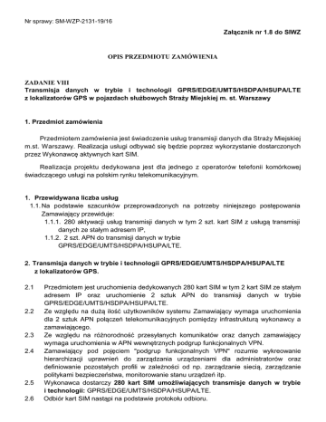 Nr sprawy: SM-WZP-2131-19/16 Załącznik nr 1.8 do SIWZ OPIS PRZEDMIOTU ZAMÓWIENIA ZADANIE VIII Transmisja danych w trybie i technologii GPRS/EDGE/UMTS/HSDPA/HSUPA/LTE z lokalizatorów GPS w pojazdach służbowych Straży Miejskiej m. st. Warszawy 1. Przedmiot zamówienia Przedmiotem zamówienia jest świadczenie usług transmisji danych dla Straży Miejskiej m.st. Warszawy. Realizacja usługi odbywać się będzie poprzez wykorzystanie dostarczonych przez Wykonawcę aktywnych kart SIM. Realizacja projektu dedykowana jest dla jednego z operatorów telefonii komórkowej świadczącego usługi na polskim rynku telekomunikacyjnym. 1. Przewidywana liczba usług 1.1. Na podstawie szacunków przeprowadzonych na potrzeby niniejszego postępowania Zamawiający przewiduje: 1.1.1. 280 aktywacji usług transmisji danych w tym 2 szt. kart SIM z usługą transmisji danych ze stałym adresem IP, 1.1.2. 2 szt. APN do transmisji danych w trybie GPRS/EDGE/UMTS/HSDPA/HSUPA/LTE. 2. Transmisja danych w trybie i technologii GPRS/EDGE/UMTS/HSDPA/HSUPA/LTE z lokalizatorów GPS. 2.1 2.2 2.3 2.4 2.5 2.6 Przedmiotem jest uruchomienia dedykowanych 280 kart SIM w tym 2 kart SIM ze stałym adresem IP oraz uruchomienie 2 sztuk APN do transmisji danych w trybie GPRS/EDGE/UMTS/HSDPA/HSUPA/LTE. Ze względu na dużą ilość użytkowników systemu Zamawiający wymaga uruchomienia dla 2 sztuk APN połączeń telekomunikacyjnych pomiędzy infrastrukturą wykonawcy a zamawiającego. Ze względu na różnorodność przesyłanych komunikatów oraz danych zamawiający wymaga uruchomienia w APN wewnętrznych podgrup funkcjonalnych VPN. Zamawiający pod pojęciem "podgrup funkcjonalnych VPN" rozumie wykreowanie hierarchizacji uprawnień do zarządzania urządzeniami dla administratorów oraz definiowanie pozostałych profili w zależności od np. zarządzanie siecią, zarządzanie politykami bezpieczeństwa, monitorowanie stanu urządzeń itp. Wykonawca dostarczy 280 kart SIM umożliwiających transmisje danych w trybie i technologii: GPRS/EDGE/UMTS/HSDPA/HSUPA/LTE. Odbiór kart SIM nastąpi na podstawie protokołu odbioru. 2.7 Zamawiający wymaga dodatkowo dostarczenia 10 szt. nieaktywnych kart SIM stanowiących bufor serwisowy. Karty te będą aktywowane po telefonicznym zgłoszeniu przez zamawiającego lub za pomocą systemu obsługi abonenta. 2.8 Aktywacja kart z zachowaniem numeru MSISDN, odpowiedniego APN/VPN ma nastąpić maksymalnie do 6 godzin od momentu zgłoszenia. 2.9 Nieaktywne (serwisowe) karty SIM będą dostarczone wraz z kartami aktywnymi. Po okresie umowy niewykorzystane karty zostaną zwrócone wykonawcy. 2.10 Usługa transmisji danych w sieci GSM obejmuje: a) uruchomienie specjalizowanych kart SIM, b) uruchomienie połączenia do węzła sieci telekomunikacyjnej zamawiającego zlokalizowanego w Warszawie przy ul. Młynarskiej 43/45 oraz w lokalizacji centrum zapasowego przy ul. Klimczaka 4, c) uruchomienie wydzielonej od innych abonentów wykonawcy grupy APN oraz podgrup APN (VPN). 2.11 a) Zamawiający wymaga, aby w przypadku awarii łącza podstawowego Wykonawca realizował przełączanie na łącze zapasowe we własnej infrastrukturze, b) Przełączenie ruchu powinno być zrealizowane w sposób zapewniający możliwość komunikacji bez konieczności zmiany używanych w danym momencie adresów IP Zamawiającego oraz bez jego ingerencji. 2.12 2.13 2.14 2.15 2.16 2.17 Wykonawca uruchomi łącze o prędkości minimum 10 Mbps, zakończone stykiem Ethernet RJ45. Zamawiający dopuszcza zastosowanie każdego rodzaju medium transmisyjnego z wyłączeniem kanałów w sieci Internet. Zamawiający wymaga dla każdego z łączy roczną dostępność usługi (RDU) na poziomie 99,4%. Zamawiający zapewni w swojej siedzibie niezbędne urządzenia brzegowe oraz interfejsy w celu przyjęcia łączy od wykonawcy. Za poprawną konfigurację urządzeń po stronie Zamawiającego będzie odpowiadał pracownik służb technicznych Straży Miejskiej m. st. Warszawy. Wykonawca zobowiązuje się do dostarczenia wszelkich elementów systemu, zarówno sprzętowych jak i programowych, których posiadanie zapewni osiągnięcie przez Zamawiającego cech rozwiązania końcowego z wyjątkiem niezbędnych urządzeń brzegowych oraz interfejsów służących do przyjęcia usługi od Wykonawcy, które zapewni Zamawiający. 2.18 2.19 2.20 2.21 2.22 2.23 2.24 2.25 2.26 2.27 2.28 2.29 2.30 Wykonawca uruchomi transmisję w sieci GSM w standardzie GPRS/EDGE/UMTS/HSDPA/HSUPA/LTE. Dostarczone karty SIM muszą spełniać następujące wymagania: a) numeracja MSISDN z puli wykonawcy, b) dostarczone karty SIM muszą być bez PIN'u, Dostawa kart SIM musi nastąpić najpóźniej do 7 dni od daty podpisania umowy. Do dostarczonych kart SIM i urządzeń wykonawca dołączy wykaz (w wersji elektronicznej, w formacie Excel) zawierający: nr karty SIM, przypisane numery abonenckie MSISDN. Wykonawca zapewni aktywację kart SIM w terminie od dnia 01.01.2017r. Wszystkie (z wyjątkiem transmisji danych w APN) dodatkowe kanały komunikacyjne muszą być wyłączone na dostarczonych kartach SIM, w tym transmisja głosu, przekazywanie SMS, MMS, roaming. Zamawiający w trakcie trwania umowy zastrzega sobie możliwość uruchomienia na wskazanych kartach SIM, wybranych kanałów komunikacyjnych. W takiej sytuacji Wykonawca uruchomi je nie później niż w ciągu 24 godzin od pisemnego zgłoszenia. Nazwy APN/VPN oraz adresy IP zamawiającego zostaną przekazane po podpisaniu umowy, na etapie tworzenia projektu technicznego. Zamawiający dopuszcza możliwość niepełnego pokrycia terytorium m.st. Warszawy w zasięg usługi pakietowej transmisji danych. Zasięg usługi dla całego terytorium miasta nie może jednak być mniejszy niż 90%. Zamawiający przewiduje, że ilość przesłanych danych na każdą kartę SIM w ciągu miesiąca nie przekroczy 30 GB. Wykonawca uruchomi i skonfiguruje wymagany APN, w tym podgrupy APN (VPN) w ilości nie większej niż 8 w terminie
