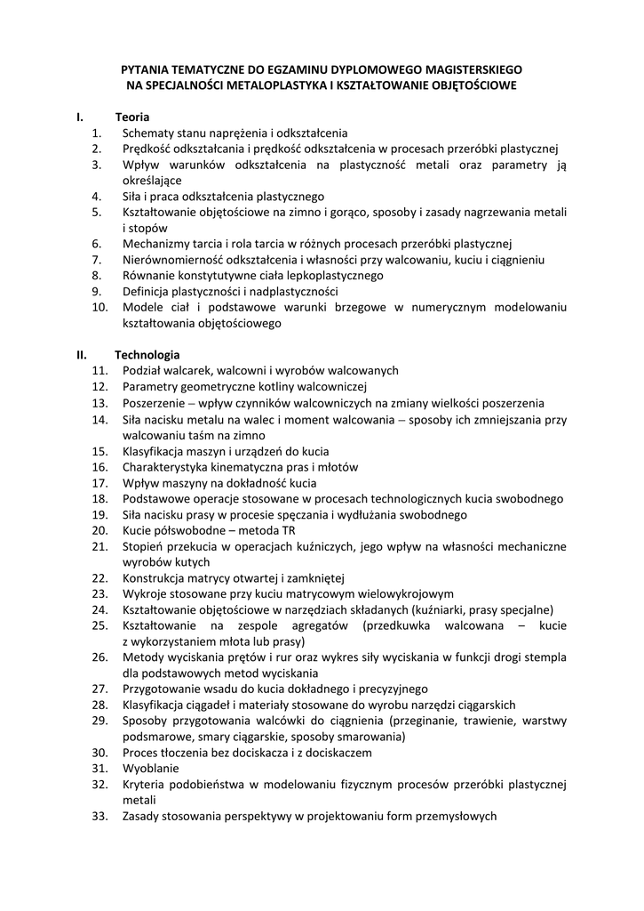 PYTANIA TEMATYCZNE DO EGZAMINU DYPLOMOWEGO MAGISTERSKIEGO NA SPECJALNOŚCI METALOPLASTYKA I KSZTAŁTOWANIE OBJĘTOŚCIOWE I. Teoria Schematy stanu naprężenia i odkształcenia Prędkość odkształcania i prędkość odkształcenia w procesach przeróbki plastycznej Wpływ warunków odkształcenia na plastyczność metali oraz parametry ją określające 4. Siła i praca odkształcenia plastycznego 5. Kształtowanie objętościowe na zimno i gorąco, sposoby i zasady nagrzewania metali i stopów 6. Mechanizmy tarcia i rola tarcia w różnych procesach przeróbki plastycznej 7. Nierównomierność odkształcenia i własności przy walcowaniu, kuciu i ciągnieniu 8. Równanie konstytutywne ciała lepkoplastycznego 9. Definicja plastyczności i nadplastyczności 10. Modele ciał i podstawowe warunki brzegowe w numerycznym modelowaniu kształtowania objętościowego 1. 2. 3. II. 11. 12. 13. 14. 15. 16. 17. 18. 19. 20. 21. 22. 23. 24. 25. 26. 27. 28. 29. 30. 31. 32. 33. Technologia Podział walcarek, walcowni i wyrobów walcowanych Parametry geometryczne kotliny walcowniczej Poszerzenie wpływ czynników walcowniczych na zmiany wielkości poszerzenia Siła nacisku metalu na walec i moment walcowania sposoby ich zmniejszania przy walcowaniu taśm na zimno Klasyfikacja maszyn i urządzeń do kucia Charakterystyka kinematyczna pras i młotów Wpływ maszyny na dokładność kucia Podstawowe operacje stosowane w procesach technologicznych kucia swobodnego Siła nacisku prasy w procesie spęczania i wydłużania swobodnego Kucie półswobodne – metoda TR Stopień przekucia w operacjach kuźniczych, jego wpływ na własności mechaniczne wyrobów kutych Konstrukcja matrycy otwartej i zamkniętej Wykroje stosowane przy kuciu matrycowym wielowykrojowym Kształtowanie objętościowe w narzędziach składanych (kuźniarki, prasy specjalne) Kształtowanie na zespole agregatów (przedkuwka walcowana – kucie z wykorzystaniem młota lub prasy) Metody wyciskania prętów i rur oraz wykres siły wyciskania w funkcji drogi stempla dla podstawowych metod wyciskania Przygotowanie wsadu do kucia dokładnego i precyzyjnego Klasyfikacja ciągadeł i materiały stosowane do wyrobu narzędzi ciągarskich Sposoby przygotowania walcówki do ciągnienia (przeginanie, trawienie, warstwy podsmarowe, smary ciągarskie, sposoby smarowania) Proces tłoczenia bez dociskacza i z dociskaczem Wyoblanie Kryteria podobieństwa w modelowaniu fizycznym procesów przeróbki plastycznej metali Zasady stosowania perspektywy w projektowaniu form przemysłowych
