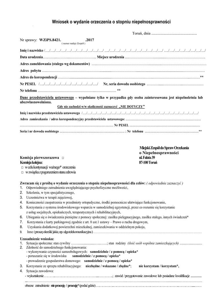 Wniosek o wydanie orzeczenia o stopniu niepełnosprawności 4 Toruń, dnia ............................................... Nr sprawy: WZiPS.8421. .2017 ( numer nadaje Zespół ) Imię i nazwisko /…./…./…./…./…./…./…./…./…./…./…./ …./…./…./…./…./…./…./…./…./…./…./ …./…./…./…./…./…./…./…/ Data urodzenia….……...………...………………….. Miejsce urodzenia .....…………………..............……………………………. Adres zameldowania (stałego wg dokumentów) …..………………………………………..............………………………………… Adres pobytu …..………………………………………..............………………….......................................................……………… Adres do korespondencji ….…….................................................……………………….……..…………………………..………** Nr PESEL /…./…./…./…./…./…./…./…./…./…./…./ Nr, seria dowodu osobistego .………......……………..……………… Nr telefonu …………………………………………..……………… ** Dane przedstawiciela ustawowego – wypełniane tylko w przypadku gdy osoba zainteresowana jest niepełnoletnia lub ubezwłasnowolniona. Gdy nie zachodzi w/w okoliczność zaznaczyć „NIE DOTYCZY ” Imię i nazwisko przedstawiciela ustawowego /…./…./…./…./…./…./…./…./…./…./…./…./…./…./…./…./…./…./…./…./…./…./…./…./ Adres zamieszkania / adres korespondencyjny przedstawiciela ustawowego: ............................................................................................... ...................................................................................................................... Nr PESEL ......................................................................................... Seria i nr dowodu osobistego .................................................................................. ; Nr telefonu ....................................................................** Komisja pierwszorazowa □ Komisja kolejna: □ w celu kontynuacji ważnego* orzeczenia □ w związku z pogorszeniem stanu zdrowia Miejski Zespół do Spraw Orzekania o Niepełnosprawności ul. Fałata 39 87-100 Toruń Zwracam się z prośbą o wydanie orzeczenia o stopniu niepełnosprawności dla celów: ( odpowiednie zaznaczyć ) 1. Odpowiedniego zatrudnienia uwzględniającego psychofizyczne możliwości, 2. Szkolenia, w tym specjalistycznego, 3. Uczestnictwa w terapii zajęciowej, 4. Konieczności zaopatrzenia w przedmioty ortopedyczne, środki pomocnicze ułatwiające funkcjonowanie, 5. Korzystania z systemu środowiskowego wsparcia w samodzielnej egzystencji, przez co rozumie się korzystanie z usług socjalnych, opiekuńczych, terapeutycznych i rehabilitacyjnych, 6. Ubiegania się o świadczenia pieniężne z pomocy społecznej: zasiłku pielęgnacyjnego, zasiłku stałego, innych świadczeń* 7. Korzystania z karty parkingowej zgodnie z art. 8 ust.1 ustawy – Prawo o ruchu drogowym, 8. Uzyskania dodatkowej powierzchni mieszkalnej, zamieszkiwania w oddzielnym pokoju, 9. Inne ( proszę określić jakie, np. ulga telekomunikacyjna ) . . . . . . . . . . . . . . . . . . . . . . . . . . . . . . . . . . . . . . . . . . . . . . . . . . . . . . . . . . . . . . . . . . . . . . . . . . . . . . . . . . . . . . . . . . . . . . . . . . . . . . . . . . . . . . Uzasadnienie wniosku: 1. Sytuacja społeczna: stan cywilny …….....................…..……; stan rodziny (ilość osób wspólnie zamieszkujących) ........................... 2. Zdolność do samodzielnego funkcjonowania: - wykonywanie czynności samoobsługowych: samodzielnie / z pomocą / opieka* - poruszanie się w środowisku samodzielnie / z pomocą / opieka* - prowadzenie gospodarstwa domowego: samodzielnie / z pomocą / opieka* 3. Korzystanie ze sprzętu rehabilitacyjnego: niezbędne / wskazane / zbędne*; nie korzystam / korzystam*, 4. Sytuacja zawodowa: - wykształcenie ………..………………………………….....…………..; zawód / przygotowanie zawodowe lub posiadane kwalifikacje ................... ....…………………………………................……………………………………..………….........................…….................…………….…… obecne zatrudnienie nie pracuję / pracuję* (podać gdzie) …………….…………………………….……………………..………….....…… Oświadczam, że: 1. Pobieram / nie pobieram* świadczenie z ubezpieczenia społecznego: emerytura, renta, świadczenie przedemerytalne 2. Składałem/nie składałem* uprzednio wniosek o ustalenie niepełnosprawności / stopnia niepełnosprawności: orzeczenie z dnia ….......…..........… niepełnosprawność / stopień ………..................…………..ważne do ……......….......................…/na stałe* wydane przez Miejski/Powiatowy/Wojewódzki* Zespół ds. Orzekania o Stopniu* Niepełnosprawności w …..................................... W przypadku zmiany nazwiska, podać nazwisko na które wydano poprzednie orzeczenie .................................................................... 3. Posiadam /nie posiadam* orzeczenie innego organu orzeczniczego jeśli tak, to podać nazwę organu: (ZUS, KRUS, MSWiA), MON) podać datę wydania orzeczenia …..................................................…...........……….........………………….……………………… 4. Mogę/ nie mogę* przybyć na posiedzenie składu orzekającego. ( Jeżeli nie, to należy załączyć zaświadczenie lekarskie potwierdzające niemożność wzięcia udziału w posiedzeniu z powodu długotrwałej lub nie rokującej poprawy choroby.) 5. Wyrażam zgodę na gromadzenie , utrwalenie oraz przetwarzanie moich danych osobowyc