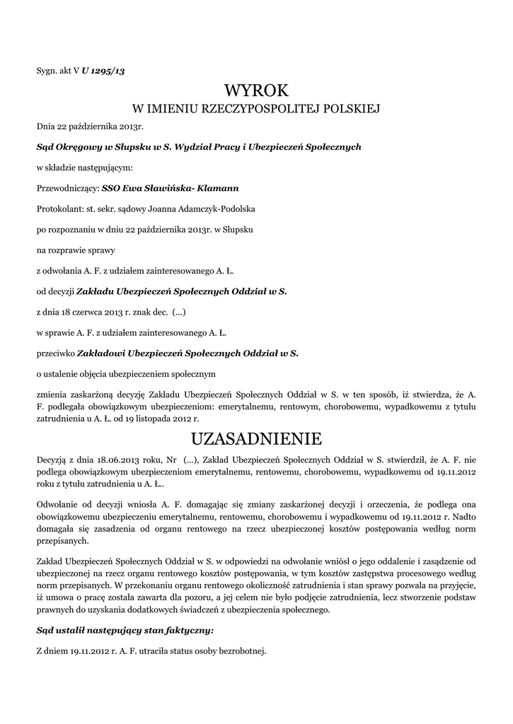 Sygn. akt V U 1295/13 WYROK W IMIENIU RZECZYPOSPOLITEJ POLSKIEJ Dnia 22 października 2013r. Sąd Okręgowy w Słupsku w S. Wydział Pracy i Ubezpieczeń Społecznych w składzie następującym: Przewodniczący: SSO Ewa Sławińska- Klamann Protokolant: st. sekr. sądowy Joanna Adamczyk-Podolska po rozpoznaniu w dniu 22 października 2013r. w Słupsku na rozprawie sprawy z odwołania A. F. z udziałem zainteresowanego A. Ł. od decyzji Zakładu Ubezpieczeń Społecznych Oddział w S. z dnia 18 czerwca 2013 r. znak dec. (...) w sprawie A. F. z udziałem zainteresowanego A. Ł. przeciwko Zakładowi Ubezpieczeń Społecznych Oddział w S. o ustalenie objęcia ubezpieczeniem społecznym zmienia zaskarżoną decyzję Zakładu Ubezpieczeń Społecznych Oddział w S. w ten sposób, iż stwierdza, że A. F. podlegała obowiązkowym ubezpieczeniom: emerytalnemu, rentowym, chorobowemu, wypadkowemu z tytułu zatrudnienia u A. Ł. od 19 listopada 2012 r. UZASADNIENIE Decyzją z dnia 18.06.2013 roku, Nr (...), Zakład Ubezpieczeń Społecznych Oddział w S. stwierdził, że A. F. nie podlega obowiązkowym ubezpieczeniom emerytalnemu, rentowemu, chorobowemu, wypadkowemu od 19.11.2012 roku z tytułu zatrudnienia u A. Ł.. Odwołanie od decyzji wniosła A. F. domagając się zmiany zaskarżonej decyzji i orzeczenia, że podlega ona obowiązkowemu ubezpieczeniu emerytalnemu, rentowemu, chorobowemu i wypadkowemu od 19.11.2012 r. Nadto domagała się zasadzenia od organu rentowego na rzecz ubezpieczonej kosztów postępowania według norm przepisanych. Zakład Ubezpieczeń Społecznych Oddział w S. w odpowiedzi na odwołanie wniósł o jego oddalenie i zasądzenie od ubezpieczonej na rzecz organu rentowego kosztów postępowania, w tym kosztów zastępstwa procesowego według norm przepisanych. W przekonaniu organu rentowego okoliczność zatrudnienia i stan sprawy pozwala na przyjęcie, iż umowa o pracę została zawarta dla pozoru, a jej celem nie było podjęcie zatrudnienia, lecz stworzenie podstaw prawnych do uzyskania dodatkowych świadczeń z ubezpieczenia społecznego. Sąd ustalił następujący stan faktyczny: Z dniem 19.11.2012 r. A. F. utraciła status osoby bezrobotnej. Od dnia 19.11.2012 roku A. F., wykształcenie wyższe-licencjat-turystka i rekreacja, została zatrudniona w (...)A. Ł. na podstawie umowy o pracę z dnia 19.11.2012 r. na stanowisku pracownika biurowego na czas nieokreślony. Wynagrodzenie zasadnicze określono w kwocie najniższej krajowej brutto płatne do 10 dni miesiąca kalendarzowego następującego po miesiącu przepracowanym. Pracodawca od 1983 r. prowadzi firmę. Zatrudnia od 1 do 3 osób. Zakład zajmuje się produkcją worków foliowych i mat do masażu. Pracodawca w sierpniu 2012 r. miał zawał i 2 tygodnie przebywał w szpitalu, a później wyjechał na turnus rehabilitacyjny. Nie mógł samodzielnie prowadzić biura i postanowił zatrudnić osobę do obsługi biura. Bywało, że wcześniej zatrudniał 1 pracownika biurowego. Przed zatrudnieniem ubezpieczonej sam zajmował się prowadzeniem biura. ( dowód: akta osobowe ubezpieczonej koperta k. 33 akt sprawy: umowa o pracę z dnia 19.11.2012 r., decyzja PUP z dnia 28.11.2012 r., wyjaśnienia zainteresowanego- k. 34 w zw. z k. 36 akt sprawy (00:07:40-00:12:35) Ogłoszenie o pracę ubezpieczona przeczytała w gazecie (...). Zadzwoniła i umówiła się z potencjalnym pracodawcą A. Ł. na rozmowę. Wcześniej nie pracowała. W 2011 r. ukończyła studia licencjackie i rozpoczęła studia magisterskie. Początkowo studiowała dziennie, ale przeniosła się na studia zaoczne z uwagi na koszty. W dniu 16.11.2012 r. udała się na rozmowę kwalifikacyjną do A. Ł. i została przez niego zatrudniona od dnia 19.11.2012 r. Nie znała pracodawcy. Do jej obowiązków należało wykonywanie prac biurowych: odbieranie telefonów, kserowanie, drukowanie, wprowadzanie danych do komputera, fakturowanie. Z klientami bezpośrednio nie miała styczności, oferowała produkt telefonicznie. W internecie wyszukiwała kliniki i gabinety masażu, a następnie dzwoniła i polecała produkty wyprodukowane w firmie (...). Podejmując pracę wiedziała, że jest w ciąży 4-5 miesiąc. Czuła się dobrze. O ciąży dowiedziała się dopiero 09.10.2012 r. Natomiast pracodawca zatrudniając A. F. nie wiedział, że jest ona w ciąży. Ubezpieczona mieszka w R., natomiast zakład pracy znajdował się w C. przy ulicy (...), gdzie dojeżdżała samochodem rodziców, czasami autobusem. Pracowała w pełnym wymiarze czasu pracy od 8.00 do 16.00. Podpisywała listę obecności. Wynagrodzenie wypłacał jej pracodawca. W biurze znajdującym się w domu pracodawcy przebywała sama. Nie chodziła na halę produkcyjną oddalono ok 50 metrów od biura. Zakład pracodawcy zajmuje się produkcją worków foliowych oraz mat relaksacyjnych. 23.03.2013 r. urodziła dziecko i obecnie korzysta z urlopu macierzyńskiego. Do 27.12.2012 r. świadczyła pracę. Pracodawca w jej miejsce nie zatrudnił innej osoby, liczy że ubezpieczona wróci po urlopie macierzyńskim do pracy. Obecnie w firmie pomaga 18 letni syna właściciela. ( dowód : wyjaśnienia ubezpieczonej – k. 34 w zw. z k. 36 akt sprawy (00:01:28-00:07:39), wyjaśnienia zainteresowanego- k.34 v. w zw. z k. 36 akt sprawy (00:07:40-00:12:35), zeznania świadka T. G. – k. 34 v. w zw. z k. 36 akt sprawy (00:15:25-00:18:18), zeznania świadka M. Z. – k. 34 v.-35 w zw. z k. 36 akt sprawy (00:18:19-00:22:11), zeznania świadka I. S.- k. 35 w zw. z k. 36 akt sprawy (00:22:12-00:25:35), zeznania ubezpieczonej – k. 35-35 v. w zw. z k. 36 akt sprawy (00:26:33-00:36:40), zeznania zainteresowanego A. Ł. – k. 35 v. w zw. z k. 36 (00:36:41-00:45:26), lista obecności – koperta k. 33 akt sprawy, dokumentacja lekarska –koperta k. 15 akt sprawy Płatnik składek dokonał zgłoszenia ubezpieczonej do ubezpieczeń społecznych i ubezpieczenia zdrowotnego od dnia 19.11.2012 roku poprzez złożenie doku