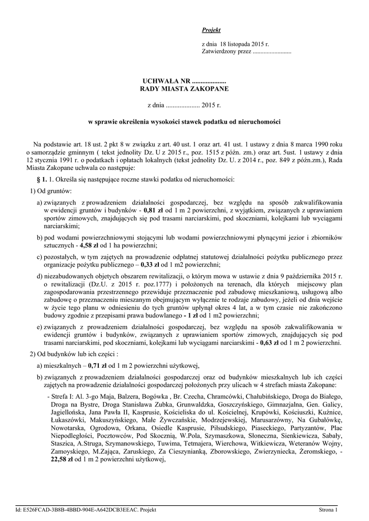Projekt z dnia 18 listopada 2015 r. Zatwierdzony przez ......................... UCHWAŁA NR .................... RADY MIASTA ZAKOPANE z dnia .................... 2015 r. w sprawie określenia wysokości stawek podatku od nieruchomości Na podstawie art. 18 ust. 2 pkt 8 w związku z art. 40 ust. 1 oraz art. 41 ust. 1 ustawy z dnia 8 marca 1990 roku o samorządzie gminnym ( tekst jednolity Dz. U z 2015 r., poz. 1515 z późn. zm.) oraz art. 5ust. 1 ustawy z dnia 12 stycznia 1991 r. o podatkach i opłatach lokalnych (tekst jednolity Dz. U. z 2014 r., poz. 849 z późn.zm.), Rada Miasta Zakopane uchwala co następuje: § 1. 1. Określa się następujące roczne stawki podatku od nieruchomości: 1) Od gruntów: a) związanych z prowadzeniem działalności gospodarczej, bez względu na sposób zakwalifikowania w ewidencji gruntów i budynków - 0,81 zł od 1 m 2 powierzchni, z wyjątkiem, związanych z uprawianiem sportów zimowych, znajdujących się pod trasami narciarskimi, pod skoczniami, kolejkami lub wyciągami narciarskimi; b) pod wodami powierzchniowymi stojącymi lub wodami powierzchniowymi płynącymi jezior i zbiorników sztucznych - 4,58 zł od 1 ha powierzchni; c) pozostałych, w tym zajętych na prowadzenie odpłatnej statutowej działalności pożytku publicznego przez organizacje pożytku publicznego – 0,33 zł od 1 m2 powierzchni; d) niezabudowanych objetych obszarem rewitalizacji, o którym mowa w ustawie z dnia 9 października 2015 r. o rewitalizacji (Dz.U. z 2015 r. poz.1777) i położonych na terenach, dla których miejscowy plan zagospodarowania przestrzennego przewiduje przeznaczenie pod zabudowę mieszkaniową, usługową albo zabudowę o przeznaczeniu mieszanym obejmującym wyłącznie te rodzaje zabudowy, jeżeli od dnia wejście w życie tego planu w odniesieniu do tych gruntów upłynął okres 4 lat, a w tym czasie nie zakończono budowy zgodnie z przepisami prawa budowlanego - 1 zł od 1 m2 powierzchni; e) związanych z prowadzeniem działalności gospodarczej, bez względu na sposób zakwalifikowania w ewidencji gruntów i budynków, związanych z uprawianiem sportów zimowych, znajdujących się pod trasami narciarskimi, pod skoczniami, kolejkami lub wyciągami narciarskimi - 0,63 zł od 1 m 2 powierzchni. 2) Od budynków lub ich części : a) mieszkalnych – 0,71 zł od 1 m 2 powierzchni użytkowej, b) związanych z prowadzeniem działalności gospodarczej oraz od budynków mieszkalnych lub ich części zajętych na prowadzenie działalności gospodarczej położonych przy ulicach w 4 strefach miasta Zakopane: - Strefa I: Al. 3-go Maja, Balzera, Bogówka , Br. Czecha, Chramcówki, Chałubińskiego, Droga do Białego, Droga na Bystre, Droga Stanisława Zubka, Grunwaldzka, Goszczyńskiego, Gimnazjalna, Gen. Galicy, Jagiellońska, Jana Pawła II, Kasprusie, Kościeliska do ul. Kościelnej, Krupówki, Kościuszki, Kuźnice, Łukaszówki, Makuszyńskiego, Małe Żywczańskie, Modrzejewskiej, Marusarzówny, Na Gubałówkę, Nowotarska, Ogrodowa, Orkana, Osiedle Kasprusie, Piłsudskiego, Piaseckiego, Partyzantów, Plac Niepodległości, Pocztowców, Pod Skocznią, W.Pola, Szymaszkowa, Słoneczna, Sienkiewicza, Sabały, Staszica, A.Struga, Szymanowskiego, Tuwima, Tetmajera, Wierchowa, Witkiewicza, Weteranów Wojny, Zamoyskiego, M.Zająca, Zaruskiego, Za Cieszynianką, Zborowskiego, Zwierzyniecka, Żeromskiego, 22,58 zł od 1 m 2 powierzchni użytkowej, Id: E526FCAD-3B8B-4BBD-904E-A642DCB3EEAC. Projekt Strona 1 - Strefa II: Antałówka, Antałówka na Wierch, Asnyka, Bachledzki Wierch, Broniewskiego, Bogdańskiego, Bulwary Słowackiego, Brzozowa, Brzozowskiego, Chyców Potok, Do Bristolu, Do Samków, Droga na Antałówkę, Droga do Olczy, Droga na Koziniec, Droga do Rojów, Droga na Szymoszkową, Droga Powstańców Śląskich, Do Tadziaków, Droga do Wantuli, Generała Boruty Spiechowicza, Harenda, Kamieniec, Kamockiego, Kasprowicza, Kościeliska od ul. Kościelnej w górę, Kościelna, Kraszewskiego, Ks. Curzydły, Ks. Stolarczyka, Małaszyńskiego, Kurierów Tatrzańskich, Na Wilcznik, Ornak, Osiedle Pardałówka, Osiedle Szymony, Pod Lipkami, Pardałówka, Paryskich, Podhalańska, Przewodników Tatrzańskich, Skibówki, Sobczakówka, Stara Pardałówka, Szymony, Szkolna, Strążyska, Salwatoriańska, Smrekowa, Ubocz, Za Strugiem oraz Kalatówki, Kasprowy Wierch, Myślenickie Turnie, Hala Gąsienicowa, Rejon Kondratowej, Rejon Goryczkowej – 17,97 zł od 1 m 2 powierzchni użytkowej, - Strefa III: Klimka Bachledy, W.Brzegi, Bilinówka, Chłabówka, Ciągłówka, Cichej Wody, Cyrhla, Droga na Buńdówki , Droga na Wierch, Droga do Walczaków, Droga do Daniela, Galicówka, Gładkie, Janosówka, Jaszczurówka, Jaszczurówka Bory, Kaszelewskiego, Karłowicza, Klusie, Krzeptówki, Krzeptówki Boczne, Krzeptówki Potok, Mraźnica, Mrowce, Oberconiówka, Osiedle Krzeptówki, Osiedle Krzeptówki Potok, Polna, Przewodnika J. Krzeptowskiego, Regle, Rybkówka, Szpitalna, Stroma, Stary Kamieniec, Stachonie, Stary Młyn, Spadowiec, Tatary, Topory, Ustup, Walowa Góra, Wojdyły, Zaryckiego - 15,86 zł od 1 m 2 powierzchni użytkowej, - Strefa IV: Bachledy, Brzeziny, Choćkowskie, Droga Brata Alberta, Furmanowa, Gawlaki, Gubałówka, Guty, Hrube Niżne, Hrube Wyżne, Huty, Kotelnica, Króle, Łosiówki , Piszczory, Spyrkówka, Walkosze, Wyskówki, Zoniówka, Zwijacze i pozostałe – 13,75 zł od 1 m 2 powierzchni użytkowej, c) zajętych na prowadzenie działalności gospodarczej w zakresie obrotu kwalifikowanym materiałem siewnym – 9,94 zł od 1 m 2 powierzchni użytkowej, d) związanych z udzielaniem świadczeń zdrowotnych w rozumieniu przepisów o działalności leczniczej, zajętych przez podmioty udzielające tych świadczeń - 4,42 zł od 1 m2 powierzchni użytkowej, e) pozostałych, w tym zajętych na prowadzenie odpłatnej statutowej działalności pożytku publicznego przez organizacje pożytku publicznego – 7,03 zł od 1 m2 powierzchni użytkowej, z tym, że: -