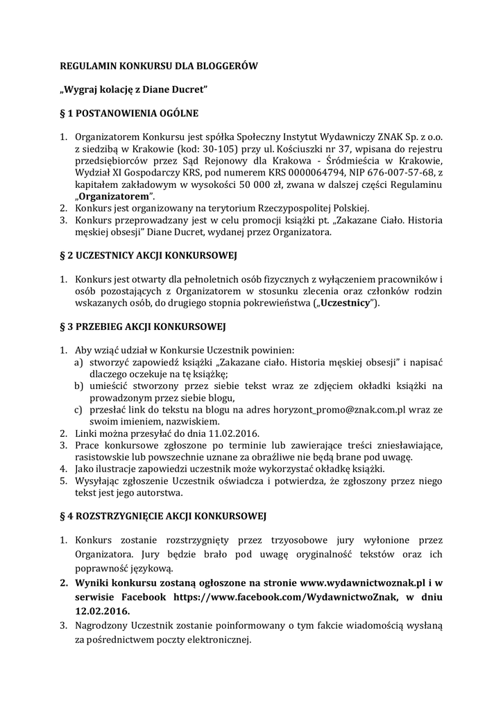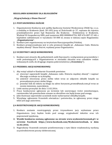 REGULAMIN KONKURSU DLA BLOGGERÓW „Wygraj kolację z Diane Ducret” § 1 POSTANOWIENIA OGÓLNE 1. Organizatorem Konkursu jest spółka Społeczny Instytut Wydawniczy ZNAK Sp. z o.o. z siedzibą w Krakowie (kod: 30-105) przy ul. Kościuszki nr 37, wpisana do rejestru przedsiębiorców przez Sąd Rejonowy dla Krakowa - Śródmieścia w Krakowie, Wydział XI Gospodarczy KRS, pod numerem KRS 0000064794, NIP 676-007-57-68, z kapitałem zakładowym w wysokości 50 000 zł, zwana w dalszej części Regulaminu „Organizatorem”. 2. Konkurs jest organizowany na terytorium Rzeczypospolitej Polskiej. 3. Konkurs przeprowadzany jest w celu promocji książki pt. „Zakazane Ciało. Historia męskiej obsesji” Diane Ducret, wydanej przez Organizatora. § 2 UCZESTNICY AKCJI KONKURSOWEJ 1. Konkurs jest otwarty dla pełnoletnich osób fizycznych z wyłączeniem pracowników i osób pozostających z Organizatorem w stosunku zlecenia oraz członków rodzin wskazanych osób, do drugiego stopnia pokrewieństwa („Uczestnicy”). § 3 PRZEBIEG AKCJI KONKURSOWEJ 1. Aby wziąć udział w Konkursie Uczestnik powinien: a) stworzyć zapowiedź książki „Zakazane ciało. Historia męskiej obsesji” i napisać dlaczego oczekuje na tę książkę; b) umieścić stworzony przez siebie tekst wraz ze zdjęciem okładki książki na prowadzonym przez siebie blogu, c) przesłać link do tekstu na blogu na adres [email protected] wraz ze swoim imieniem, nazwiskiem. 2. Linki można przesyłać do dnia 11.02.2016. 3. Prace konkursowe zgłoszone po terminie lub zawierające treści zniesławiające, rasistowskie lub powszechnie uznane za obraźliwe nie będą brane pod uwagę. 4. Jako ilustracje zapowiedzi uczestnik może wykorzystać okładkę książki. 5. Wysyłając zgłoszenie Uczestnik oświadcza i potwierdza, że zgłoszony przez niego tekst jest jego autorstwa. § 4 ROZSTRZYGNIĘCIE AKCJI KONKURSOWEJ 1. Konkurs zostanie rozstrzygnięty przez trzyosobowe jury wyłonione przez Organizatora. Jury będzie brało pod uwagę oryginalność tekstów oraz ich poprawność językową. 2. Wyniki konkursu zostaną ogłoszone na stronie www.wydawnictwoznak.pl i w serwisie Facebook https://www.facebook.com/WydawnictwoZnak, w dniu 12.02.2016. 3. Nagrodzony Uczestnik zostanie poinformowany o tym fakcie wiadomością wysłaną za pośrednictwem poczty elektronicznej. § 5 NAGRODA 1. Nagrodą w Konkursie jest kolacja z Diane Ducret. Organizator pokryje koszty uczestnictwa Zwycięzcy w kolacji do wysokości 100 zł. 2. Kolacja z autorką odbędzie się 16 lub 17 lutego 2016 w Warszawie. Zwycięzca może wskazać dzień kolacji. 3. Warunkiem otrzymania nagrody jest podanie przez nagrodzonego Uczestnika swojego nr PESEL i adresu zamieszkania. 4. Organizator nie pokrywa kosztów transportu z i do Warszawy. 5. Nagroda nie podlega wymianie na inne świadczenia. § 6 DANE OSOBOWE I LICENCJA 1. Administratorem danych osobowych uczestników Konkursu jest Organizator. Dane osobowe przekazane Organizatorowi przez uczestników Konkursu będą przetwarzane w celu realizacji Konkursu i przyznania nagrody. 2. Z chwilą przesłania pracy konkursowej Uczestnik udziela Organizatorowi niewyłącznej licencji na korzystanie z pracy konkursowej w zakresie kopiowania cyfrowego oraz udostępniania sieci Internet, w tym w serwisie Facebook. § 7 POSTANOWIENIA KOŃCOWE 1. Organizator nie ponosi odpowiedzialności za problemy techniczne, powstałe w trakcie przesyłania prac konkursowych. 2. Organizator zastrzega sobie prawo do wydłużenia terminu przesyłania prac do konkursu jeżeli ich liczba nie przekroczy 10. O wydłużeniu terminu Organizator poinformuje na Profilu. Jeśli do Konkursu przystąpi mniej niż 20 Uczestników Organizator może nie przyznawać nagrody. 3. W przypadku naruszenia regulaminu przez Uczestnika, może on zostać wykluczony z Konkursu. 4. Zgłoszenie do Konkursu jest równoznaczne z akceptacją warunków zapisanych w niniejszym Regulaminie.