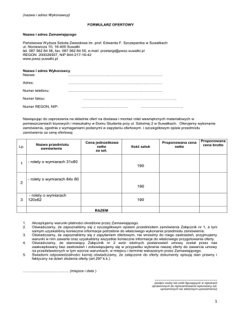 (nazwa i adres Wykonawcy) FORMULARZ OFERTOWY Nazwa i adres Zamawiającego Państwowa Wyższa Szkoła Zawodowa im. prof. Edwarda F. Szczepanika w Suwałkach ul. Noniewicza 10, 16-400 Suwałki tel. 087 562 84 56, fax. 087 562 84 55, e-mail: [email protected] REGON 200026507, NIP 844-217-16-42 www.pwsz.suwalki.pl Nazwa i adres Wykonawcy Nazwa: …………………………………………………….…………… Adres: ………….……………………………………..………………. Numer telefonu: …………………………………………….……..……………. Numer faksu: …………..…………………………………..…….………….. Numer REGON, NIP: ………………………….…… ……………………………. Nawiązując do zaproszenia na składnie ofert na dostawa i montaż rolet wewnętrznych materiałowych w pomieszczeniach biurowych i mieszkalny w Domu Studenta przy ul. Szkolnej 2 w Suwałkach. Oferujemy wykonanie zamówienia, zgodnie z wymaganiami podanymi w zapytaniu ofertowym i szczegółowym opisie przedmiotu zamówienia za cenę ofertową: Lp. Nazwa przedmiotu zamówienia 1 - rolety o wymiarach 31x80 Cena jednostkowa netto za szt. Ilość sztuk Proponowana cena netto Proponowana cena brutto 190 - rolety o wymiarach 84x 80 2 190 - rolety o wymiarach 120x62 3 190 RAZEM 1. 2. 3. 4. 5. Akceptujemy warunki płatności określone przez Zamawiającego. Oświadczamy, że zapoznaliśmy się z szczegółowym opisem przedmiotem zamówienia Załącznik nr 1, a tym samym uzyskaliśmy konieczne informacje potrzebne do właściwego wykonania przedmiotu zamówienia. Oświadczamy, że zapoznaliśmy się z zapytaniem ofertowym, nie wnosimy do niego zastrzeżeń, przyjmujemy warunki w nim zawarte oraz uzyskaliśmy wszystkie konieczne informacje do właściwego przygotowania oferty. Oświadczamy, że stanowiący Załącznik nr 2 wzór istotnych postanowień umowy został przez nas zaakceptowany bez zastrzeżeń i zobowiązujemy się w przypadku wybrania naszej oferty do zawarcia umowy na przedstawionych w tym wzorze warunkach, w miejscu i terminie wskazanym przez Zamawiającego. Świadomi odpowiedzialności karnej oświadczamy, że załączone do oferty dokumenty opisują stan prawny i faktyczny na dzień złożenia oferty (art.297 k.k.) ............................................ (miejsce i data ) ............................................................ (podpis osoby lub osób figurujących w rejestrach uprawnionych do reprezentowania wykonawcy lub uprawnionych we właściwym upoważnieniu) 1