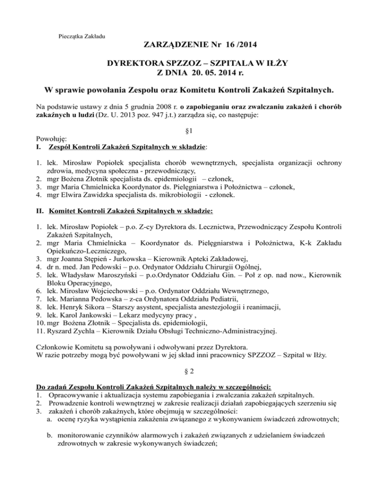 Pieczątka Zakładu ZARZĄDZENIE Nr 16 /2014 DYREKTORA SPZZOZ – SZPITALA W IŁŻY Z DNIA 20. 05. 2014 r. W sprawie powołania Zespołu oraz Komitetu Kontroli Zakażeń Szpitalnych. Na podstawie ustawy z dnia 5 grudnia 2008 r. o zapobieganiu oraz zwalczaniu zakażeń i chorób zakaźnych u ludzi (Dz. U. 2013 poz. 947 j.t.) zarządza się, co następuje: §1 Powołuję: I. Zespół Kontroli Zakażeń Szpitalnych w składzie: 1. lek. Mirosław Popiołek specjalista chorób wewnętrznych, specjalista organizacji ochrony zdrowia, medycyna społeczna - przewodniczący, 2. mgr Bożena Złotnik specjalista ds. epidemiologii – członek, 3. mgr Maria Chmielnicka Koordynator ds. Pielęgniarstwa i Położnictwa – członek, 4. mgr Elwira Zawidzka specjalista ds. mikrobiologii - członek. II. Komitet Kontroli Zakażeń Szpitalnych w składzie: 1. lek. Mirosław Popiołek – p.o. Z-cy Dyrektora ds. Lecznictwa, Przewodniczący Zespołu Kontroli Zakażeń Szpitalnych, 2. mgr Maria Chmielnicka – Koordynator ds. Pielęgniarstwa i Położnictwa, K-k Zakładu Opiekuńczo-Leczniczego, 3. mgr Joanna Stępień - Jurkowska – Kierownik Apteki Zakładowej, 4. dr n. med. Jan Pedowski – p.o. Ordynator Oddziału Chirurgii Ogólnej, 5. lek. Władysław Maroszyński – p.o.Ordynator Oddziału Gin. – Poł z op. nad now., Kierownik Bloku Operacyjnego, 6. lek. Mirosław Wojciechowski – p.o. Ordynator Oddziału Wewnętrznego, 7. lek. Marianna Pedowska – z-ca Ordynatora Oddziału Pediatrii, 8. lek. Henryk Sikora – Starszy asystent, specjalista anestezjologii i reanimacji, 9. lek. Karol Jankowski – Lekarz medycyny pracy , 10. mgr Bożena Złotnik – Specjalista ds. epidemiologii, 11. Ryszard Zychla – Kierownik Działu Obsługi Techniczno-Administracyjnej. Członkowie Komitetu są powoływani i odwoływani przez Dyrektora. W razie potrzeby mogą być powoływani w jej skład inni pracownicy SPZZOZ – Szpital w Iłży. §2 Do zadań Zespołu Kontroli Zakażeń Szpitalnych należy w szczególności: 1. Opracowywanie i aktualizacja systemu zapobiegania i zwalczania zakażeń szpitalnych. 2. Prowadzenie kontroli wewnętrznej w zakresie realizacji działań zapobiegających szerzeniu się 3. zakażeń i chorób zakaźnych, które obejmują w szczególności: a. ocenę ryzyka wystąpienia zakażenia związanego z wykonywaniem świadczeń zdrowotnych; b. monitorowanie czynników alarmowych i zakażeń związanych z udzielaniem świadczeń zdrowotnych w zakresie wykonywanych świadczeń; c. opracowanie, wdrożenie i nadzór nad procedurami zapobiegającymi zakażeniom i chorobom zakaźnym związanym z udzielaniem świadczeń zdrowotnych, w tym dekontaminacji: skóry i błon śluzowych lub innych tkanek, wyrobów medycznych, wyrobów medycznych do diagnostyki in-vitro, wyposażenia wyrobów medycznych, wyposażenia wyrobów do diagnostyki in –vitro i aktywnych wyrobów medycznych do implantacji, w rozumieniu przepisów ustawy z dnia 20 maja 2010 r. o wyrobach medycznych (Dz.U.Nr 107, poz.679 oraz z 2011 r. Nr 102, poz. 586 i Nr 113, poz. 657) oraz powierzchni pomieszczeń i urządzeń; d. stosowanie środków ochrony indywidualnej i zbiorowej w celu zapobieżenia przeniesieniu na inne osoby biologicznych czynników chorobotwórczych; e. wykonywanie badań laboratoryjnych oraz analizę lokalnej sytuacji epidemiologicznej w celu optymalizacji profilaktyki i terapii antybiotykowej; 4. Przedstawienie wyników i wniosków z kontroli, której mowa w pkt 2 Dyrektorowi Naczelnemu i Komitetowi Zakażeń Szpitalnych. 5. Szkolenie personelu w zakresie kontroli zakażeń szpitalnych. 6. Konsultowanie osób podejrzanych o zakażenie lub chorobę zakaźną oraz tych, u których rozpoznano zakażenie lub chorobę zakaźną. Do zadań Komitetu Kontroli Zakażeń Szpitalnych należy w szczególności: 1. Opracowywanie planów i kierunków systemu zapobiegania i zwalczania zakażeń szpitalnych. 2. Ocena wyników kontroli wewnętrznej przedstawianych przez Zespół Kontroli Zakażeń Szpitalnych. 3. Opracowywanie i aktualizacja standardów farmakoprofilaktyki i farmakoterapii zakażeń i chorób zakaźnych w Szpitalu. §3 1. Osobą odpowiedzialną za prowadzenie dokumentacji z działalności Zespołu i Komitetu Zakażeń Szpitalnych jest Pani mgr Bożena Złotnik – specjalista ds. epidemiologii. 2. Zespół i Komitet Kontroli Zakażeń Szpitalnych realizuje zadania określone w ustawie z dnia 5 grudnia 2008 r. o zapobieganiu oraz zwalczaniu zakażeń i chorób zakaźnych u ludzi (Dz. U. 2013 poz. 947 j.t.) i obowiązujących aktów wykonawczych, oraz ustawy z dnia 14 marca 1985 r. o Państwowej Inspekcji Sanitarnej (Dz. U. 2011 r. Nr 212, poz. 1263 t.j. ze zm.). §4 Zarządzenie wchodzi w życie z dniem 22.05.2014 r. §5 Z dniem wejścia w życie niniejszego zarządzenia traci moc zarządzenie Nr 10a/2009 SPZOZ Szpitala w Iłży z dnia 10.03.2009 r. wraz z aneksami. Otrzymują: jednostki i komórki organizacyjne SPZZOZ – Szpital w Iłży. Zatwierdził: Dyrektora