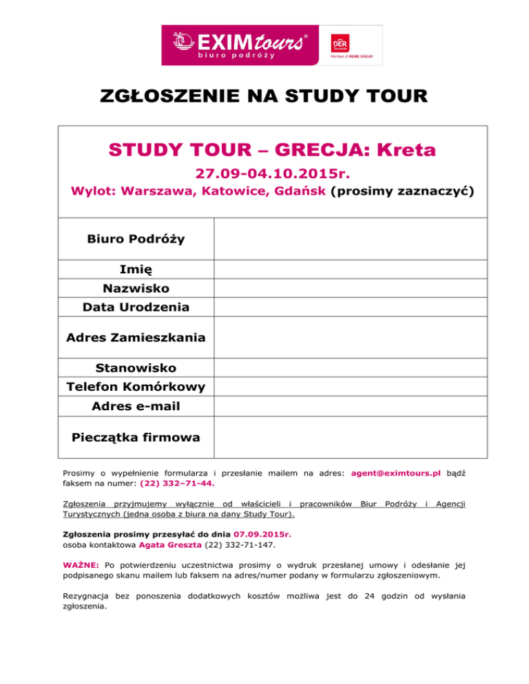 ZGŁOSZENIE NA STUDY TOUR STUDY TOUR – GRECJA: Kreta 27.09-04.10.2015r. Wylot: Warszawa, Katowice, Gdańsk (prosimy zaznaczyć) Biuro Podróży Imię Nazwisko Data Urodzenia Adres Zamieszkania Stanowisko Telefon Komórkowy Adres e-mail Pieczątka firmowa Prosimy o wypełnienie formularza i przesłanie mailem na adres: [email protected] bądź faksem na numer: (22) 332–71-44. Zgłoszenia przyjmujemy wyłącznie od właścicieli i pracowników Turystycznych (jedna osoba z biura na dany Study Tour). Biur Podróży i Agencji Zgłoszenia prosimy przesyłać do dnia 07.09.2015r. osoba kontaktowa Agata Greszta (22) 332-71-147. WAŻNE: Po potwierdzeniu uczestnictwa prosimy o wydruk przesłanej umowy i odesłanie jej podpisanego skanu mailem lub faksem na adres/numer podany w formularzu zgłoszeniowym. Rezygnacja bez ponoszenia dodatkowych kosztów możliwa jest do 24 godzin od wysłania zgłoszenia.