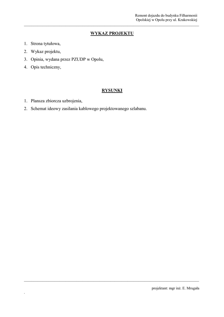 Remont dojazdu do budynku Filharmonii Opolskiej w Opolu przy ul. Krakowskiej _____________________________________________________________________________________________ WYKAZ PROJEKTU 1. Strona tytułowa, 2. Wykaz projektu, 3. Opinia, wydana przez PZUDP w Opolu, 4. Opis techniczny, RYSUNKI 1. Plansza zbiorcza uzbrojenia, 2. Schemat ideowy zasilania kablowego projektowanego szlabanu. _____________________________________________________________________________________________ projektant: mgr inŜ. E. Mrugała . Remont dojazdu do budynku Filharmonii Opolskiej w Opolu przy ul. Krakowskiej _____________________________________________________________________________________________ OPIS TECHNICZNY 1. Temat. Tematem niniejszego opracowania jest projekt wykonawczy na zasilanie kablowe projektowanego szlabanu w ramach projektu remontu dojazdu do budynku Filharmonii Opolskiej w Opolu. 2. Podstawa opracowania. Podstawę opracowania stanowią: - zlecenie Inwestora, - mapa w skali 1:250 z projektowanym zagospodarowaniem remontowanego terenu zaplecza biurowca, - koordynacja międzybranŜowa, - Rozporządzenie Ministra Infrastruktury z dn.7 kwietnia 2004 r. w sprawie warunków technicznych, jakim powinny odpowiadać budynki i ich usytuowane (Dz.U. nr 109 z dn.12.05.2004 poz.1156), - obowiązujące przepisy i normy PNE. 3. Zakres opracowania. Opracowanie niniejsze obejmuje: - Zasilanie kablowe projektowanego szlabanu, - Dane techniczne projektowanego szlabanu, - Ochrona przeciwporaŜeniowa. 4. Zasilanie kablowe projektowanego szlabanu. W ramach projektowanego remontu dojazdu do budynku Filharmonii Opolskiej w Opolu w projekcie zagospodarowania terenu przewidziano przy wjeździe od strony ulicy Mozarta zabudowanie szlabanu uniemoŜliwiającego wjazd osobom nieupowaŜnionym. W związku z zabudową szlabanu zaprojektowano do niego zasilanie kablem typu YKSY 5x2,5 mm2 z istniejącej tablicy rozdzielczej „R-1” mieszczącej na korytarzu w piwnicy na wprost schodów zejściowych do piwnicy. W celu zrealizowania zasilania naleŜy na istniejącej tablicy rozdzielczej „R-1” zabudować dodatkowo rozłącznik bezpiecznikowy typu R302 10A. Zasilanie zaprojektowano kablem typu YKSY 5x2,5 mm2 z uwagi na obciąŜalność prądową długotrwałą. (Idd = 34,0 A dla YKSY 5x2,5 mm2 ułoŜonego w ziemi oraz w przepustach ochronnych) Idd = 34,0 A > Ib = 10 A (zabezpieczenie w tablicy rozdzielczej niskiego napięcia obwodów zalicznikowych). 4.1. Parametry linii kablowej. Dane i parametry dotyczące projektowanej linii kablowej podano na schemacie ideowym rys. nr 2. 4.2. Trasa linii kablowej n/n. Trasę linii kablowej n/n wybrano uwzględniając istniejące oraz projektowane zagospodarowanie terenu, a takŜe przebieg uzbrojenia podziemnego istniejącego i _____________________________________________________________________________________________ projektant: mgr inŜ. E. Mrugała . Remont dojazdu do budynku Filharmonii Opolskiej w Opolu przy ul. Krakowskiej _____________________________________________________________________________________________ projektowanego. Przejście linii kablowej na skrzyŜowaniu z uzbrojeniem podziemnym naleŜy zabezpieczyć przepustami ochronnymi typu DVK 75 prod. „AROT” Leszno. W budynku Filharmonii Opolskiej kabel naleŜy prowadzić w piwnicy w rurkach ochronnych RL28 układanych na uchwytach na tynku. Trasę projektowanej linii kablowej niskiego napięcia pokazano na planie sytuacyjnym, rys. nr 1. 4.3. Układanie kabla. Wykopy pod układanie kabli wykonać ręcznie. Kabel układać w wykopie na głębokości 0,6m. (dla kabli n.n.) na 10 cm warstwie piasku z przykryciem o tej samej grubości. Nad kablem w odległości 25 cm od niego ułoŜyć pas z niebieskiej folii o szerokości 30 cm. Na całej trasie kabli naleŜy w odstępach, co 10 m stosować oznaczniki, a takŜe przy zakończeniach i w miejscach charakterystycznych np.: przy skrzyŜowaniach, wejściach do rur. Na oznacznikach naleŜy umieścić trwałe napisy zawierające: a) symbol i nr ewidencyjny linii(nr obwodu), b) oznaczenie kabla wg normy, c) znak uŜytkownika kabla, d) rok ułoŜenia kabla. SkrzyŜowanie projektowanego kabla z uzbrojeniem podziemnym naleŜy zabezpieczyć przepustami ochronnymi typu DVK 75 prod. „AROT” Leszno. 5. Dane techniczne projektowanego szlabanu. Do zabudowy przewidziano szlaban typu G6000 z płaskim ramieniem AL. 100x40 mm o długości 4,5 m. Szlaban G6000 - jest szybkim szlabanem serii GARD przeznaczonym do przejazdów do 6,5 m. Ramie moŜe być wyposaŜone w kratownicę (firanę), oświetlenie, dolną listwę zabezpieczającą lub podpórkę wahadłową. Współpracuje ze wszystkimi rodzajami zabezpieczeń jak fotokomórki, pętle indukcyjne, listwy zabezpieczające. MoŜliwość sterowania pilotem, kartą magnetyczną, klawiaturą, domofonem, itp. Awaryjne odblokowanie następuje poprzez zamek z kluczem osobistym. Dla zwiększenia niezawodności działania szlaban moŜna wyposaŜyć w akumulator. Podstawowe dane techniczne Typ Zasilanie Moc Czas otwierania Temperatura pracy Maksymalna długość ramienia G6000 230 V A.C. 300 W 4-8 s -15°C do +50°C 6,5 m _____________________________________________________________________________________________ projektant: mgr inŜ. E. Mrugała . Remont dojazdu do budynku Filharmonii Opolskiej w Opolu przy ul. Krakowskiej _____________________________________________________________________________________________ 6. Uwagi końcowe. wykonawstwo robót naleŜy prowadzić zgodnie z projektem budowlanym, normami technicznymi PNE oraz przepisami obowiązującymi w budownictwie elektroenergetycznym, przy zachowaniu przepisów i wymogów BHP, po zakończeniu robót montaŜowych naleŜy wykonać pomiary rezystancji izolacji, w przypadku napotkania w czasie robót ziemnych niezidentyfikowanych urządzeń naleŜy ustalić uŜytkownika i dalsze prace prowadzić pod nadzorem przedstawiciela uŜytkownika. Opracował : _______________________________________