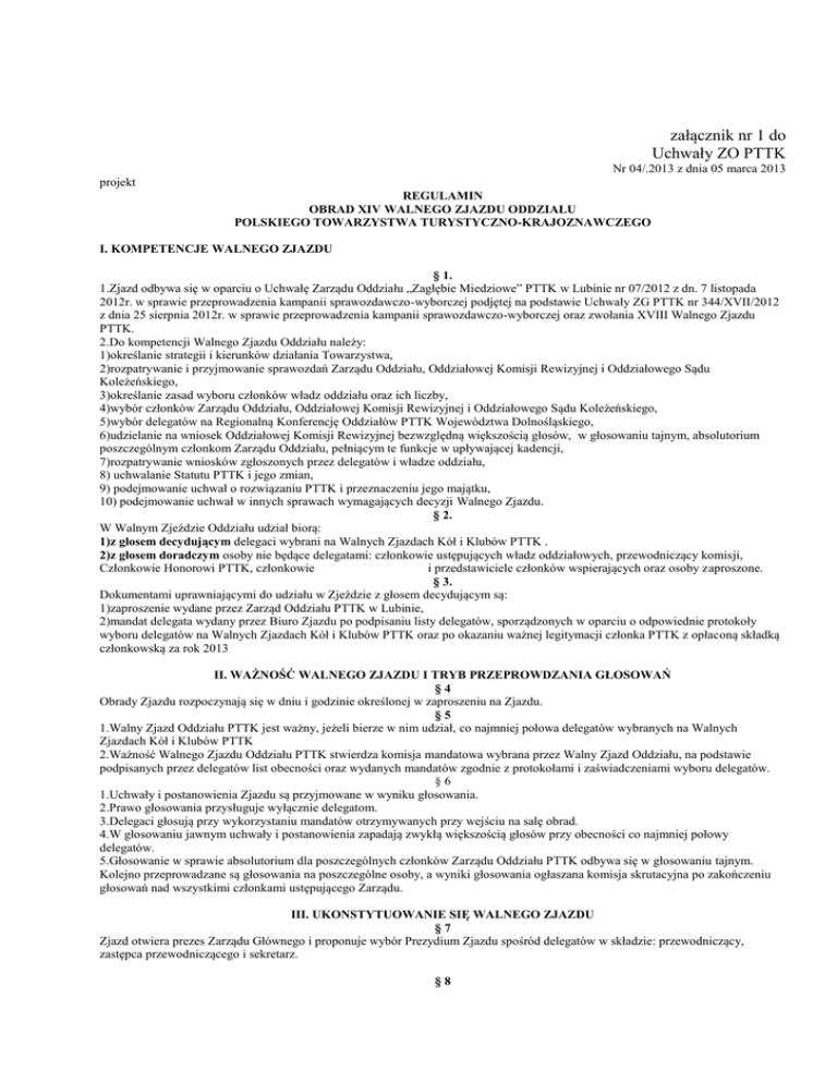 załącznik nr 1 do Uchwały ZO PTTK Nr 04/.2013 z dnia 05 marca 2013 projekt REGULAMIN OBRAD XIV WALNEGO ZJAZDU ODDZIAŁU POLSKIEGO TOWARZYSTWA TURYSTYCZNO-KRAJOZNAWCZEGO I. KOMPETENCJE WALNEGO ZJAZDU § 1. 1.Zjazd odbywa się w oparciu o Uchwałę Zarządu Oddziału „Zagłębie Miedziowe” PTTK w Lubinie nr 07/2012 z dn. 7 listopada 2012r. w sprawie przeprowadzenia kampanii sprawozdawczo-wyborczej podjętej na podstawie Uchwały ZG PTTK nr 344/XVII/2012 z dnia 25 sierpnia 2012r. w sprawie przeprowadzenia kampanii sprawozdawczo-wyborczej oraz zwołania XVIII Walnego Zjazdu PTTK. 2.Do kompetencji Walnego Zjazdu Oddziału należy: 1)określanie strategii i kierunków działania Towarzystwa, 2)rozpatrywanie i przyjmowanie sprawozdań Zarządu Oddziału, Oddziałowej Komisji Rewizyjnej i Oddziałowego Sądu Koleżeńskiego, 3)określanie zasad wyboru członków władz oddziału oraz ich liczby, 4)wybór członków Zarządu Oddziału, Oddziałowej Komisji Rewizyjnej i Oddziałowego Sądu Koleżeńskiego, 5)wybór delegatów na Regionalną Konferencję Oddziałów PTTK Województwa Dolnośląskiego, 6)udzielanie na wniosek Oddziałowej Komisji Rewizyjnej bezwzględną większością głosów, w głosowaniu tajnym, absolutorium poszczególnym członkom Zarządu Oddziału, pełniącym te funkcje w upływającej kadencji, 7)rozpatrywanie wniosków zgłoszonych przez delegatów i władze oddziału, 8) uchwalanie Statutu PTTK i jego zmian, 9) podejmowanie uchwał o rozwiązaniu PTTK i przeznaczeniu jego majątku, 10) podejmowanie uchwał w innych sprawach wymagających decyzji Walnego Zjazdu. § 2. W Walnym Zjeździe Oddziału udział biorą: 1)z głosem decydującym delegaci wybrani na Walnych Zjazdach Kół i Klubów PTTK . 2)z głosem doradczym osoby nie będące delegatami: członkowie ustępujących władz oddziałowych, przewodniczący komisji, Członkowie Honorowi PTTK, członkowie i przedstawiciele członków wspierających oraz osoby zaproszone. § 3. Dokumentami uprawniającymi do udziału w Zjeździe z głosem decydującym są: 1)zaproszenie wydane przez Zarząd Oddziału PTTK w Lubinie, 2)mandat delegata wydany przez Biuro Zjazdu po podpisaniu listy delegatów, sporządzonych w oparciu o odpowiednie protokoły wyboru delegatów na Walnych Zjazdach Kół i Klubów PTTK oraz po okazaniu ważnej legitymacji członka PTTK z opłaconą składką członkowską za rok 2013 II. WAŻNOŚĆ WALNEGO ZJAZDU I TRYB PRZEPROWDZANIA GŁOSOWAŃ §4 Obrady Zjazdu rozpoczynają się w dniu i godzinie określonej w zaproszeniu na Zjazdu. §5 1.Walny Zjazd Oddziału PTTK jest ważny, jeżeli bierze w nim udział, co najmniej połowa delegatów wybranych na Walnych Zjazdach Kół i Klubów PTTK 2.Ważność Walnego Zjazdu Oddziału PTTK stwierdza komisja mandatowa wybrana przez Walny Zjazd Oddziału, na podstawie podpisanych przez delegatów list obecności oraz wydanych mandatów zgodnie z protokołami i zaświadczeniami wyboru delegatów. §6 1.Uchwały i postanowienia Zjazdu są przyjmowane w wyniku głosowania. 2.Prawo głosowania przysługuje wyłącznie delegatom. 3.Delegaci głosują przy wykorzystaniu mandatów otrzymywanych przy wejściu na salę obrad. 4.W głosowaniu jawnym uchwały i postanowienia zapadają zwykłą większością głosów przy obecności co najmniej połowy delegatów. 5.Głosowanie w sprawie absolutorium dla poszczególnych członków Zarządu Oddziału PTTK odbywa się w głosowaniu tajnym. Kolejno przeprowadzane są głosowania na poszczególne osoby, a wyniki głosowania ogłaszana komisja skrutacyjna po zakończeniu głosowań nad wszystkimi członkami ustępującego Zarządu. III. UKONSTYTUOWANIE SIĘ WALNEGO ZJAZDU §7 Zjazd otwiera prezes Zarządu Głównego i proponuje wybór Prezydium Zjazdu spośród delegatów w składzie: przewodniczący, zastępca przewodniczącego i sekretarz. §8 1. Do przeprowadzenia spraw objętych porządkiem obrad Zjazd wybiera spośród delegatów komisje: 1)mandatową w liczbie 3 osób; 2)uchwał w liczbie 3 osób; 3)wyborczą w liczbie 3 osób; 4)skrutacyjną do udzielenia absolutorium w liczbie 3 osób, 5)skrutacyjną do przeprowadzenia wyborów władz w liczbie 3 osób. 2. Prezydium Zjazdu oraz członkowie komisji wybierani są w głosowaniu jawnym. 3. Komisje wybierają ze swego grona przewodniczącego, wiceprzewodniczącego i sekretarza. 5. Komisje rejestrują swoje działania w protokołach i składają Zjazdowi sprawozdania ze swych prac. §9 1.Komisja uchwał i wniosków przyjmuje i rejestruje zgłaszane przez delegatów wnioski czasie trwania Walnego Zjazdu Oddziału. 2.Komisja uchwał zgłaszane wnioski może wykorzystać przy redagowaniu projektów uchwał przedkładanych Walnemu Zjazdowi Oddziału. 3.Nowo wybrane władze oddziału, zgodnie z podziałem kompetencji w terminie do 3 miesięcy od zakończenia Walnego Zjazdu Oddziału powiadomią delegatów zgłaszających wnioski o przyjętej formie realizacji ich wniosku. IV. PRZEBIEG OBRAD WALNEGO ZJAZDU § 10 Zjazd obraduje w składzie plenarnym. § 11 Przedmiotem obrad mogą być tylko sprawy objęte porządkiem obrad. § 12 1.Obradom przewodniczy przewodniczący Zjazdu. 2.Do obowiązków przewodniczącego obrad należy: 1.) przedstawienie Zjazdowi do zatwierdzenia porządku obrad; 2.) kierowanie obradami; 3.) dopilnowanie wyczerpania porządku obrad; 4.) wydawanie stosownych zarządzeń porządkowych na sali obrad. 3.Od zarządzeń przewodniczącego obrad delegatom przysługuje prawo odwołania się do Prezydium Zjazdu. § 13 Uczestnik Zjazdu zamierzający zabrać głos w dyskusji plenarnej zgłasza swoje imię i nazwisko oraz jednostkę którą reprezentuje. § 14 1.Przewodniczący obrad udziela głosu osobom zgłoszonym do dyskusji według kolejności zgłoszeń. 2.Czas wystąpienia w dyskusji nie powinien przekraczać 3 minut. 3.Poza kolejnością zgłoszeń przewodniczący obrad może udzielić głosu: 1)w sprawie formalnej (§ 15 regulaminu obrad); 2)w sprawie nagłej 