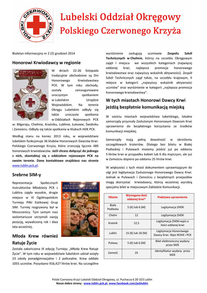 Biuletyn informacyjny nr 2 (2) grudzieo 2014 Honorowi Krwiodawcy w regionie W dniach 22-26 listopada tradycyjnie obchodzone są Dni Honorowego Krwiodawstwa PCK. W tym roku obchody, zostały zainaugurowane uroczystym spotkaniem w Lubelskim Urzędzie Wojewódzkim. Na terenie Okręgu Lubelskim odbyły się także uroczyste spotkania w Oddziałach Rejonowych PCK w: Biłgoraju, Chełmie, Kraśniku, Lublinie, Łukowie, Świdniku i Zamościu. Odbyły się także spotkania w Klubach HDK PCK. Według stanu na koniec 2013 roku, w województwie lubelskim funkcjonuje 36 klubów Honorowych Dawców Krwi. Polskiego Czerwonego Krzyża, które zrzeszają łącznie 489 honorowych krwiodawców. Jeśli chcesz dołączyd do jednego z nich, skontaktuj się z oddziałem rejonowym PCK na swoim terenie. Dane kontaktowe znajdziesz nas stronie www.lublin.pck.pl. Srebrne SIM-y Reprezentacja Społecznych Instruktorów Młodzieży PCK z Lublina zajęła wysokie, drugie miejsce w III Ogólnopolskim Turnieju Piłki Siatkowej Grup SIM. Turniej rozgrywany był w Moszczenicy. Tym samym nasi wolontariusze utrzymali swoją pozycję, wywalczoną rok i dwa lata wcześniej. Młoda Krew również Ratuje Życie Została zakooczona IX edycję Turnieju „Młoda Krew Ratuje Życie”. W tym roku w województwie lubelskim udział wzięły 23 szkoły ponadgimnazjalne i 2 policealne. Krew oddało 1055 uczniów. Pozyskano 916,427 litrów krwi. Na szczególne wyróżnienie zasługują uczniowie Zespołu Szkół Technicznych w Chełmie, którzy na szczeblu Okręgowym zajęli I miejsca we wszystkich kategoriach (najwięcej oddanej krwi, najlepsza promocja honorowego krwiodawstwa oraz najwyższy wskaźnik aktywności). Zespół Szkól Technicznych zajął także, na szczeblu krajowym, II miejsce w kategorii „najwyższy wskaźnik aktywności uczniów” oraz wyróżnienie w kategorii „najlepsza promocja honorowego krwiodawstwa”. W tych miastach Honorowi Dawcy Krwi jeżdżą bezpłatnie komunikacją miejską W sześciu miastach województwa lubelskiego, lokalne samorządy przyznały Zasłużonym Honorowym Dawcom Krwi uprawnienia do bezpłatnego korzystania ze środków komunikacji miejskiej. Samorządy mają pełną dowolnośd w określeniu szczegółowych kryteriów. Dlatego bez biletu w Białej Podlaskiej i Puławach możemy jeździd już po oddaniu 5 litrów krwi w przypadku kobiet lub 6 dla mężczyzn, ale już w Zamościu dopiero po oddaniu 25 litrów krwi. W większości z tych miast dokumentem uprawniającym do ulgi jest legitymacja Zasłużonego Honorowego Dawcy Krwi. Jednak w Puławach i Zamościu z bezpłatnych przejazdów mogą skorzystad krwiodawcy, którzy wcześniej wyrobią specjalny bilet w miejscowym Zakładzie Komunikacji. Miasto Wymagana ilośd oddanej krwi* Podstawa uprawnienia Biała Podlaska 5 (K) lub 6 (M) Legitymacja ZHDK Chełm 12 Legitymacja ZHDK Kraśnik 12,5 Legitymacja ZHDK+wpis o ilości oddanej krwi Lublin 15 (K) lub 18 (M) Legitymacja Honorowego Dawcy Krwi. Wpis RCKiK i PCK Puławy 5 (K) lub 6 (M) Bilet elektroniczny wydany przez MZK Zamośd 25 Identyfikator wydany przez MZK Polski Czerwony Krzyż Lubelski Oddział Okręgowy, ul. Puchacza 6 20-323 Lublin Nasze dobre strony: www.lublin.pck.pl, www.facebook.com/pcklublin DNI HONOROWEGO KRWIODAWSTWA PCK W LUBLINIE POD POMNIKIEM W dniu 22 listopada 2014 roku, odbyły się uroczystości inaugurujące obchody Dni Honorowego Krwiodawstwa Polskiego Czerwonego Krzyża na Lubelszczyźnie. O godzinie 10.00 pod pomnikiem „Honorowym Dawcom Krwi PCKSpołeczeostwo”, znajdującym się przy Regionalnym Centrum Krwiodawstwa i Krwiolecznictwa przy ul. I Armii Wojska Polskiego. Uroczystośd otworzył Prezes Lubelskiego Oddziału Okręgowego Jerzy Bisek. Następnie przybyłe delegacje złożyły kwiaty pod pomnikiem. SPOTKANIE Następnie goście przeszli do Sali Kolumnowej Lubelskiego Urzędu Wojewódzkiego, gdzie odbyła się częśd oficjalna uroczystości. Ponad 70 osób otrzymało odznaczenia paostwowe, i resortowe Medale Marszałka Województwa Lubelskiego i Wyróżnienia PCK. W tym: Srebrne Krzyże Zasługi (4 osoby), Brązowe Krzyże Zasługi (16 osób), Medale Złote i Srebrne Prezydenta RP za wzorowe, wyjątkowo sumienne wykonywanie obowiązków wynikających z pracy zawodowej (12 osób), Odznakę „Honorowy Dawca Krwi – Zasłużony dla Zdrowia Narodu” (7 osób), Medal Komisji Edukacji Narodowej (5 osób), Odznakę Honorową PCK (4 osoby) oraz Medal Pamiątkowy Województwa Lubelskiego (10 osób). Ponadto trzy osoby otrzymały „Kryształowe Serce”. Jest to najwyższe odznaczenie przyznawane przez PCK za wybitne zasługi w rozwoju Ruchu Honorowego Krwiodawstwa PCK. Po zakooczeniu części oficjalnej udaliśmy się na wspólnym obiad, w czasie którego wciąż prowadzone były rozmowy nt. krwiodawstwa. Więcej zdjęd z wydarzenia znajdziecie na stronie www.facebook. com/pcklublin UROCZYSTOŚCI PRZY GROBIE PAWŁA SAPIEHY, PIERWSZEGO PREZESA POLSKIEGO CZERWONEGO KRZYŻA W dniu 19 listopada 2014 roku, z okazji obchodów 95-lecia Polskiego Czerwonego Krzyża, delegacje PCK, oddały hołd pierwszemu Prezesowi PCK, księciu Pawłowi Janowi Sapiesze. W uroczystości na cmentarzu w Siedliskach uczestniczyli m. in. Prezes Zarządu Głównego PCK Stanisław Kracik, Prezes Lubelskiego Oddziału Okręgowego Jerzy Bisek, Prezes Podkarpackiego Oddziału Okręgowego Marceli Kuca, dyrektorzy Lubelskiego, Podkarpackiego i Małopolskiego Oddziału Okręgowego PCK. W asyście pocztu sztandarowego działacze PCK złożyli wieniec i zapalili znicze na grobie. Władze PCK postanowiły, że na obchody 100-lecia PCK, po uzgodnieniu z rodziną Pawła Sapiehy, na jego grobie wmurowana zostanie okolicznościowa tablica informująca, że był on pierwszym Prezesem Polskiego Czerwonego Krzyża. Polski Czerwony Krzyż Lubelski Oddział Okręgowy, ul. Puchacza 6 20-323 Lublin Nasze dobre strony: www.lublin.pck.pl, www.facebook.com/pcklublin Grobowiec zostanie też wyremontowany ze śr