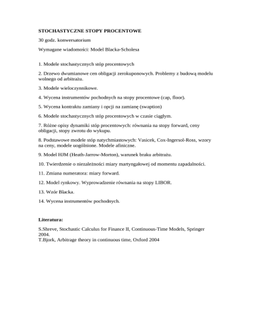 STOCHASTYCZNE STOPY PROCENTOWE 30 godz. konwersatorium Wymagane wiadomości: Model Blacka-Scholesa 1. Modele stochastycznych stóp procentowych 2. Drzewo dwumianowe cen obligacji zerokuponowych. Problemy z budową modelu wolnego od arbitrażu. 3. Modele wieloczynnikowe. 4. Wycena instrumentów pochodnych na stopy procentowe (cap, floor). 5. Wycena kontraktu zamiany i opcji na zamianę (swaption) 6. Modele stochastycznych stóp procentowych w czasie ciągłym. 7. Różne opisy dynamiki stóp procentowych: równania na stopy forward, ceny obligacji, stopy zwrotu do wykupu. 8. Podstawowe modele stóp natychmiastowych: Vasicek, Cox-Ingersol-Ross, wzory na ceny, modele uogólnione. Modele afiniczne. 9. Model HJM (Heath-Jarrow-Morton), warunek braku arbitrażu. 10. Twierdzenie o niezależności miary martyngałowej od momentu zapadalności. 11. Zmiana numeratora: miary forward. 12. Model rynkowy. Wyprowadzenie równania na stopy LIBOR. 13. Wzór Blacka. 14. Wycena instrumentów pochodnych. Literatura: S.Shreve, Stochastic Calculus for Finance II, Continuous-Time Models, Springer 2004. T.Bjork, Arbitrage theory in continuous time, Oxford 2004