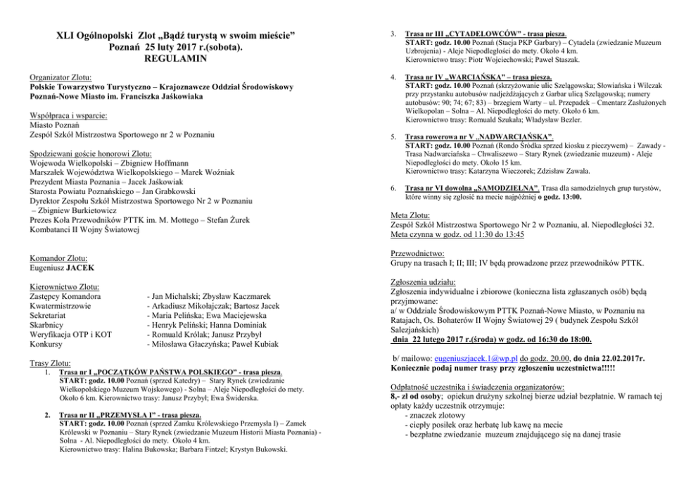 XLI Ogólnopolski Zlot „Bądź turystą w swoim mieście” Poznań 25 luty 2017 r.(sobota). REGULAMIN 3. Trasa nr III „CYTADELOWCÓW” - trasa piesza. START: godz. 10.00 Poznań (Stacja PKP Garbary) – Cytadela (zwiedzanie Muzeum Uzbrojenia) - Aleje Niepodległości do mety. Około 4 km. Kierownictwo trasy: Piotr Wojciechowski; Paweł Staszak. Organizator Zlotu: Polskie Towarzystwo Turystyczno – Krajoznawcze Oddział Środowiskowy Poznań-Nowe Miasto im. Franciszka Jaśkowiaka 4. Trasa nr IV „WARCIAŃSKA” – trasa piesza. START: godz. 10.00 Poznań (skrzyżowanie ulic Szelągowska; Słowiańska i Wilczak przy przystanku autobusów nadjeżdżających z Garbar ulicą Szelągowską; numery autobusów: 90; 74; 67; 83) – brzegiem Warty – ul. Przepadek – Cmentarz Zasłużonych Wielkopolan – Solna – Al. Niepodległości do mety. Około 6 km. Kierownictwo trasy: Romuald Szukała; Władysław Bezler. 5. Trasa rowerowa nr V „NADWARCIAŃSKA”. START: godz. 10.00 Poznań (Rondo Śródka sprzed kiosku z pieczywem) – Zawady Trasa Nadwarciańska – Chwaliszewo – Stary Rynek (zwiedzanie muzeum) - Aleje Niepodległości do mety. Około 15 km. Kierownictwo trasy: Katarzyna Wieczorek; Zdzisław Zawala. 6. Trasa nr VI dowolna „SAMODZIELNA”. Trasa dla samodzielnych grup turystów, które winny się zgłosić na mecie najpóźniej o godz. 13:00. Współpraca i wsparcie: Miasto Poznań Zespół Szkół Mistrzostwa Sportowego nr 2 w Poznaniu Spodziewani goście honorowi Zlotu: Wojewoda Wielkopolski – Zbigniew Hoffmann Marszałek Województwa Wielkopolskiego – Marek Woźniak Prezydent Miasta Poznania – Jacek Jaśkowiak Starosta Powiatu Poznańskiego – Jan Grabkowski Dyrektor Zespołu Szkół Mistrzostwa Sportowego Nr 2 w Poznaniu – Zbigniew Burkietowicz Prezes Koła Przewodników PTTK im. M. Mottego – Stefan Żurek Kombatanci II Wojny Światowej Przewodnictwo: Grupy na trasach I; II; III; IV będą prowadzone przez przewodników PTTK. Komandor Zlotu: Eugeniusz JACEK Kierownictwo Zlotu: Zastępcy Komandora Kwatermistrzowie Sekretariat Skarbnicy Weryfikacja OTP i KOT Konkursy - Jan Michalski; Zbysław Kaczmarek - Arkadiusz Mikołajczak; Bartosz Jacek - Maria Pelińska; Ewa Maciejewska - Henryk Peliński; Hanna Dominiak - Romuald Królak; Janusz Przybył - Miłosława Głaczyńska; Paweł Kubiak Trasy Zlotu: 1. 2. Meta Zlotu: Zespół Szkół Mistrzostwa Sportowego Nr 2 w Poznaniu, al. Niepodległości 32. Meta czynna w godz. od 11:30 do 13:45 Trasa nr I „POCZĄTKÓW PAŃSTWA POLSKIEGO” - trasa piesza. START: godz. 10.00 Poznań (sprzed Katedry) – Stary Rynek (zwiedzanie Wielkopolskiego Muzeum Wojskowego) - Solna – Aleje Niepodległości do mety. Około 6 km. Kierownictwo trasy: Janusz Przybył; Ewa Świderska. Trasa nr II „PRZEMYSŁA I” - trasa piesza. START: godz. 10.00 Poznań (sprzed Zamku Królewskiego Przemysła I) – Zamek Królewski w Poznaniu – Stary Rynek (zwiedzanie Muzeum Historii Miasta Poznania) Solna - Al. Niepodległości do mety. Około 4 km. Kierownictwo trasy: Halina Bukowska; Barbara Fintzel; Krystyn Bukowski. Zgłoszenia udziału: Zgłoszenia indywidualne i zbiorowe (konieczna lista zgłaszanych osób) będą przyjmowane: a/ w Oddziale Środowiskowym PTTK Poznań-Nowe Miasto, w Poznaniu na Ratajach, Os. Bohaterów II Wojny Światowej 29 ( budynek Zespołu Szkół Salezjańskich) dnia 22 lutego 2017 r.(środa) w godz. od 16:30 do 18:00. b/ mailowo: [email protected] do godz. 20.00, do dnia 22.02.2017r. Koniecznie podaj numer trasy przy zgłoszeniu uczestnictwa!!!!! Odpłatność uczestnika i świadczenia organizatorów: 8,- zł od osoby; opiekun drużyny szkolnej bierze udział bezpłatnie. W ramach tej opłaty każdy uczestnik otrzymuje: - znaczek zlotowy - ciepły posiłek oraz herbatę lub kawę na mecie - bezpłatne zwiedzanie muzeum znajdującego się na danej trasie Przewidziane są puchary dla najliczniejszych drużyn, nagrody rzeczowe w konkursach sprawnościowych; konkursie wiedzy o Poznaniu. Konkurs wiedzy o Poznaniu w formie testu odbędzie się o godz. 13.00 w Sali nr 13. Uwaga! W przypadku zgłoszeń po podanym terminie, organizatorzy zastrzegają sobie prawo do nie zapewnienia pełnych świadczeń. Uczestnicy tras rowerowych muszą posiadać kaski; przestrzegać przepisy ruchu drogowego. Wszyscy muszą wykonywać polecenia kierowników tras i przewodników. Każda drużyna winna posiadać apteczkę. XLI OGÓNOPOLSKI ZLOT ŻYCZYMY SŁONECZNEJ POGODY! Rajd dofinansowano z środków: BĄDŹ TURYSTĄ W SWOIM MIEŚCIE Poznań 25.02.2017r (sobota)