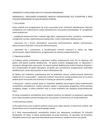 UNIWERSYTET JAGIELLOŃSKI INSTYTUT FILOLOGII GERMAŃSKIEJ ORGANIZACJA I REGULAMIN STUDENCKIEJ PRAKTYKI PEDAGOGICZNEJ DLA STUDENTÓW II ROKU FILOLOGII GERMAŃSKIEJ (STUDIA DRUGIEGO STOPNIA) 1. Cele praktyki Celem praktyki jest przygotowanie do pracy nauczyciela przez możliwość wypróbowania własnych umiejętności oraz wykorzystanie wiedzy doświadczenia nauczyciela prowadzącego. W szczególności celem praktyki jest: - umiejętność planowania lekcji i realizacji tego planu, organizowania lekcji, rozwijania i sprawdzania umiejętności uczniów, wykorzystywania podręcznika i innych materiałów dydaktycznych, - zapoznanie się z innymi obowiązkami nauczyciela (wychowawstwo, godziny wychowawcze, dokumentacja w dzienniku i inne prace administracyjne), - zapoznanie się i uczestnictwo w pozalekcyjnych formach nauczania w szkole, np. kółka zainteresowań, zajęcia fakultatywne, przygotowanie do wymiany międzyszkolnej itp. 2. Organizacja praktyki a) Praktyka szkolna przewidziana programem studiów realizowanych przez IFG UJ obejmuje 150 godzin (120 godzin praktyki dydaktycznej i 30 godzin praktyki pedagogicznej), co odpowiada 2 miesiącom pełnego etatu nauczyciela. W ramach praktyki dydaktycznej student hospituje 50 godzin i sam przeprowadza 50 godzin lekcyjnych, 20 godzin jest przeznaczona przygotowanie materiałów dydaktycznych, asysta nauczycielowi w innych obowiązkach itp. b) Opieka nad studentem organizowana jest na podstawie umowy cywilno-prawnej zawieranej między IFG UJ a nauczycielem - opiekunem praktyki. Honorarium zostaje przelane przez UJ na konto podane przez nauczyciela (nie wcześniej niż miesiąc po ukończeniu praktyki). c) Nauczyciel - opiekun praktyk ustala ze studentem dokładny harmonogram lekcji hospitowanych samodzielnie prowadzonych. Student powinien wybrać z nauczycielem grupę/klasę, której poświęci szczególną uwagę i w której powinien mieć w miarę możliwości jak najwięcej przeprowadzonych lekcji. d) Lekcje prowadzone samodzielnie przez studenta powinny się odbywać na podstawie napisanego przez niego konspektu (zatwierdzonego przez nauczyciela) i omówione po ich przeprowadzeniu. 3. Dokumentacja praktyki a) Wszystkie formy pracy studenta powinny zostać przez niego zapisane w dzienniczku praktyk i być potwierdzone przez nauczyciela sprawującego opiekę. b) Z lekcji przeprowadzonych samodzielnie student jest obowiązany przedstawić 20 (różnych) konspektów. Do lekcji, na której przeprowadza się pracę kontrolną, nie sporządza się konspektu. Konspekty powinny być opatrzone datą (lekcji), ponumerowane i podpisane przez nauczyciela. c) Student powinien dostarczyć ewaluację praktyki, zawierającą m. in. opis szkoły (ilość i liczebność klas, organizacja nauki języków obcych, status języka niemieckiego itp.), metodę nauczyciela, stosowany przez niego podręcznik, charakterystykę grupy, której poświęcił szczególną uwagę oraz krytyczną refleksję na temat swoich postępów w czasie praktyki d) Nauczyciel sprawujący opiekę powinien podać w dzienniczku (rubryka "uwagi zakładu pracy") lub na osobnej kartce opisową ocenę praktyki studenta, uwzględniającą umiejętności metodyczne i ich wykorzystanie w praktyce, sumienność i rzetelność, kompetencje językowe i kulturoznawcze, uczynność i kooperatywność w stosunku do nauczyciela prowadzącego i uczniów, umiejętność nawiązywania interakcji w klasie, stwarzanie przyjaznej atmosfery i utrzymywanie dyscypliny, oraz podać proponowaną ocenę. e) Dokumentacja praktyki powinna zostać dostarczona do Sekretariatu IFG UJ w terminie 2 tygodni od zakończenia praktyki.