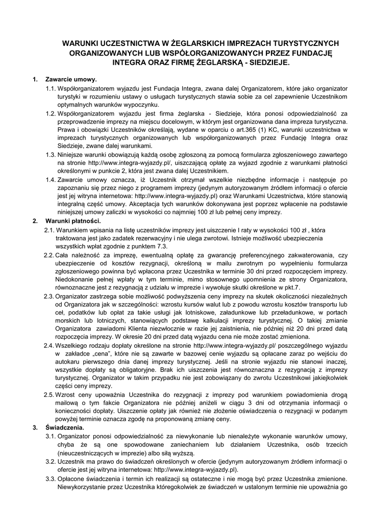 WARUNKI UCZESTNICTWA W ŻEGLARSKICH IMPREZACH TURYSTYCZNYCH ORGANIZOWANYCH LUB WSPÓŁORGANIZOWANYCH PRZEZ FUNDACJĘ INTEGRA ORAZ FIRMĘ ŻEGLARSKĄ - SIEDZIEJE. 1. Zawarcie umowy. 1.1. Współorganizatorem wyjazdu jest Fundacja Integra, zwana dalej Organizatorem, które jako organizator turystyki w rozumieniu ustawy o usługach turystycznych stawia sobie za cel zapewnienie Uczestnikom optymalnych warunków wypoczynku. 1.2. Współorganizatorem wyjazdu jest firma żeglarska - Siedzieje, która ponosi odpowiedzialność za przeprowadzenie imprezy na miejscu docelowym, w którym jest organizowana dana impreza turystyczna. Prawa i obowiązki Uczestników określają, wydane w oparciu o art.365 (1) KC, warunki uczestnictwa w imprezach turystycznych organizowanych lub współorganizowanych przez Fundację Integra oraz Siedzieje, zwane dalej warunkami. 1.3. Niniejsze warunki obowiązują każdą osobę zgłoszoną za pomocą formularza zgłoszeniowego zawartego na stronie http://www.integra-wyjazdy.pl/, uiszczającą opłatę za wyjazd zgodnie z warunkami płatności określonymi w punkcie 2, która jest zwana dalej Uczestnikiem. 1.4. Zawarcie umowy oznacza, iż Uczestnik otrzymał wszelkie niezbędne informacje i następuje po zapoznaniu się przez niego z programem imprezy (jedynym autoryzowanym źródłem informacji o ofercie jest jej witryna internetowa: http://www.integra-wyjazdy.pl) oraz Warunkami Uczestnictwa, które stanowią integralną część umowy. Akceptacja tych warunków dokonywana jest poprzez wpłacenie na podstawie niniejszej umowy zaliczki w wysokości co najmniej 100 zł lub pełnej ceny imprezy. 2. Warunki płatności. 2.1. Warunkiem wpisania na listę uczestników imprezy jest uiszczenie I raty w wysokości 100 zł , która traktowana jest jako zadatek rezerwacyjny i nie ulega zwrotowi. Istnieje możliwość ubezpieczenia wszystkich wpłat zgodnie z punktem 7.3. 2.2. Cała należność za imprezę, ewentualną opłatę za gwarancję preferencyjnego zakwaterowania, czy ubezpieczenie od kosztów rezygnacji, określoną w mailu zwrotnym po wypełnieniu formularza zgłoszeniowego powinna być wpłacona przez Uczestnika w terminie 30 dni przed rozpoczęciem imprezy. Niedokonanie pełnej wpłaty w tym terminie, mimo stosownego upomnienia ze strony Organizatora, równoznaczne jest z rezygnacją z udziału w imprezie i wywołuje skutki określone w pkt.7. 2.3. Organizator zastrzega sobie możliwość podwyższenia ceny imprezy na skutek okoliczności niezależnych od Organizatora jak w szczególności: wzrostu kursów walut lub z powodu wzrostu kosztów transportu lub ceł, podatków lub opłat za takie usługi jak lotniskowe, załadunkowe lub przeładunkowe, w portach morskich lub lotniczych, stanowiących podstawę kalkulacji imprezy turystycznej. O takiej zmianie Organizatora zawiadomi Klienta niezwłocznie w razie jej zaistnienia, nie później niż 20 dni przed datą rozpoczęcia imprezy. W okresie 20 dni przed datą wyjazdu cena nie może zostać zmieniona. 2.4. Wszelkiego rodzaju dopłaty określone na stronie http://www.integra-wyjazdy.pl/ poszczególnego wyjazdu w zakładce „cena”, które nie są zawarte w bazowej cenie wyjazdu są opłacane zaraz po wejściu do autokaru pierwszego dnia danej imprezy turystycznej. Jeśli na stronie wyjazdu nie stanowi inaczej, wszystkie dopłaty są obligatoryjne. Brak ich uiszczenia jest równoznaczna z rezygnacją z imprezy turystycznej. Organizator w takim przypadku nie jest zobowiązany do zwrotu Uczestnikowi jakiejkolwiek części ceny imprezy. 2.5. Wzrost ceny upoważnia Uczestnika do rezygnacji z imprezy pod warunkiem powiadomienia drogą mailową o tym fakcie Organizatora nie później aniżeli w ciągu 3 dni od otrzymania informacji o konieczności dopłaty. Uiszczenie opłaty jak również nie złożenie oświadczenia o rezygnacji w podanym powyżej terminie oznacza zgodę na proponowaną zmianę ceny. 3. Świadczenia. 3.1. Organizator ponosi odpowiedzialność za niewykonanie lub nienależyte wykonanie warunków umowy, chyba że są one spowodowane zaniechaniem lub działaniem Uczestnika, osób trzecich (nieuczestniczących w imprezie) albo siłą wyższą. 3.2. Uczestnik ma prawo do świadczeń określonych w ofercie (jedynym autoryzowanym źródłem informacji o ofercie jest jej witryna internetowa: http://www.integra-wyjazdy.pl). 3.3. Opłacone świadczenia i termin ich realizacji są ostateczne i nie mogą być przez Uczestnika zmienione. Niewykorzystanie przez Uczestnika któregokolwiek ze świadczeń w ustalonym terminie nie upoważnia go do otrzymania zwrotu części lub całości opłaty wniesionej na rzecz Organizatora. Dotyczy to także wszelkich przypadków niezależnych od organizatora jak np. odmowy wydania paszportu lub brak dokumentów uprawniających do przekraczania granicy, choroby lub innych przypadków losowych oraz przypadków, gdy władze graniczne poszczególnych krajów nie wydadzą zezwolenia na wjazd uczestnika do ich kraju. 3.4. Organizator zwróci Uczestnikowi wartość niezrealizowanych świadczeń lub różnicę wartości między świadczeniami określonymi w umowie a świadczeniami zastępczymi w przypadku, gdy Uczestnikowi nie zostały zaoferowane świadczenia o tej samej lub wyższej wartości. 3.5. Organizator posiada wymaganą przez Ustawę o Usługach Turystycznych gwarancję ubezpieczeniową wystawioną przez TU Europa S.A. o numerze GT 51/2015, która zapewnia Klientom powrót do kraju. 3.6. Zawierając umowę Uczestnik deklaruje, iż stan jego zdrowia umożliwia udział w imprezie i nie ma przeciwskazań do uprawiania żeglarstwa. 4. Odpowiedzialność Uczestnika. 4.1. Od chwili rozpoczęcia imprezy Uczestnik zobowiązany jest bezwzględnie stosować się do wskazówek przedstawicieli Organizatora (tzw. Kadry, Skipperów, Sterników), dotyczących wszelkich kwestii porządkowych, realizacji programu imprezy, oraz bezpieczeństwa na pokładzie jachtu, w przypadku nie stosowania się d