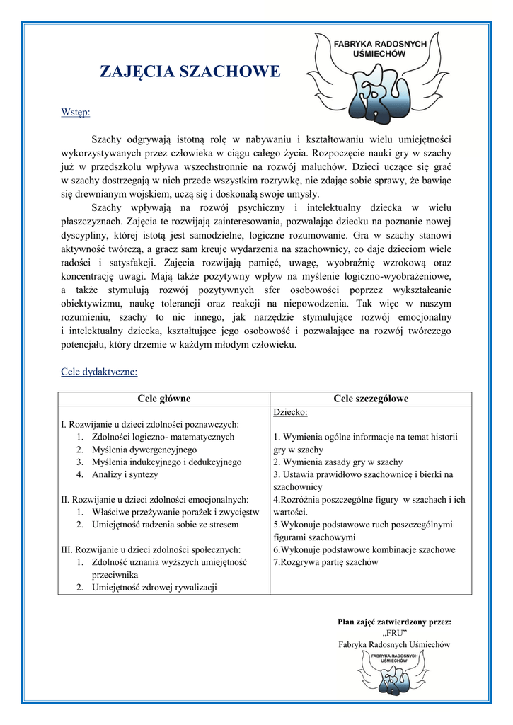 ZAJĘCIA SZACHOWE Wstęp: Szachy odgrywają istotną rolę w nabywaniu i kształtowaniu wielu umiejętności wykorzystywanych przez człowieka w ciągu całego życia. Rozpoczęcie nauki gry w szachy już w przedszkolu wpływa wszechstronnie na rozwój maluchów. Dzieci uczące się grać w szachy dostrzegają w nich przede wszystkim rozrywkę, nie zdając sobie sprawy, że bawiąc się drewnianym wojskiem, uczą się i doskonalą swoje umysły. Szachy wpływają na rozwój psychiczny i intelektualny dziecka w wielu płaszczyznach. Zajęcia te rozwijają zainteresowania, pozwalając dziecku na poznanie nowej dyscypliny, której istotą jest samodzielne, logiczne rozumowanie. Gra w szachy stanowi aktywność twórczą, a gracz sam kreuje wydarzenia na szachownicy, co daje dzieciom wiele radości i satysfakcji. Zajęcia rozwijają pamięć, uwagę, wyobraźnię wzrokową oraz koncentrację uwagi. Mają także pozytywny wpływ na myślenie logiczno-wyobrażeniowe, a także stymulują rozwój pozytywnych sfer osobowości poprzez wykształcanie obiektywizmu, naukę tolerancji oraz reakcji na niepowodzenia. Tak więc w naszym rozumieniu, szachy to nic innego, jak narzędzie stymulujące rozwój emocjonalny i intelektualny dziecka, kształtujące jego osobowość i pozwalające na rozwój twórczego potencjału, który drzemie w każdym młodym człowieku. Cele dydaktyczne: Cele główne Cele szczegółowe Dziecko: I. Rozwijanie u dzieci zdolności poznawczych: 1. Zdolności logiczno- matematycznych 2. Myślenia dywergencyjnego 3. Myślenia indukcyjnego i dedukcyjnego 4. Analizy i syntezy II. Rozwijanie u dzieci zdolności emocjonalnych: 1. Właściwe przeżywanie porażek i zwycięstw 2. Umiejętność radzenia sobie ze stresem III. Rozwijanie u dzieci zdolności społecznych: 1. Zdolność uznania wyższych umiejętność przeciwnika 2. Umiejętność zdrowej rywalizacji 1. Wymienia ogólne informacje na temat historii gry w szachy 2. Wymienia zasady gry w szachy 3. Ustawia prawidłowo szachownicę i bierki na szachownicy 4.Rozróżnia poszczególne figury w szachach i ich wartości. 5.Wykonuje podstawowe ruch poszczególnymi figurami szachowymi 6.Wykonuje podstawowe kombinacje szachowe 7.Rozgrywa partię szachów Plan zajęć zatwierdzony przez: „FRU” Fabryka Radosnych Uśmiechów