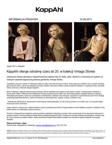 INFORMACJA PRASOWA 12.09.2011 Jesień 2011 w KappAhl KappAhl oferuje odrobinę czaru lat 20. w kolekcji Vintage Stories Jesienią do kolekcji damskiej w KappAhl powrócą radosne lata 20. Hafty, perły i aksamit w nowoczesnym wydaniu są ważnymi częściami tegorocznej jesiennej garderoby Vintage Stories. Czerpaliśmy pomysły z serialu TV Zakazane Imperium, który zimą miał premierę w Polsce. Akcja dzieje się w Atlantic City w czasach prohibicji, gdy szykowne kluby i salony były zakazaną rozrywką. Kobiety noszą luźne sukienki zdobione pięknymi detalami i w wygodnym kroju, opowiada Carina Johansson, kierownik designu KappAhl. Słowo ”elegancja” najlepiej podsumowuje tę kolekcję. Wśród materiałów jest między innymi aksamit i szyfon z dopracowanymi detalami w formie pereł i haftów. Pojawią się też współczesne wersje ponadczasowych frędzli i plis, które będą świetnie wyglądać jesienią na parkiecie. Kolorystyka jest łagodna, opiera się na tonacjach musztardowych, zielonych oraz różowych i przywodzi na myśl salonowe życie lat 20. Wygląd uzupełniają doskonałe akcesoria, wśród nich kołnierz ze sztucznego futra i opaska na włosy z detalami z piór. - Kolekcja jest udekorowana, dopracowana i jednocześnie niezobowiązująca, by móc nosić ją zarówno na co dzień, jak i na uroczyste okazje, kontynuuje Carina Johansson. Lejące sukienki o luźnym kroju i piękna biżuteria z pereł są podstawą tej kolekcji. Przygotowaliśmy również delikatny sweterek z frędzlami, który będzie idealny na chłodniejsze, jesienne wieczory. Pomysł na Vintage Stories pojawił się podczas podróży projektantów KappAhl po świecie, które zainspirowały ich do stworzenia limitowanych i modnych kolekcji. Pierwsza kolekcja Vintage Stories wystartowała jesienią 2009. W kolejnych sezonach tematem był orientalizm, kolorowe lata 50. oraz romantyczny przełom wieków. Jesienna kolekcja Vintage Stories będzie dostępna we wszystkich sklepach KappAhl na początku listopada. Więcej informacji i zdjęć: Paulina Szwaj, Specjalista ds. Marketingu, [email protected], (22) 53 57 303 KappAhl jest wiodącą siecią sklepów odzieżowych z około 370 sklepami i 4 800 pracownikami w Szwecji, Norwegii, Finlandii, Polsce i Czechach. KappAhl sprzedaje niedrogą modę dla różnych klientów – kobiet, mężczyzn i dzieci – a w szczególności skupia się na kobietach w wieku 30-50 lat z rodziną. Wszystkie ubrania są projektowane przez projektantów KappAhl. KappAhl jako pierwsza sieć sklepów odzieżowych uzyskał w 1999 certyfikat środowiskowy. W roku obrotowym 2009/2010 obroty w KappAhl wyniosły 5,1 mld koron szwedzkich a zysk operacyjny 551 mln koron. KappAhl jest notowany na Nasdaq OMX Stockholm. Więcej informacji na www.kappahl.com. KappAhl Polska Sp. z o.o, ul. Leszno 12, 01-192 Warszawa www.kappahl.pl
