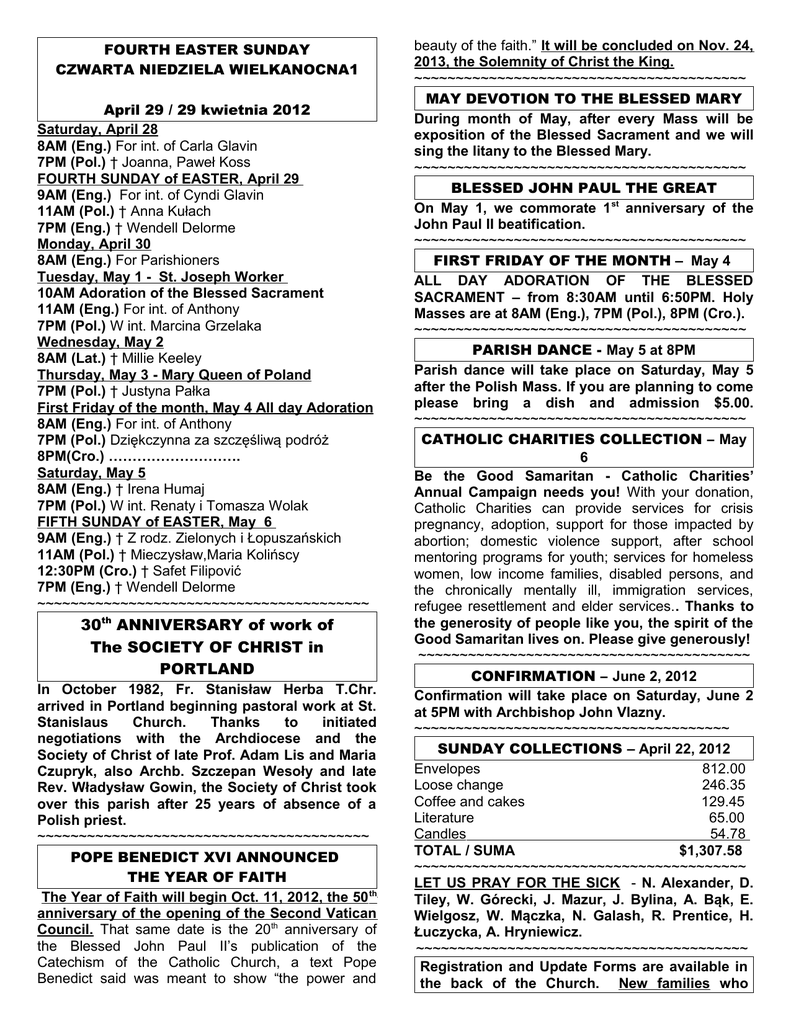 FOURTH EASTER SUNDAY CZWARTA NIEDZIELA WIELKANOCNA1 April 29 / 29 kwietnia 2012 Saturday, April 28 8AM (Eng.) For int. of Carla Glavin 7PM (Pol.) † Joanna, Paweł Koss FOURTH SUNDAY of EASTER, April 29 9AM (Eng.) For int. of Cyndi Glavin 11AM (Pol.) † Anna Kułach 7PM (Eng.) † Wendell Delorme Monday, April 30 8AM (Eng.) For Parishioners Tuesday, May 1 - St. Joseph Worker 10AM Adoration of the Blessed Sacrament 11AM (Eng.) For int. of Anthony 7PM (Pol.) W int. Marcina Grzelaka Wednesday, May 2 8AM (Lat.) † Millie Keeley Thursday, May 3 - Mary Queen of Poland 7PM (Pol.) † Justyna Pałka First Friday of the month, May 4 All day Adoration 8AM (Eng.) For int. of Anthony 7PM (Pol.) Dziękczynna za szczęśliwą podróż 8PM(Cro.) ………………………. Saturday, May 5 8AM (Eng.) † Irena Humaj 7PM (Pol.) W int. Renaty i Tomasza Wolak FIFTH SUNDAY of EASTER, May 6 9AM (Eng.) † Z rodz. Zielonych i Łopuszańskich 11AM (Pol.) † Mieczysław,Maria Kolińscy 12:30PM (Cro.) † Safet Filipović 7PM (Eng.) † Wendell Delorme ~~~~~~~~~~~~~~~~~~~~~~~~~~~~~~~~~~~~~~~~ 30th ANNIVERSARY of work of The SOCIETY OF CHRIST in PORTLAND In October 1982, Fr. Stanisław Herba T.Chr. arrived in Portland beginning pastoral work at St. Stanislaus Church. Thanks to initiated negotiations with the Archdiocese and the Society of Christ of late Prof. Adam Lis and Maria Czupryk, also Archb. Szczepan Wesoły and late Rev. Władysław Gowin, the Society of Christ took over this parish after 25 years of absence of a Polish priest. ~~~~~~~~~~~~~~~~~~~~~~~~~~~~~~~~~~~~~~~~ POPE BENEDICT XVI ANNOUNCED THE YEAR OF FAITH The Year of Faith will begin Oct. 11, 2012, the 50 th anniversary of the opening of the Second Vatican Council. That same date is the 20th anniversary of the Blessed John Paul II’s publication of the Catechism of the Catholic Church, a text Pope Benedict said was meant to show “the power and beauty of the faith.” It will be concluded on Nov. 24, 2013, the Solemnity of Christ the King. ~~~~~~~~~~~~~~~~~~~~~~~~~~~~~~~~~~~~~~~~ MAY DEVOTION TO THE BLESSED MARY During month of May, after every Mass will be exposition of the Blessed Sacrament and we will sing the litany to the Blessed Mary. ~~~~~~~~~~~~~~~~~~~~~~~~~~~~~~~~~~~~~~~~ BLESSED JOHN PAUL THE GREAT On May 1, we commorate 1 st anniversary of the John Paul II beatification. ~~~~~~~~~~~~~~~~~~~~~~~~~~~~~~~~~~~~~~~~ FIRST FRIDAY OF THE MONTH – May 4 ALL DAY ADORATION OF THE BLESSED SACRAMENT – from 8:30AM until 6:50PM. Holy Masses are at 8AM (Eng.), 7PM (Pol.), 8PM (Cro.). ~~~~~~~~~~~~~~~~~~~~~~~~~~~~~~~~~~~~~~~~ PARISH DANCE - May 5 at 8PM Parish dance will take place on Saturday, May 5 after the Polish Mass. If you are planning to come please bring a dish and admission $5.00. ~~~~~~~~~~~~~~~~~~~~~~~~~~~~~~~~~~~~~~~~ CATHOLIC CHARITIES COLLECTION – May 6 Be the Good Samaritan - Catholic Charities’ Annual Campaign needs you! With your donation, Catholic Charities can provide services for crisis pregnancy, adoption, support for those impacted by abortion; domestic violence support, after school mentoring programs for youth; services for homeless women, low income families, disabled persons, and the chronically mentally ill, immigration services, refugee resettlement and elder services.. Thanks to the generosity of people like you, the spirit of the Good Samaritan lives on. Please give generously! ~~~~~~~~~~~~~~~~~~~~~~~~~~~~~~~~~~~~~~~~ CONFIRMATION – June 2, 2012 Confirmation will take place on Saturday, June 2 at 5PM with Archbishop John Vlazny. ~~~~~~~~~~~~~~~~~~~~~~~~~~~~~~~~~~~~~~ SUNDAY COLLECTIONS – April 22, 2012 Envelopes 812.00 Loose change 246.35 Coffee and cakes 129.45 Literature 65.00 Candles 54.78 TOTAL / SUMA $1,307.58 ~~~~~~~~~~~~~~~~~~~~~~~~~~~~~~~~~~~~~~~~ LET US PRAY FOR THE SICK - N. Alexander, D. Tiley, W. Górecki, J. Mazur, J. Bylina, A. Bąk, E. Wielgosz, W. Mączka, N. Galash, R. Prentice, H. Łuczycka, A. Hryniewicz. ~~~~~~~~~~~~~~~~~~~~~~~~~~~~~~~~~~~~~~~~ Registration and Update Forms are available in the back of the Church. New families who moved to Oregon and would like to join our parish family are asked to complete the form and return it to Fr. Piotr. ~~~~~~~~~~~~~~~~~~~~~~~~~~~~~~~~~~~~~~~~ Jubileusz 30-tu lat pracy Towarzystwa Chrystusowego w Portland W październiku 1982 roku przybył do parafii św. Stanisława BM ksiądz Stanisław Herba T.Chr. Był on pierwszym chrystusowcem, który rozpoczął misję odnowienia polskiej parafii, po 25-ciu latach nieobecności polskiego duszpasterza. ~~~~~~~~~~~~~~~~~~~~~~~~~~~~~~~~~~~~~~~~ NABOŻEŃSTWA MAJOWE Przez miesiąc maj, po każdej Mszy św. Wystawienie Najśw. Sakramentu i litania Loretańska do N.M.P. ~~~~~~~~~~~~~~~~~~~~~~~~~~~~~~~~~~~~~~~~ INTENCJE RÓŻAŃCOWE NA MAJ Aby w społeczeństwie były promowane inicjatywy chroniące i umacniające rolę rodziny. Zmiana tajemnic różańcowych zaraz po Mszy św. w niedzielę, 13 maja ~~~~~~~~~~~~~~~~~~~~~~~~~~~~~~~~~~~~~~~~ CAŁODNIOWA ADORACJA – 4 maja W KAŻDY PIERWSZY PIĄTEK MIESIĄCA – CAŁODNIOWA ADORACJA - od 8:30 do 18:50. Msze św. o godz. 8:00 (ang.), 19:00 (pol.), 20:00 (chor.). ~~~~~~~~~~~~~~~~~~~~~~~~~~~~~~~~~~~~~~~~ MAJÓWKA - ZABAWA PARAFIALNA Sobota, 5 maja o godz. 20:00 Zapraszamy wszystkich parafian na zabawę majową w sobotę, 5 maja o godz. 20:00. Osoby, które planują przyjść, proszone są o przyniesienie jakiegoś dania i wejściowe $5.00. ~~~~~~~~~~~~~~~~~~~~~~~~~~~~~~~~~~~~~~ PIERWSZA KOMUNIA ŚW. – 20 maja Dzisiaj, w niedzielę, 29 kwietnia po Mszy św. będzie egzamin dla dzieci przystępujących do Pierwszej Komunii Św. - dzieci przychodzą z rodzicami. Spowiedź przed Komunią jest w sobotę, 19 maja o godz. 18:00. ~~~~~~~~~~~~~~~~~~~~~~~~~~~~~~~~~~~~~~~~ ŚWIĘCENIA W TOWARZYSTWIE CHRYSTUSOWYM W 80-tą rocznicę istnienia Towarzystwa Chrystusowego, założonego przez kardynała Augusta Hlonda w 1932. Będą miały miejsca niezwykłe święcenia kapłański