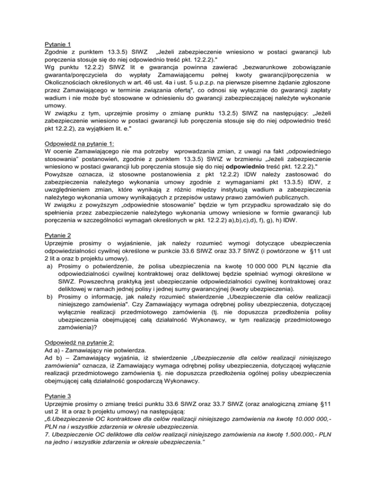 Pytanie 1 Zgodnie z punktem 13.3.5) SIWZ „Jeżeli zabezpieczenie wniesiono w postaci gwarancji lub poręczenia stosuje się do niej odpowiednio treść pkt. 12.2.2)." Wg punktu 12.2.2) SIWZ lit e gwarancja powinna zawierać „bezwarunkowe zobowiązanie gwaranta/poręczyciela do wypłaty Zamawiającemu pełnej kwoty gwarancji/poręczenia w Okolicznościach określonych w art. 46 ust. 4a i ust. 5 u.p.z.p. na pierwsze pisemne żądanie zgłoszone przez Zamawiającego w terminie związania ofertą", co odnosi się wyłącznie do gwarancji zapłaty wadium i nie może być stosowane w odniesieniu do gwarancji zabezpieczającej należyte wykonanie umowy. W związku z tym, uprzejmie prosimy o zmianę punktu 13.2.5) SIWZ na następujący: „Jeżeli zabezpieczenie wniesiono w postaci gwarancji lub poręczenia stosuje się do niej odpowiednio treść pkt 12.2.2), za wyjątkiem lit. e." Odpowiedź na pytanie 1: W ocenie Zamawiającego nie ma potrzeby wprowadzania zmian, z uwagi na fakt „odpowiedniego stosowania” postanowień, zgodnie z punktem 13.3.5) SWIZ w brzmieniu „Jeżeli zabezpieczenie wniesiono w postaci gwarancji lub poręczenia stosuje się do niej odpowiednio treść pkt. 12.2.2)." Powyższe oznacza, iż stosowne postanowienia z pkt 12.2.2) IDW należy zastosować do zabezpieczenia należytego wykonania umowy zgodnie z wymaganiami pkt 13.3.5) IDW, z uwzględnieniem zmian, które wynikają z różnic między instytucją wadium a zabezpieczenia należytego wykonania umowy wynikających z przepisów ustawy prawo zamówień publicznych. W związku z powyższym „odpowiednie stosowanie” będzie w tym przypadku sprowadzało się do spełnienia przez zabezpieczenie należytego wykonania umowy wniesione w formie gwarancji lub poręczenia w szczególności wymagań określonych w pkt. 12.2.2) a),b),c),d), f), g), h) IDW. Pytanie 2 Uprzejmie prosimy o wyjaśnienie, jak należy rozumieć wymogi dotyczące ubezpieczenia odpowiedzialności cywilnej określone w punkcie 33.6 SIWZ oraz 33.7 SIWZ (i powtórzone w §11 ust 2 lit a oraz b projektu umowy). a) Prosimy o potwierdzenie, że polisa ubezpieczenia na kwotę 10 000 000 PLN łącznie dla odpowiedzialności cywilnej kontraktowej oraz deliktowej będzie spełniać wymogi określone w SIWZ. Powszechną praktyką jest ubezpieczanie odpowiedzialności cywilnej kontraktowej oraz deliktowej w ramach jednej polisy i jednej sumy gwarancyjnej (kwoty ubezpieczenia). b) Prosimy o informację, jak należy rozumieć stwierdzenie „Ubezpieczenie dla celów realizacji niniejszego zamówienia". Czy Zamawiający wymaga odrębnej polisy ubezpieczenia, dotyczącej wyłącznie realizacji przedmiotowego zamówienia (tj. nie dopuszcza przedłożenia polisy ubezpieczenia obejmującej całą działalność Wykonawcy, w tym realizację przedmiotowego zamówienia)? Odpowiedź na pytanie 2: Ad a) - Zamawiający nie potwierdza. Ad b) – Zamawiający wyjaśnia, iż stwierdzenie „Ubezpieczenie dla celów realizacji niniejszego zamówienia" oznacza, iż Zamawiający wymaga odrębnej polisy ubezpieczenia, dotyczącej wyłącznie realizacji przedmiotowego zamówienia tj. nie dopuszcza przedłożenia ogólnej polisy ubezpieczenia obejmującej całą działalność gospodarczą Wykonawcy. Pytanie 3 Uprzejmie prosimy o zmianę treści punktu 33.6 SIWZ oraz 33.7 SIWZ (oraz analogiczną zmianę §11 ust 2 lit a oraz b projektu umowy) na następującą: „6.Ubezpieczenie OC kontraktowe dla celów realizacji niniejszego zamówienia na kwotę 10.000 000,PLN na i wszystkie zdarzenia w okresie ubezpieczenia. 7. Ubezpieczenie OC deliktowe dla celów realizacji niniejszego zamówienia na kwotę 1.500.000,- PLN na jedno i wszystkie zdarzenia w okresie ubezpieczenia.” Zapis „na jedno i wszystkie zdarzenia" jest powszechnie stosowany i oznacza, że nie ma ograniczenia co do liczby zdarzeń, ale łączna kwota odszkodowań wypłaconych w okresie ubezpieczenia nie może przekroczyć kwoty określonej w polisie (sumy gwarancyjnej). Brak ograniczenia łącznej kwoty odszkodowań wypłaconych w okresie ubezpieczenia skutkowałoby niewspółmiernie wysokim kosztem ubezpieczenia. Ponadto, w razie bardzo wysokiej sumy gwarancyjnej brak takiego ograniczenia może wręcz oznaczać, że uzyskanie takiej polisy na rynku ubezpieczeń gospodarczych będzie niemożliwe Odpowiedź na pytanie 3: Zamawiający nie wyraża zgody na proponowaną zmianę i podtrzymuje zapisy SIWZ. Zgodnie z powszechnie obowiązującymi przepisami suma gwarancyjna może być określona na jedno i wszystkie zdarzenia lub też na jedno zdarzenie bez ograniczenia liczby zdarzeń. Oba zapisy są powszechnie stosowane.