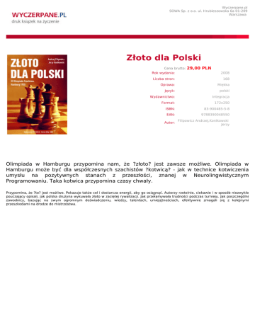 Wyczerpane.pl SOWA Sp. z o.o. ul. Hrubieszowska 6a 01-209 Warszawa Złoto dla Polski Cena brutto: Rok wydania: 29,00 PLN 2008 Liczba stron: 168 Oprawa: Miękka Język: polski Wydawnictwo: Integracja Format: 172x250 ISBN: 83-900485-5-8 EAN: 9788390048550 Autor: Filipowicz Andrzej,Konikowski Jerzy Olimpiada w Hamburgu przypomina nam, że ?złoto? jest zawsze możliwe. Olimpiada w Hamburgu może być dla współczesnych szachistów ?kotwicą? - jak w technice kotwiczenia umysłu na pozytywnych stanach z przeszłości, znanej w Neurolingwistycznym Programowaniu. Taka kotwica przypomina czasy chwały. Przypomina, że ?to? jest możliwe. Pokazuje także cel i dostarcza energii, aby go osiągnąć. Autorzy rzetelnie, ciekawie i w sposób niezwykle pouczający opisali, jak polska drużyna wykuwała złoto w zaciętej rywalizacji. Jak przełamywała trudności podczas turnieju. Jak poszczególni zawodnicy, bazując na swym ogromnym doświadczeniu, wiedzy, talentach, umiejętnościach, efektywnie zmagali się z kolejnymi przeszkodami na drodze do mistrzostwa.