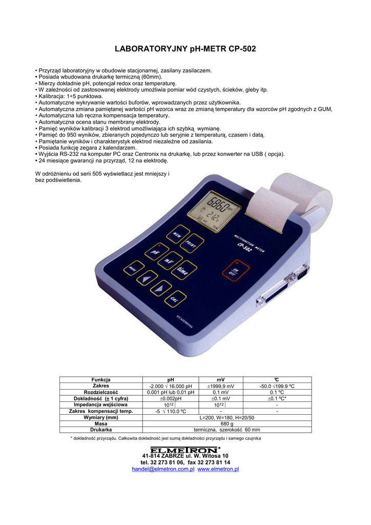 LABORATORYJNY pH-METR CP-502 • Przyrząd laboratoryjny w obudowie stacjonarnej, zasilany zasilaczem. • Posiada wbudowana drukarkę termiczną (60mm). • Mierzy dokładnie pH, potencjał redox oraz temperaturę. • W zaleŜności od zastosowanej elektrody umoŜliwia pomiar wód czystych, ścieków, gleby itp. • Kalibracja: 1÷5 punktowa. • Automatyczne wykrywanie wartości buforów, wprowadzanych przez uŜytkownika. • Automatyczna zmiana pamiętanej wartości pH wzorca wraz ze zmianą temperatury dla wzorców pH zgodnych z GUM, • Automatyczna lub ręczna kompensacja temperatury. • Automatyczna ocena stanu membrany elektrody. • Pamięć wyników kalibracji 3 elektrod umoŜliwiająca ich szybką wymianę. • Pamięć do 950 wyników, zbieranych pojedynczo lub seryjnie z temperaturą, czasem i datą. • Pamiętanie wyników i charakterystyk elektrod niezaleŜne od zasilania. • Posiada funkcję zegara z kalendarzem. • Wyjścia RS-232 na komputer PC oraz Centronix na drukarkę, lub przez konwerter na USB ( opcja). • 24 miesiące gwarancji na przyrząd, 12 na elektrodę. W odróŜnieniu od serii 505 wyświetlacz jest mniejszy i bez podświetlenia. Funkcja Zakres Rozdzielczość Dokładność (± ± 1 cyfra) Impedancja wejściowa Zakres kompensacji temp. Wymiary (mm) Masa Drukarka pH -2.000 ÷ 16.000 pH 0.001 pH lub 0,01 pH ±0.002pH 1012Ω -5 ÷ 110.0 ºC mV °C ±1999,9 mV -50.0 ÷199.9 ºC 0.1 mV 0.1 ºC ±0.1 mV ±0.1 ºC* 1012Ω L=200, W=180, H=20/50 680 g termiczna, szerokość 60 mm * dokładność przyrządu. Całkowita dokładność jest sumą dokładności przyrządu i samego czujnika 41-814 ZABRZE ul. W. Witosa 10 tel. 32 273 81 06, fax 32 273 81 14 [email protected] www.elmetron.pl
