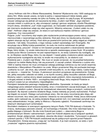 Dariusz Kowalczyk SJ - Cud i trzeźwość piątek, 10 września 2010 09:26 Jerzy Hoffman robi film o Bitwie Warszawskiej. Świetnie! Wydarzenia roku 1920 zasługują na dobry film. Wielu wszak uważa, że była to jedna z najważniejszych bitew świata, gdyż powstrzymała sowiecką nawałę nie tylko na Polskę, ale także na całą Europę. W wywiadach reżyser odżegnuje się jednak od nazywania tej bitwy „Cudem nad Wisłą”. Jego zdaniem zaczęto mówić o cudzie po to, aby umniejszyć zasługi i geniusz wojskowy Józefa Piłsudskiego. Innymi słowy, określenie „cud” miało sugerować, że marszałek odniósł zwycięstwo podobnie, jak miernemu studentowi udaje się zdać egzamin. Mówimy wówczas: „Cudem udało mu się zdać”. Hoffman zdaje się uważać, że wiara w cud wyklucza męstwo żołnierza i geniusz wojskowy. Czy rzeczywiście? Pojęcie „cudu” rozumiemy zbyt wąsko jako wydarzenie przekraczające prawa natury, zupełnie niezrozumiałe z racjonalnego punktu widzenia. Ktoś jest chory na nieuleczalną chorobę i raptem okazuje się być zdrowy. Ktoś idzie po powierzchni jeziora tak, jakby stąpał po miękkim dywanie. I tak dalej. Oczywiście, o tego rodzaju cudach opowiadają nam Ewangelie. Ale wczytując się w Biblię trzeba powiedzieć, że cudu nie można redukować do jakiejś nadzwyczajnej „sztuczki”. Chodzi w nim bowiem przede wszystkim o dostrzeżenie obecności Boga, który działa, i to wcale niekoniecznie w sposób zawieszający prawa fizyki. W przejściu Izraela przez Morze Czerwone nie jest najważniejsze to, że wody cudownie się rozstąpiły, ale to, że Mojżesz zaufał Bogu, który mu się objawił. I nawet gdyby znaleziono jakieś naturalne wytłumaczenie rozstąpienia się wód, to wcale nie znaczyłoby to, że obalono cud. Podobnie jest z „Cudem nad Wisłą”. Nie musi on wcale oznaczać, że na przykład bolszewicy zobaczyli na niebie Matkę Bożą i tak się przerazili, iż zaczęli uciekać. Mówienie o cudzie roku 1920 w żadnej mierze nie musi umniejszać odwagi polskiego żołnierza czy też sztuki wojennej dowódców z Marszalkiem Piłsudskim na czele. Wręcz przeciwnie! Bóg nie pochwala biernego „czekania na cud”, ale chce, aby człowiek zrobił wszystko to, co do niego należy. Łaska buduje na naturze — mawiał św. Tomasz. A pierwszym jezuitom przypisuje się powiedzenie: Działaj tak, jakby wszystko zależało od ciebie, a na wyniki oczekuj, jakby wszystko zależało od Boga. Możemy zatem z jednej strony sławić postawę wojsk polskich, które zwyciężyły bolszewików, a z drugiej widzieć w bitwie 1920 r. szczególną obecność Boga, który wspierał Polaków w trudnym czasie tuż po odzyskaniu niepodległości. Pamiętam świadectwo pewnego niepijącego alkoholika. Opowiadał, że kiedy po latach nałogowego picia odstawił wreszcie butelkę, wraz z trzeźwieniem zaczął dostrzegać, że życie jest jednym wielkim cudem. Zaczął też doświadczać obecności Boga w prostych, codziennych sprawach. By dojrzeć cudowne działanie Boga, trzeba niekiedy po prostu wytrzeźwieć. Pozbyć się klapek na oczach. Dlatego cud potrzebuje wiary. Ale nie wiary rozumianej jako ślepy akt wbrew rozumowi, lecz wiary jako zaufania i otwarcia na rzeczywistość. Kiedy Jezus dokonywał cudów, jedni radowali się, że widzą działanie Boga pośród nich; inni natomiast zamykali się w swej zatwardziałości, knując, jakby tu Mistrza z Nazaretu zgładzić. Pozostawali zamknięci we własnych ideologicznych schematach. Słuchałem niedawno w szerzącym agresywny laicyzm Radiu TOK FM dyskusji o Kościele. To znaczy, dyskutujący panowie uważali, że rozmawiają o Kościele. Dla mnie natomiast była to gadka ślepego o kolorach. Bo dla mnie Kościół jest cudem — obecnością Boga w proklamowanym Słowie i sakramentach. Latem ten Kościół objawia się w tysiącach spotkań, wspólnot, liturgii, pielgrzymek, rekolekcji, obozów dla dzieci i studentów. Tymczasem w głowach czterech panów z TOK FM Kościół zredukował się do politycznych sporów przed Pałacem Prezydenckim. Dzisiaj wszyscy „znają się” na Kościele. A ja mam wrażenie, ze wielu z tych „znawców” najpierw powinno wytrzeźwieć. 1/2 Dariusz Kowalczyk SJ - Cud i trzeźwość piątek, 10 września 2010 09:26 za: "Idziemy" nr 34/2010 (xwk) 2/2