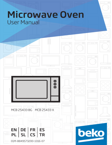 Microwave Oven User Manual MCB 25433 BG MCB 25433 X EN DE FR ES PL SL CS TR 01M-8849573200-1016-07 Proszę najpierw przeczytać tę instrukcję obsługi! Drodzy Klienci, Dziękujemy za wybór wyrobu marki Beko. Mamy nadzieję, że wyrób ten, wyprodukowany przy użyciu wysokiej jakości najnowszej technologii, okaże się w najwyższym stopniu zadowalający. Dlatego proszę przed jego użyciem uważnie przeczytać całą tę instrukcję obsługi i towarzyszące jej dokumenty i zachować ją do wglądu na przyszłość. Przy przekazaniu tego wyrobu komuś innemu, proszę oddać mu także tę instrukcję. Proszę przestrzegać wszystkich ostrzeżeń i informacji z tej instrukcji obsługi. Znaczenie symboli W różnych rozdziałach niniejszej instrukcji stosuje się następujące symbole: C A Ważne informacje i przydatne wskazówki dotyczące użytkowania. Ostrzeżenia dotyczące sytuacji zagrażających bezpieczeństwu, życiu i mieniu. Ostrzeżenie przed gorącymi powierzchniami. Urządzenie zostało wyprodukowane w nowoczesnych, bezpiecznych dla środowiska zakładach bez wpływu na przyrodę. Urządzenie jest zgodne z dyrektywą WEEE. Nie zawiera bifenyli polichlorowanych (PCB). SPIS TREŚCI 1Ważne instrukcje dotyczące bezpieczeństwa i ochrony środowiska naturalnego 108 1.1 Bezpieczeństwo: Zasady ogólne................... 108 1.1.1 Bezpieczeństwo: Elektryczność.................. 110 1.1.2 Bezpieczeństwo: Wyrób................................. 111 1.2 Przeznaczenie....................................................... 112 1.3 Bezpieczeństwo: Dzieci..................................... 112 1.4 Zgodność z dyrektywą WEEE i pozbywanie się zużytych wyrobów .................................................... 113 1.5 Informacje o opakowaniu ................................. 113 2Twoja kuchenka mikrofalowa114 2.1 Opis ogólny............................................................. 114 2.1.1 Elementy sterujące i części .......................... 114 2.1.2 Dane techniczne............................................... 114 2.1.3 Zakładanie talerza obrotowego................. 115 3Montaż i podłączenie 116 3.1 Montaż i podłączenie.......................................... 116 3.2 Montaż zabudowany.......................................... 117 3.2.1 Wymiary mebli do montażu zabudowanego............................................................ 117 3.2.2 Przygotowanie szafki..................................... 118 3.2.3 Mocowanie kuchenki...................................... 119 3.3 Zakłócenia radiowe............................................. 120 3.4 Zasady gotowania w kuchence mikrofalowej.................................................................. 120 3.5 Instrukcje uziemiania......................................... 120 3.6 Test przyborów..................................................... 121 4.4 Termoobieg ........................................................... 124 4.4.1 Gotowanie z termoobiegiem (z funkcją podgrzewania) ........................................ 124 4.4.2 Gotowanie z termoobiegiem (Bez funkcji podgrzewania) ................................... 125 4.5 Szybki start............................................................ 125 4.6 Rozmrażanie według wagi............................... 125 4.7 Rozmrażanie według czasu............................. 125 4.8 Czasomierz kuchenny (licznik)....................... 125 4.9 Menu automatyczne.......................................... 126 4.9.1 Menu gotowania automatycznego.......... 127 4.10 Gotowanie wieloetapowe............................. 128 4.11 Funkcja zapytania.............................................. 128 4.12 Blokada zabezpieczająca przed dziećmi.. 128 4.13 Otwieranie drzwiczek kuchenki.................. 128 5Czyszczenie i konserwacja 129 5.1 Czyszczenie............................................................. 129 5.2 Przechowywanie.................................................. 130 6Rozwiązywanie problemów 131 4Obsługa122 4.1 Panel sterowania................................................. 122 4.2 Instrukcje obsługi................................................ 122 4.2.1 Ustawianie czasu............................................. 122 4.2.2 Gotowanie w kuchence mikrofalowej..... 122 4.2.3 Instrukcje korzystania z klawiatury kuchenki mikrofalowej.............................................. 123 4. 3 Pieczenie na grillu lub gotowanie w trybie mieszanym..................................................................... 123 4.3.1 Instrukcje korzystania z klawiatury (grill/tryb mieszany)................................................... 124 Kuchenka mikrofalowa / Instrukcja obsługi 107 / 207 PL W ażne instrukcje dotyczące bezpieczeń1 stwa i ochrony środowiska naturalnego Rozdział ten zawiera instrukcje zachowania bezpieczeństwa, które pomogą chronić się przed ryzykiem pożaru, porażenia prądem elektrycznym, wycieku mikrofal, obrażeniami ciała lub szkodami w mieniu. Nieprzestrzeganie tych instrukcji unieważnia udzielone gwarancje. 1.1 Bezpieczeństwo: Zasady ogólne •• Nie próbuj uruchamiać kuchenki, kiedy jej drzwiczki są otwarte; w ten sposób możesz narazić się na działanie szkodliwego promieniowania mikrofalowego. Nie należy wyłączać blokad ani przy nich manipulować. •• Nie wkładaj żadnych przedmiotów między przód na drzwiczki kuchenki. Nie dopuść do gromadzenia się zabrudzeń lub pozostałości środków czystości na powierzchniach zamykających. •• Wszystkie prace serwisowe wymagające zdjęcia pokrywy chroniącej przed ekspozycją na promieniowanie mikrofalowe muszą być wykonywane przez autoryzowane osoby/serwis. Każdy inny sposób postępowania jest niebezpieczny. 108 / 207 PL •• Produkt jest przeznaczony do gotowania, podgrzewania i rozmrażania żywności w warunkach domowych. Nie należy go używać do celów komercyjnych. Producent nie ponosi żadnej odpowiedzialności za szkody wynik