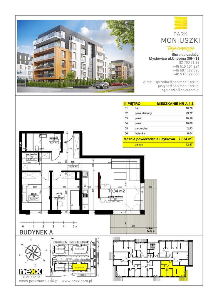 Biuro sprzedaży: Mysłowice ul.Chopina 36H/11 32 700 71 99 +48 515 104 224 +48 507 122 696 +48 537 122 868 e-mail: [email protected] [email protected] [email protected] hall 10,78 A.4.3 02 pokój dzienny 29,72 A.4.3 03 pokój 10,18 A.4.3 04 pokój 10,69 A.4.3 05 garderoba 2,93 A.4.3 06 łazienka 6,04 24 04 5,07 m2 310 łącznie 289 łazienka balkon A.4.3 24 24 600 01 10,78 m2 pokój 160 12 391 24 03 10,18 m2 40 120 70,34 m2 pokój dzienny 02 29,72 m2 1 2 3 920 4 40 190 0 40 40 *** 04 10,69 m2 404 516 ZM 277 379 12 379 282 pokój hall 12 399 5m BUDYNEK A 36 0 N 45 budynek B budynek C budynek A 315 NW 130 SE budynek D S 18 0 27 0 225 P-11 www.parkmoniuszki.pl , www.nexx.com.pl GSPublisherEngine 204.0.22.94 balkon 12,87 m2 NE SW 460 użytkowa 70,34 m2 12,87 38 125 183 183 12 12 160 03 11,68 m2 404 garderoba 05 2,93 m2 pokój powierzchnia balkon 12 P 170 170 12 12 345 187 175 06 6,04 m2 12 łazienka 44 MIESZKANIE NR A.4.3 01 P 24 24 183 III PIĘTRO A.4.3