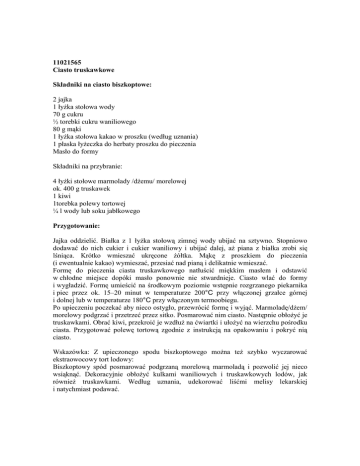 11021565 Ciasto truskawkowe Składniki na ciasto biszkoptowe: 2 jajka 1 łyżka stołowa wody 70 g cukru ½ torebki cukru waniliowego 80 g mąki 1 łyżka stołowa kakao w proszku (według uznania) 1 płaska łyżeczka do herbaty proszku do pieczenia Masło do formy Składniki na przybranie: 4 łyżki stołowe marmolady /dżemu/ morelowej ok. 400 g truskawek 1 kiwi 1torebka polewy tortowej ¼ l wody lub soku jabłkowego Przygotowanie: Jajka oddzielić. Białka z 1 łyżka stołową zimnej wody ubijać na sztywno. Stopniowo dodawać do nich cukier i cukier waniliowy i ubijać dalej, aż piana z białka zrobi się lśniąca. Krótko wmieszać ukręcone żółtka. Mąkę z proszkiem do pieczenia (i ewentualnie kakao) wymieszać, przesiać nad pianą i delikatnie wmieszać. Formę do pieczenia ciasta truskawkowego natłuścić miękkim masłem i odstawić w chłodne miejsce dopóki masło ponownie nie stwardnieje. Ciasto wlać do formy i wygładzić. Formę umieścić na środkowym poziomie wstępnie rozgrzanego piekarnika i piec przez ok. 15–20 minut w temperaturze 200°C przy włączonej grzałce górnej i dolnej lub w temperaturze 180°C przy włączonym termoobiegu. Po upieczeniu poczekać aby nieco ostygło, przewrócić formę i wyjąć. Marmoladę/dżem/ morelowy podgrzać i przetrzeć przez sitko. Posmarować nim ciasto. Następnie obłożyć je truskawkami. Obrać kiwi, przekroić je wzdłuż na ćwiartki i ułożyć na wierzchu pośrodku ciasta. Przygotować polewę tortową zgodnie z instrukcją na opakowaniu i pokryć nią ciasto. Wskazówka: Z upieczonego spodu biszkoptowego można też szybko wyczarować ekstraowocowy tort lodowy: Biszkoptowy spód posmarować podgrzaną morelową marmoladą i pozwolić jej nieco wsiąknąć. Dekoracyjnie obłożyć kulkami waniliowych i truskawkowych lodów, jak również truskawkami. Według uznania, udekorować liśćmi melisy lekarskiej i natychmiast podawać.